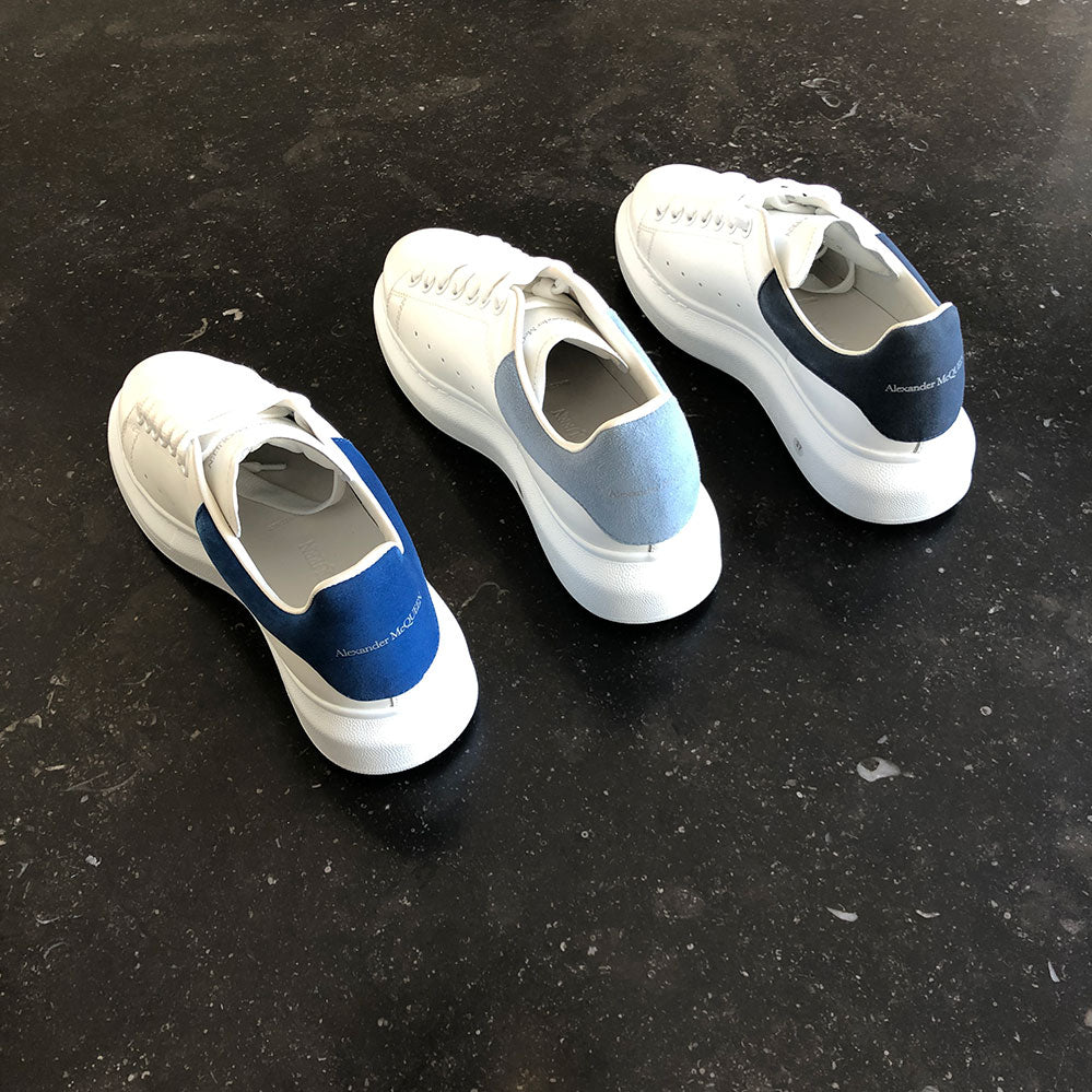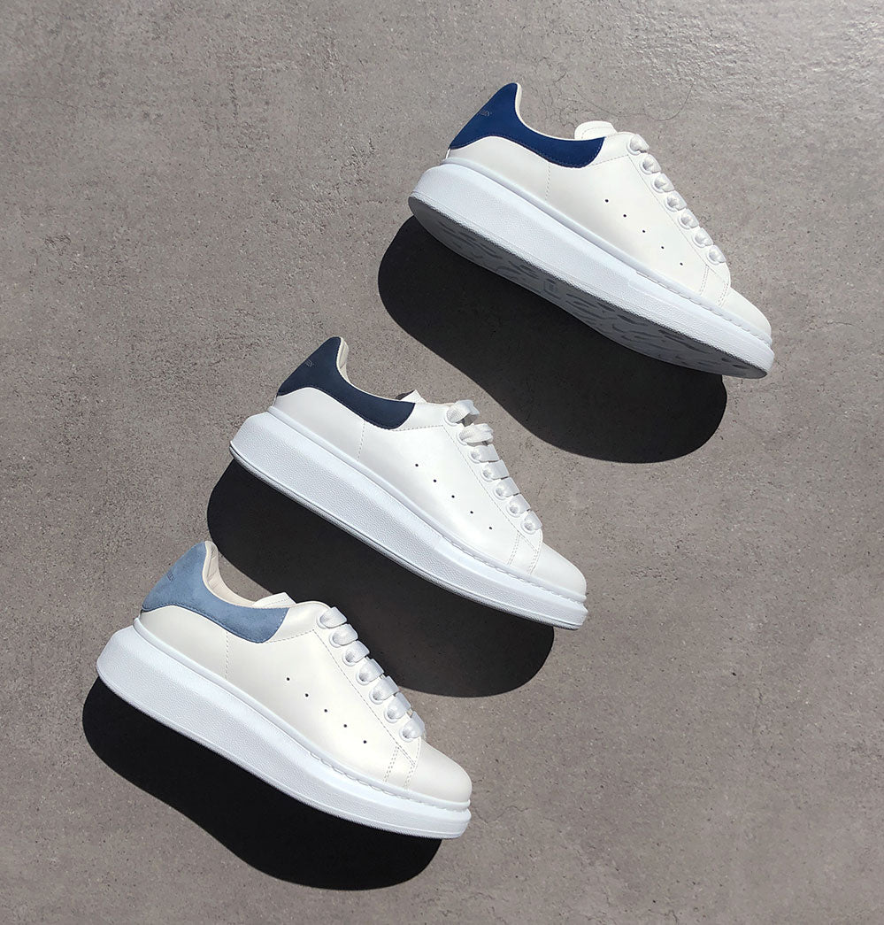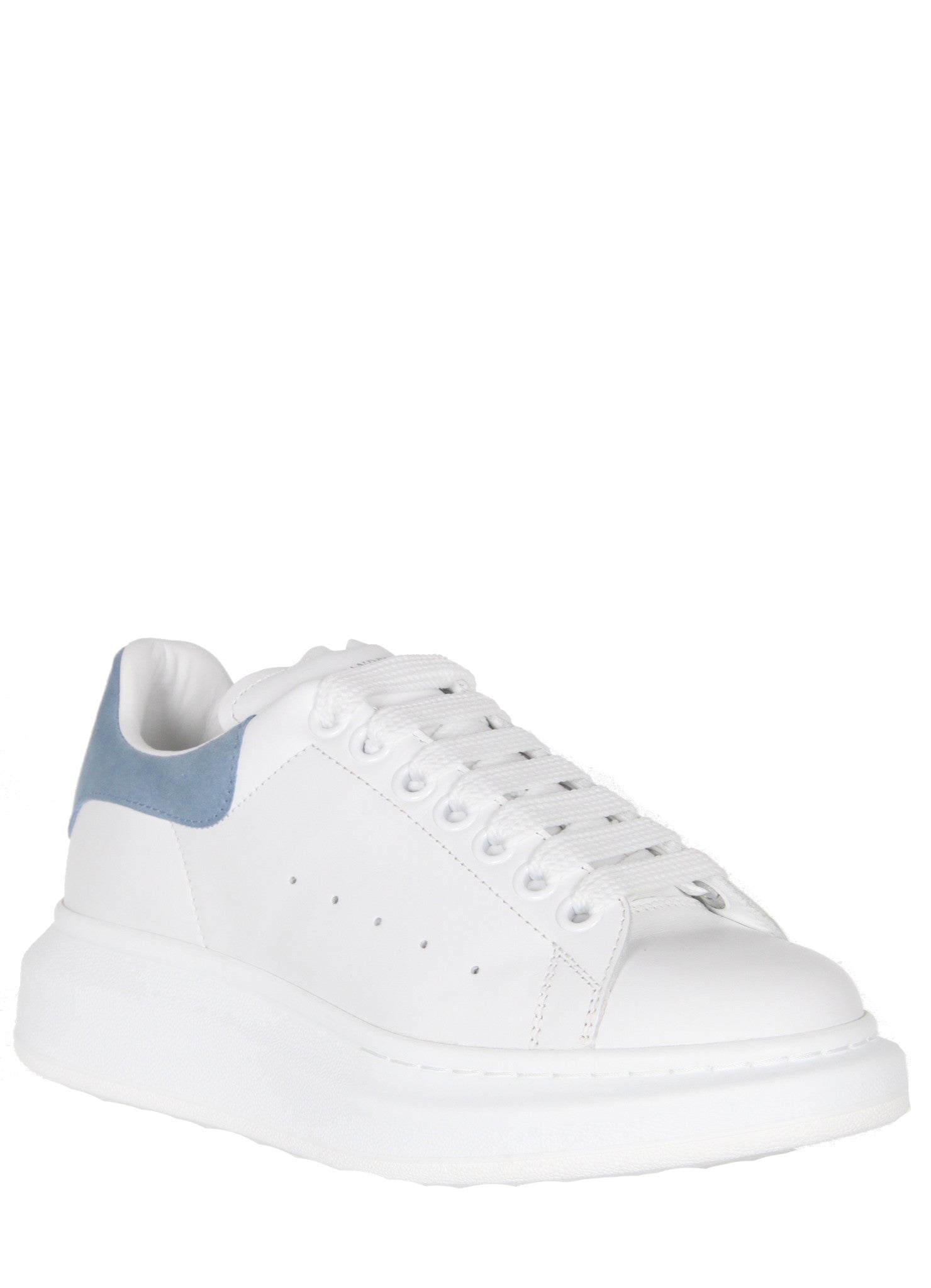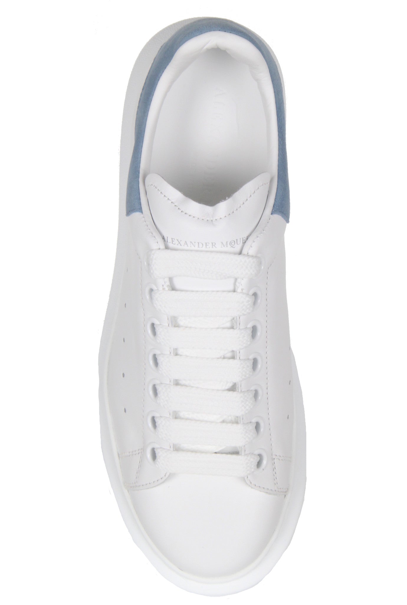 White leather paneled sneakers from Alexander McQueen featuring a round toe, a lace-up front fastening, a brand embossed tongue, a brand embossed insole and a white rubber exaggerated-sole.