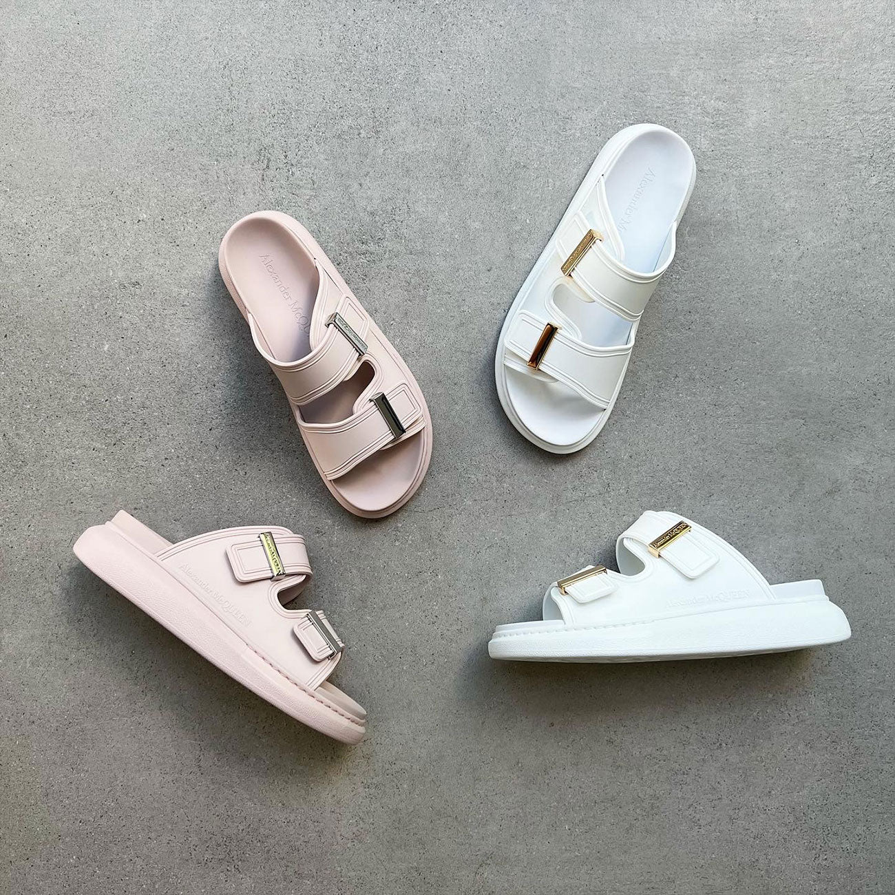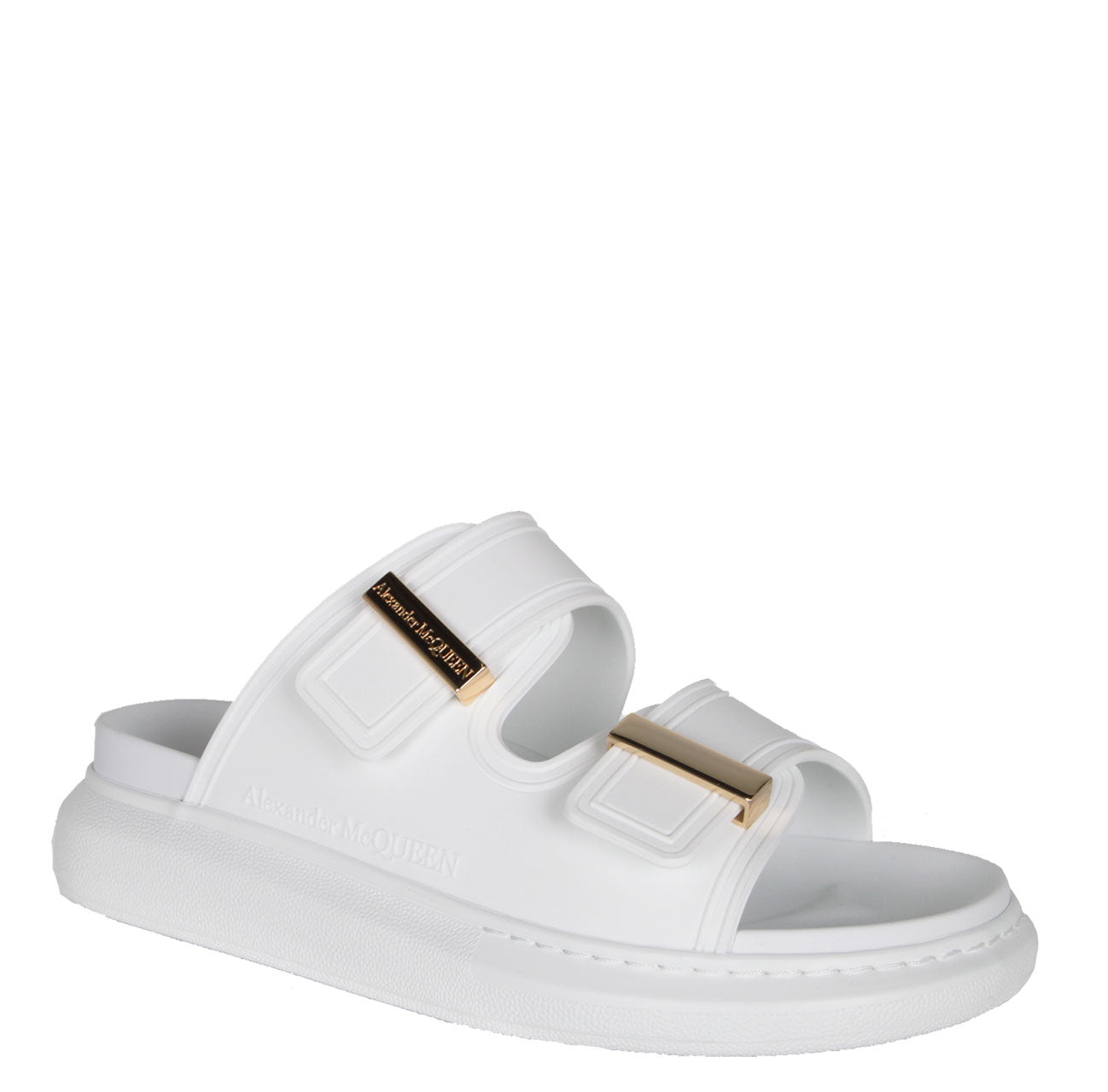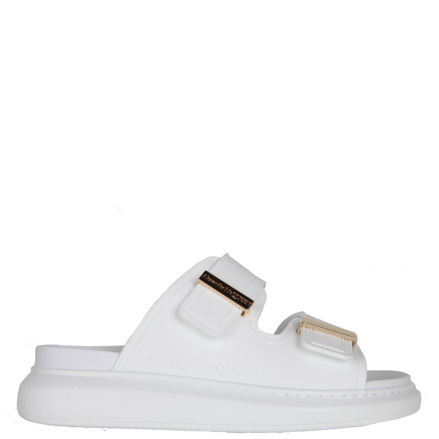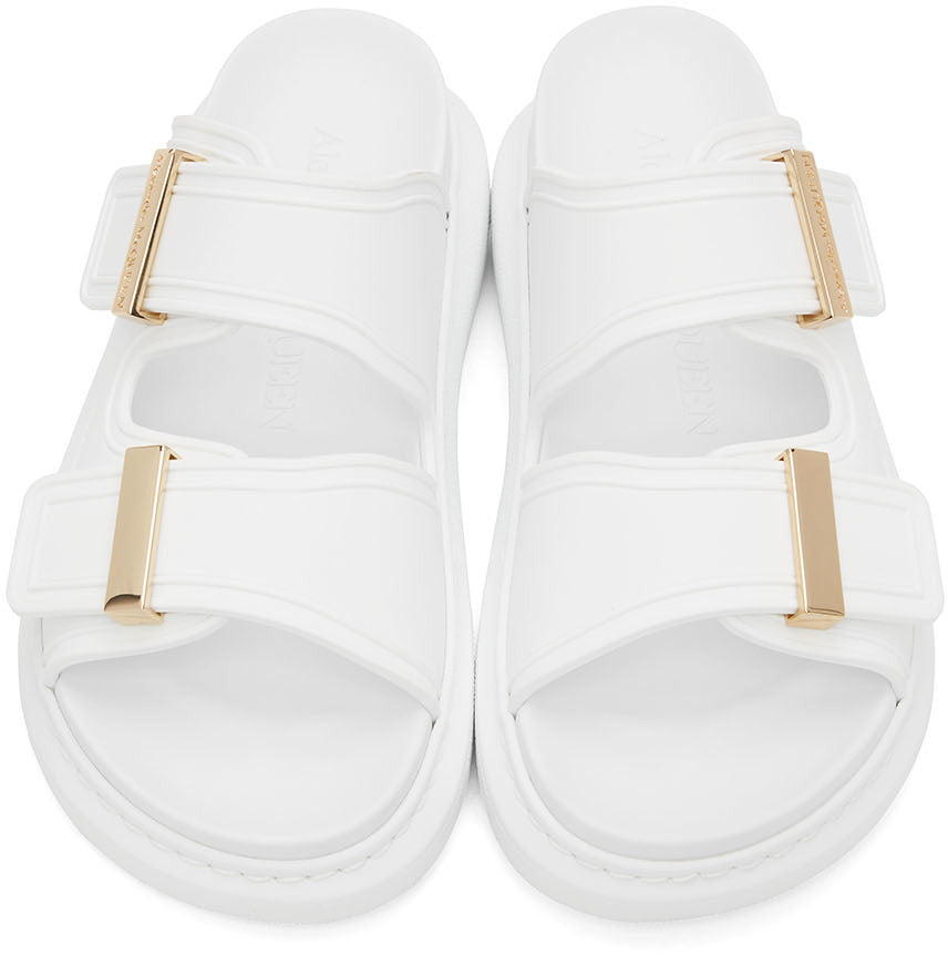 Black rubber slide featuring signature Alexander McQueen exaggerated rubber soles, with gold hardware. A hybrid of a sneaker and a slide, these features a round toe silhouette with a metal hardware bar slide and engraved with signature Alexander McQueen.