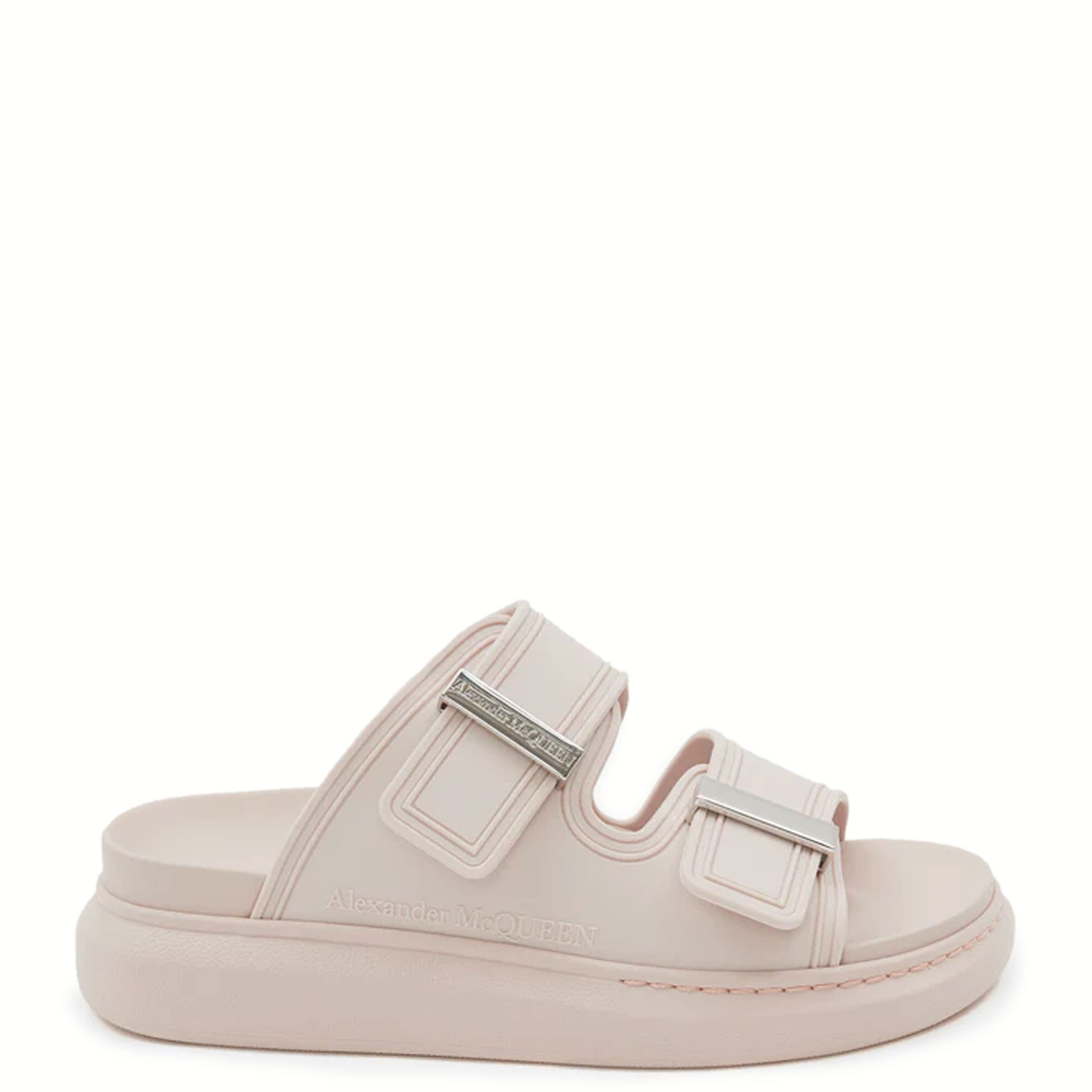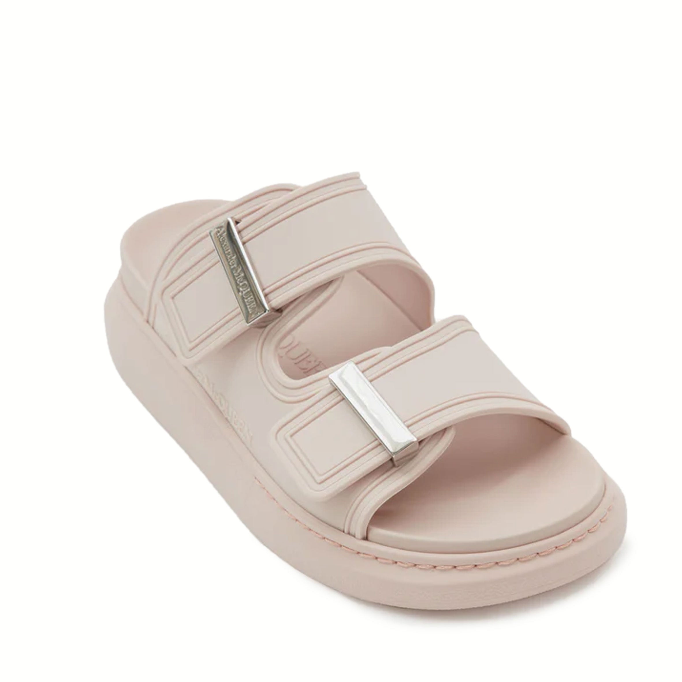 Rose rubber slide featuring signature Alexander McQueen in high relief, silver hardware and an oversized rubber sole. The slide features a round toe silhouette with a metal hardware bar slide and engraved with signature Alexander McQueen.