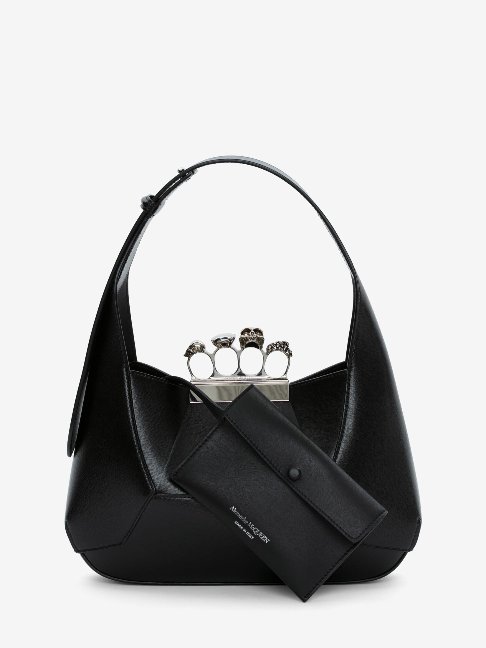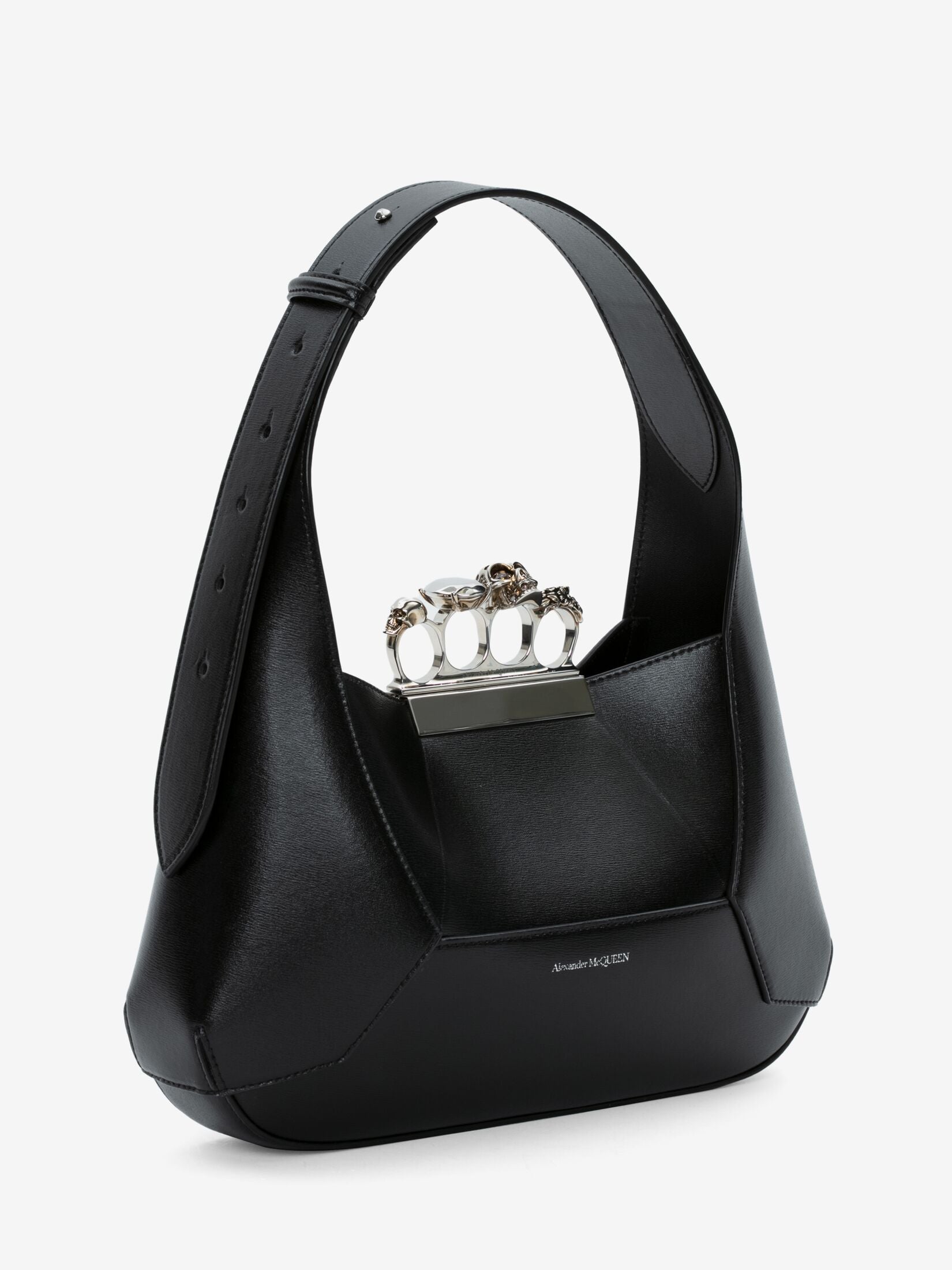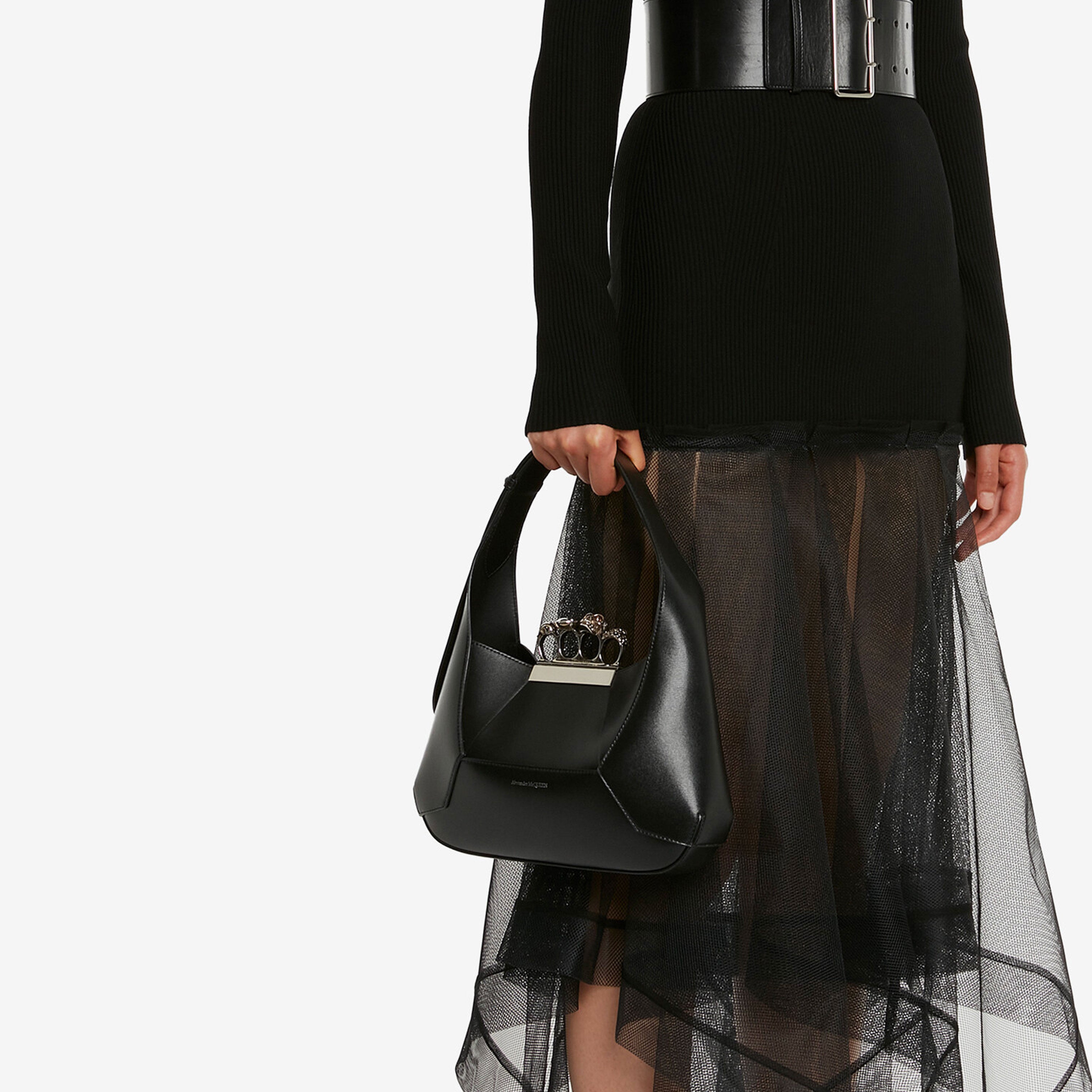 Black smooth calfskin leather Jewelled Hobo bag featuring an antique gold-finished handle adorned with Swarovski-encrusted rings. The unique silhouette of the Jewelled Hobo bag is inspired by the faceted stone that sits on the Skull Four Ring, and features leather panels that are cut and re-assembled together. This bag can be worn either hand-held or over the shoulder.