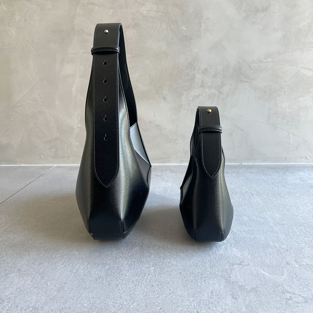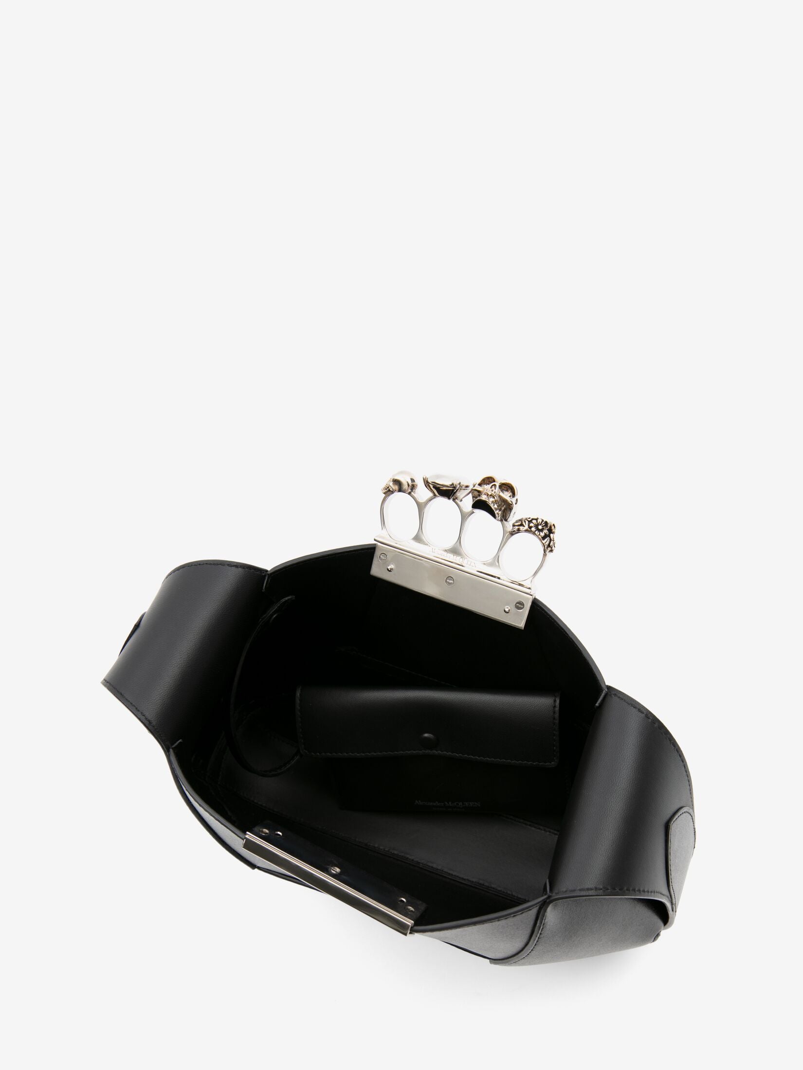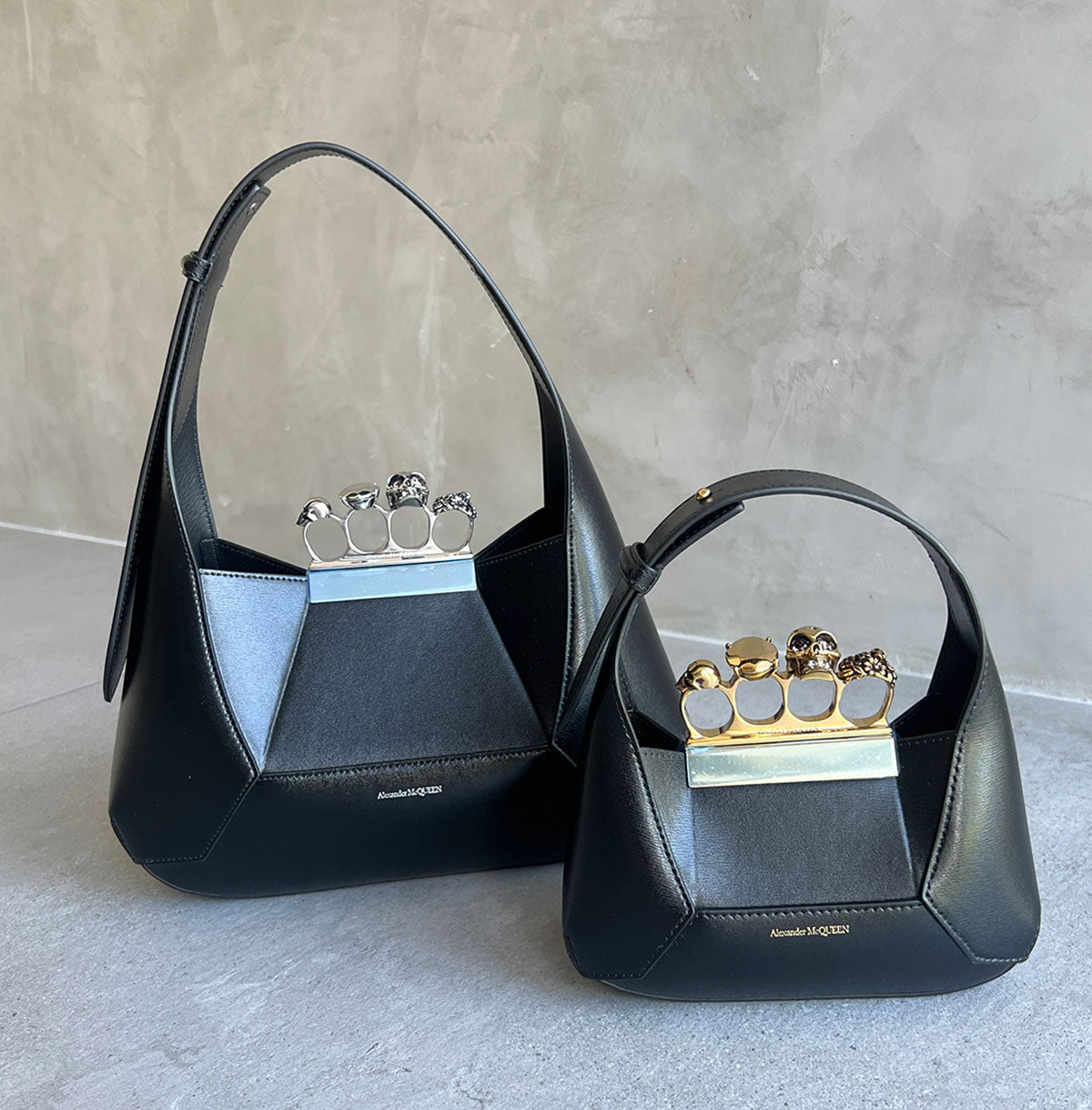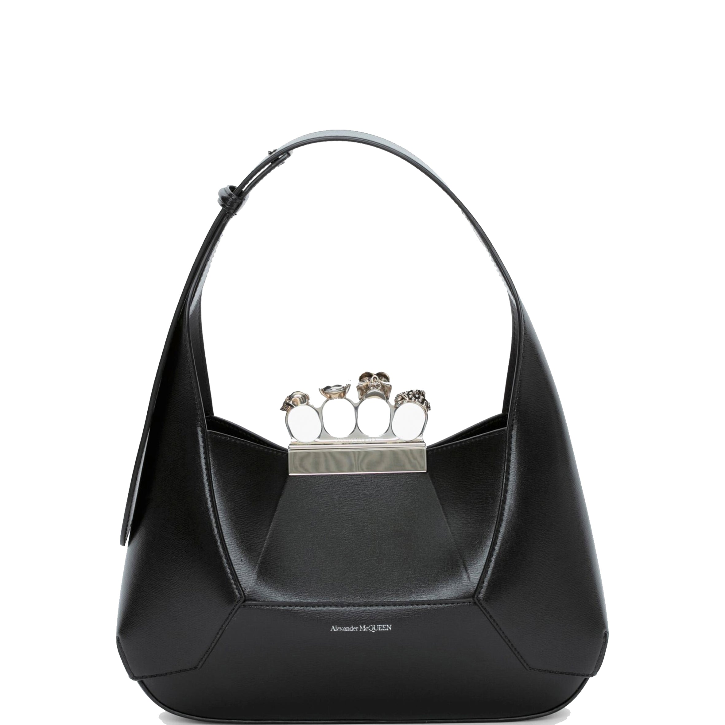 Black smooth calfskin leather Jewelled Hobo bag featuring an antique gold-finished handle adorned with Swarovski-encrusted rings. The unique silhouette of the Jewelled Hobo bag is inspired by the faceted stone that sits on the Skull Four Ring, and features leather panels that are cut and re-assembled together. This bag can be worn either hand-held or over the shoulder.