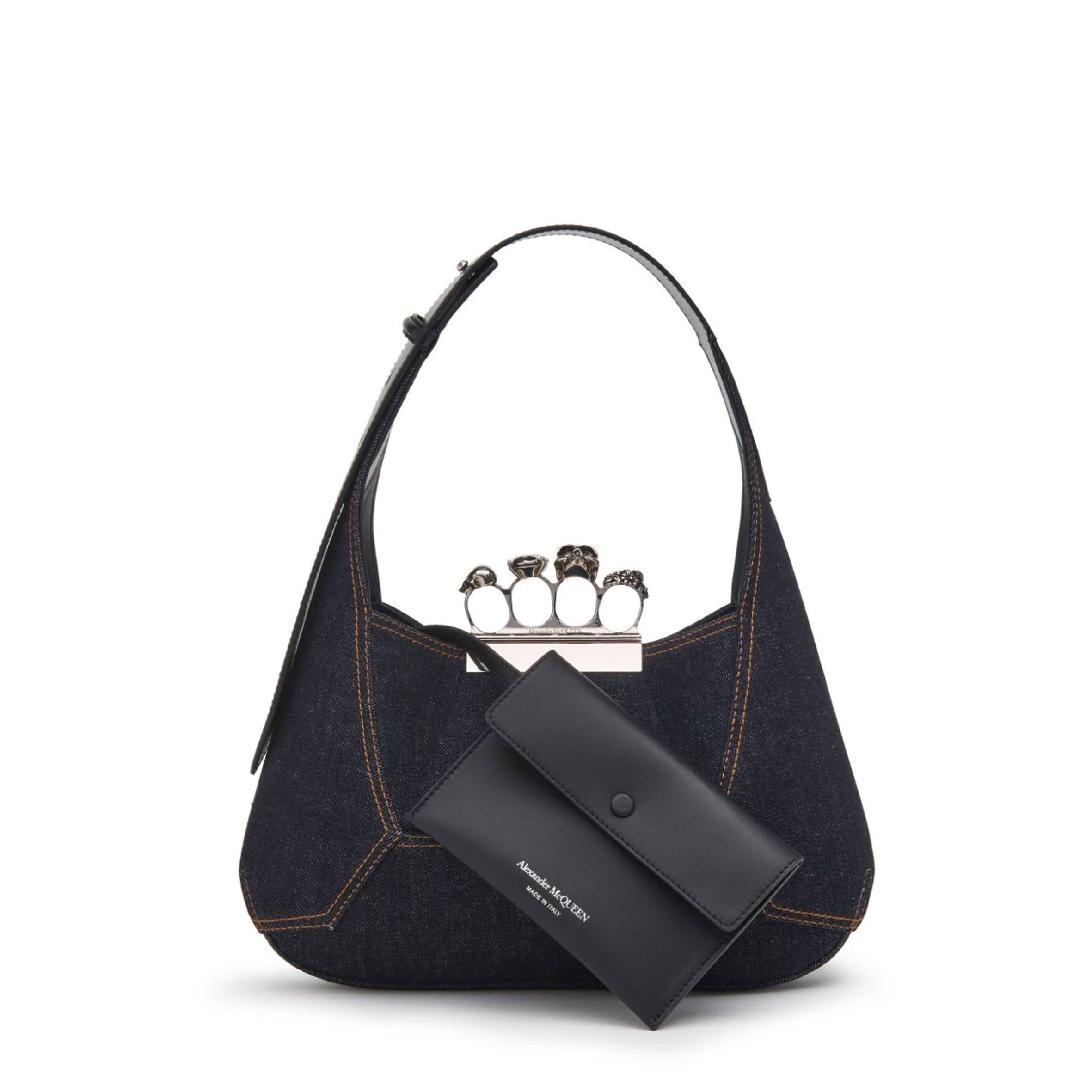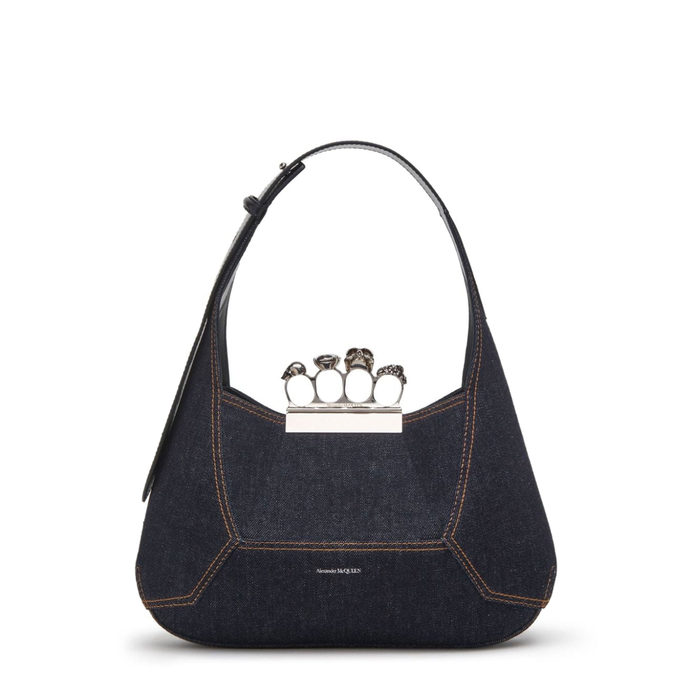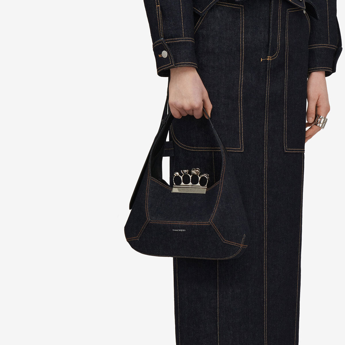 Blue denim Jewelled Hobo with contrasted colour stitching, featuring an antique silver-finished handle adorned with Swarovski-encrusted rings. The unique silhouette of the Jewelled Hobo is inspired by the faceted stone that sits on the Knuckle, and features panels that are cut and re-assembled together. This bag can be worn either hand-held or over the shoulder.