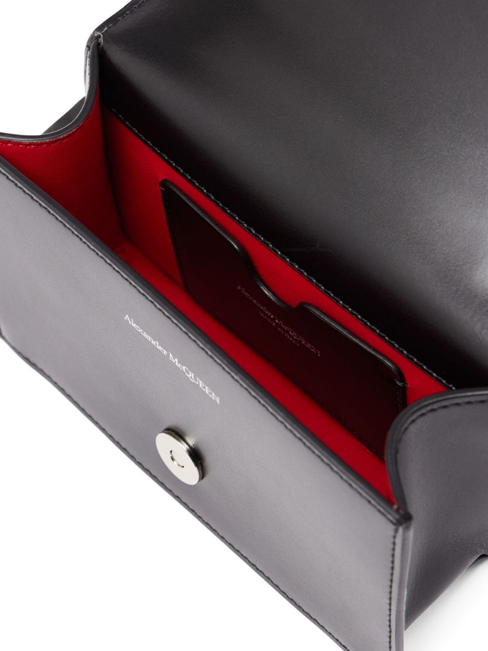 Alexander McQueen's 'Jewelled Satchel' features shiny black calfskin and is topped with a signature knuckleduster that's embellished with the label's iconic swarovski crystal-encrusted skulls and features a wide biker-inspired leather strap. This bag can be worn in multiple ways, carried by hand using the ring handle, over the shoulder or cross body using the long leather strap. The inside contains one main black suede lined compartment with one flat card slot. Can accomodate a smartphone.