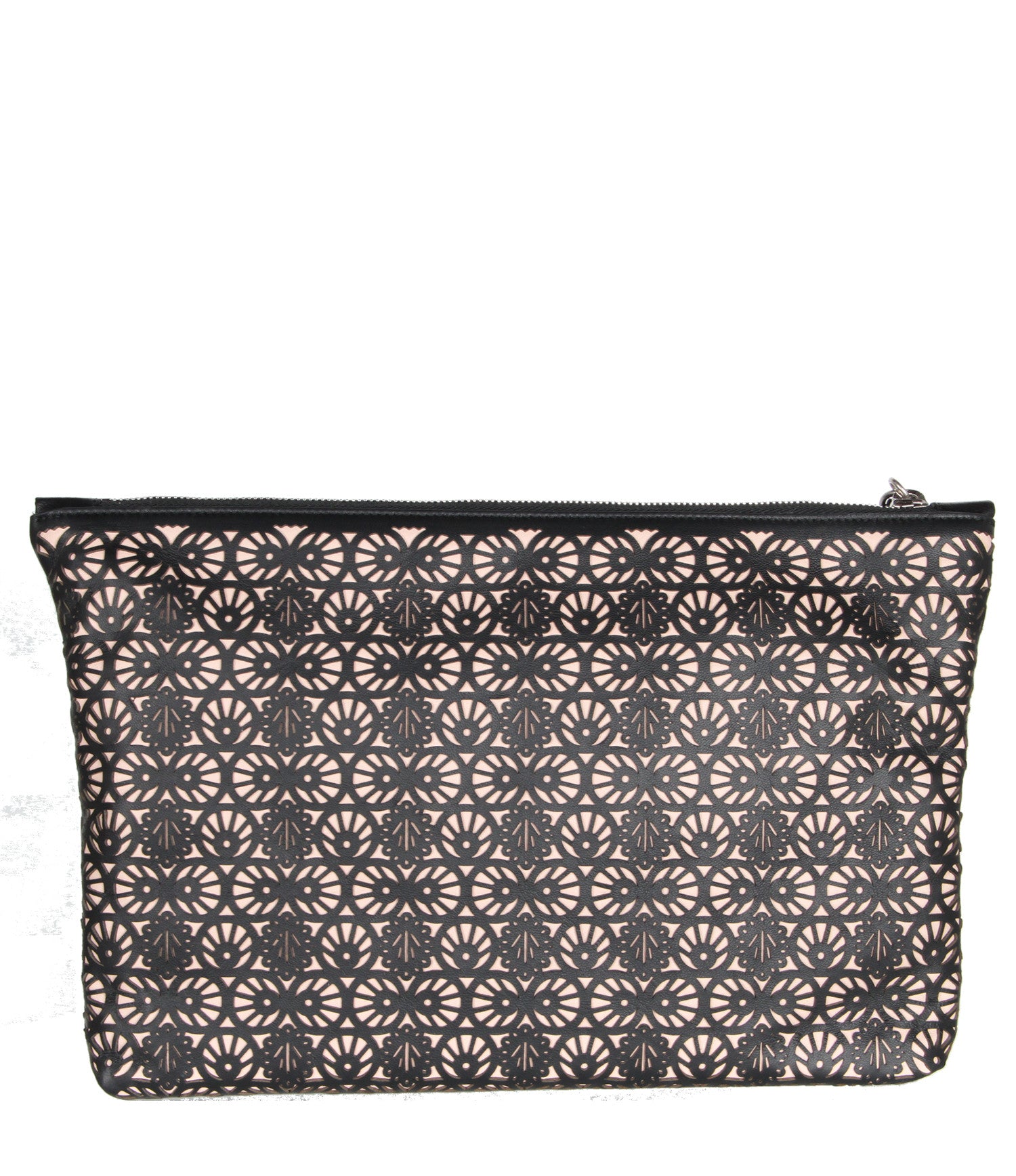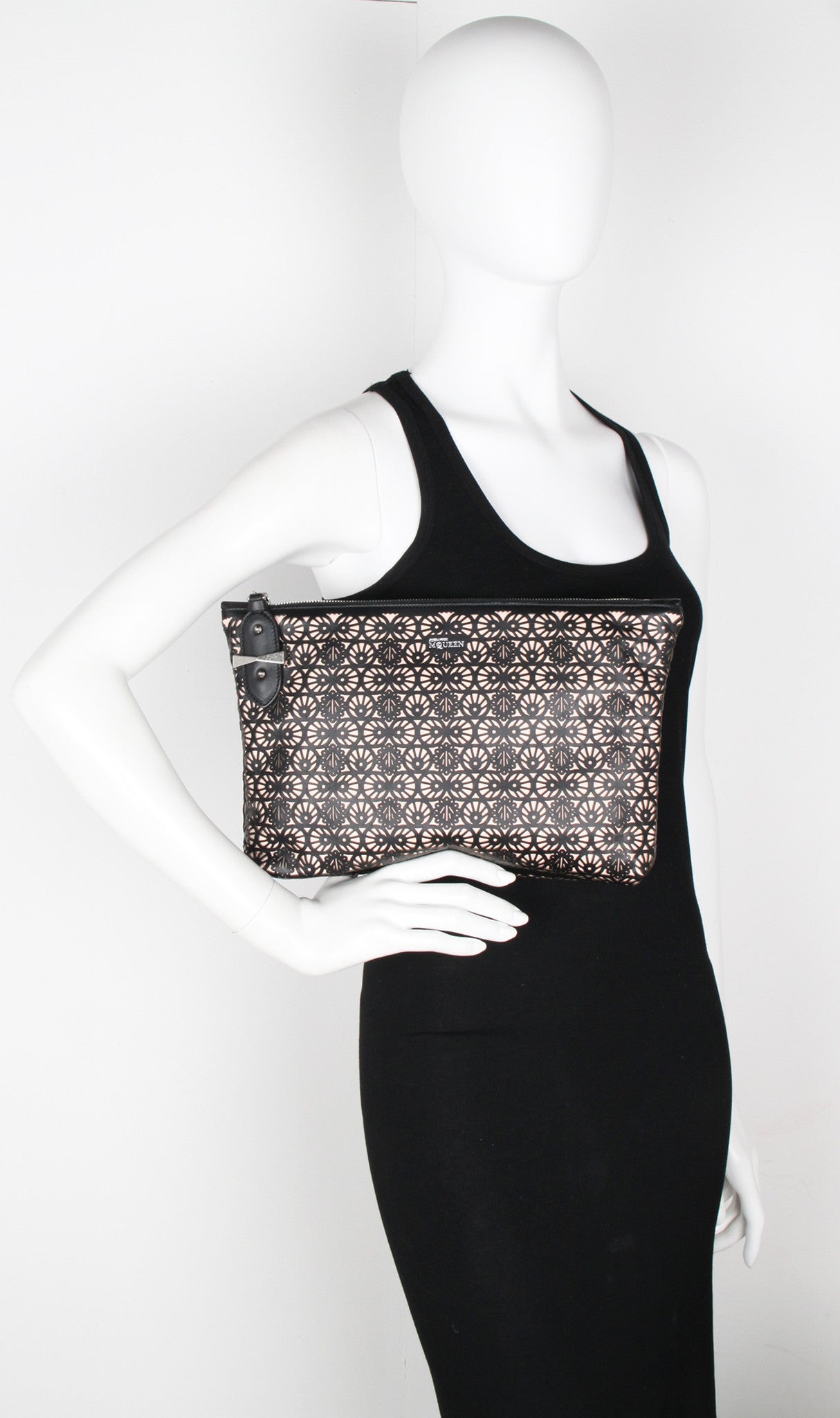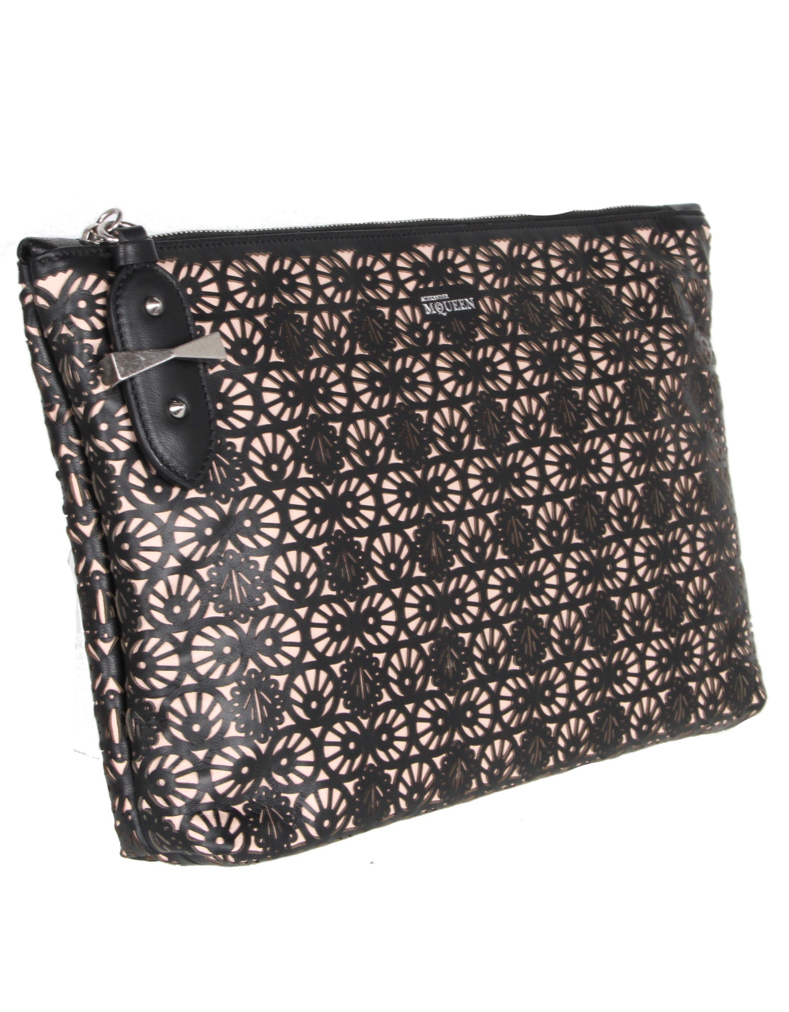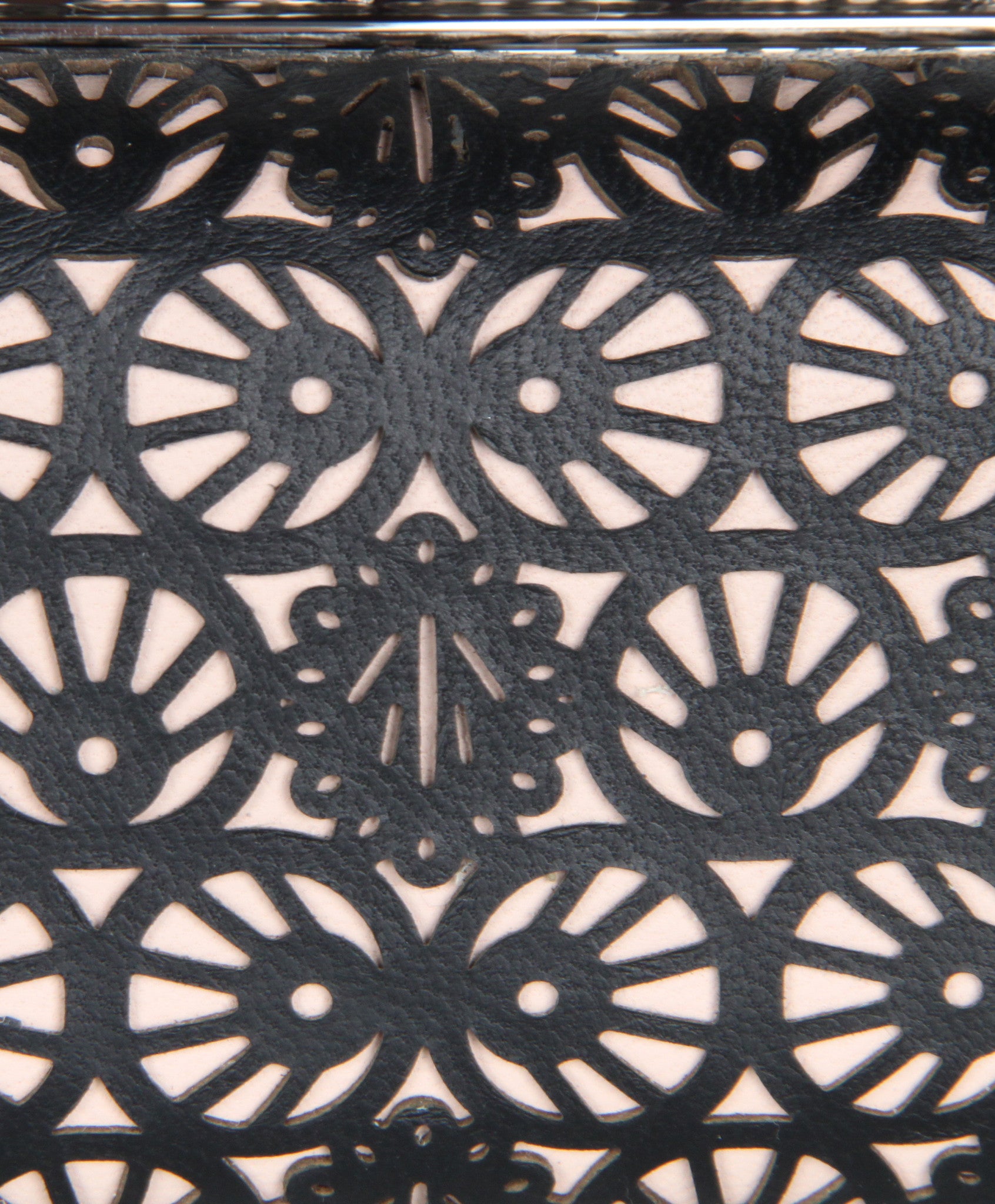 Legend Pouch, Laser Cut-out. Black and beige leather knucklebox clutch with laser overlay detail and antique-finish hardware.