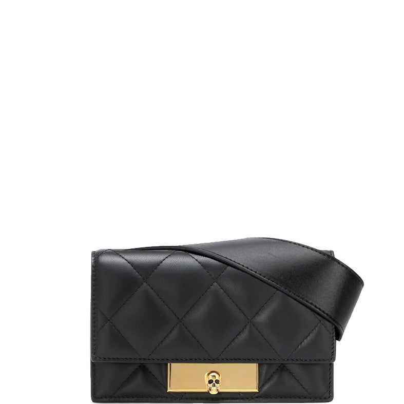 The quilted McQueen Lock belt bag comes with a detachable adjustable belt strap with buckle closure. It has a front flap with clasp closure and skull detail. An internal card slot and contrasting colour leather lining.