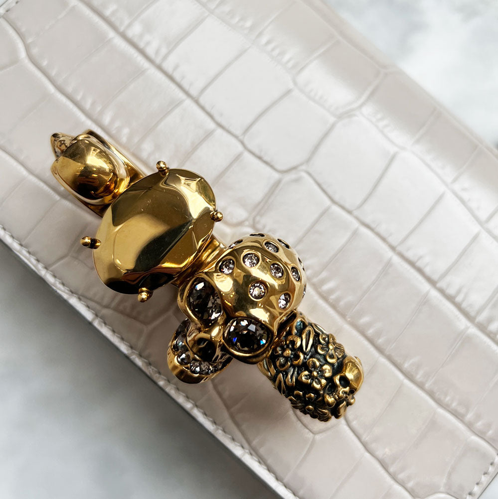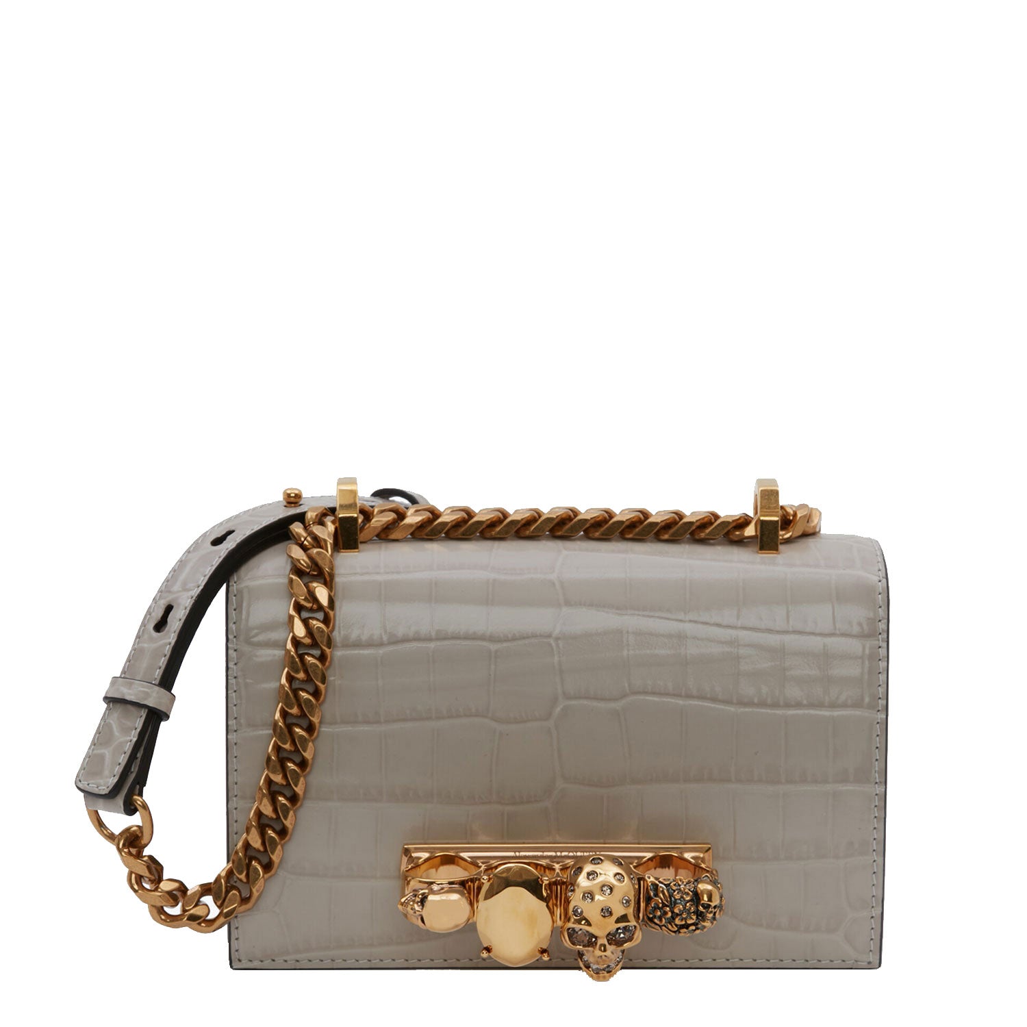 Shiny faded grey embossed croc calfskin leather Mini Jewelled Satchel. This bag can be worn in multiple ways: carry it in your hand using the ring handle or by doubling up the strap. Alternatively, wear over the shoulder or across the body using the leather and chain strap.