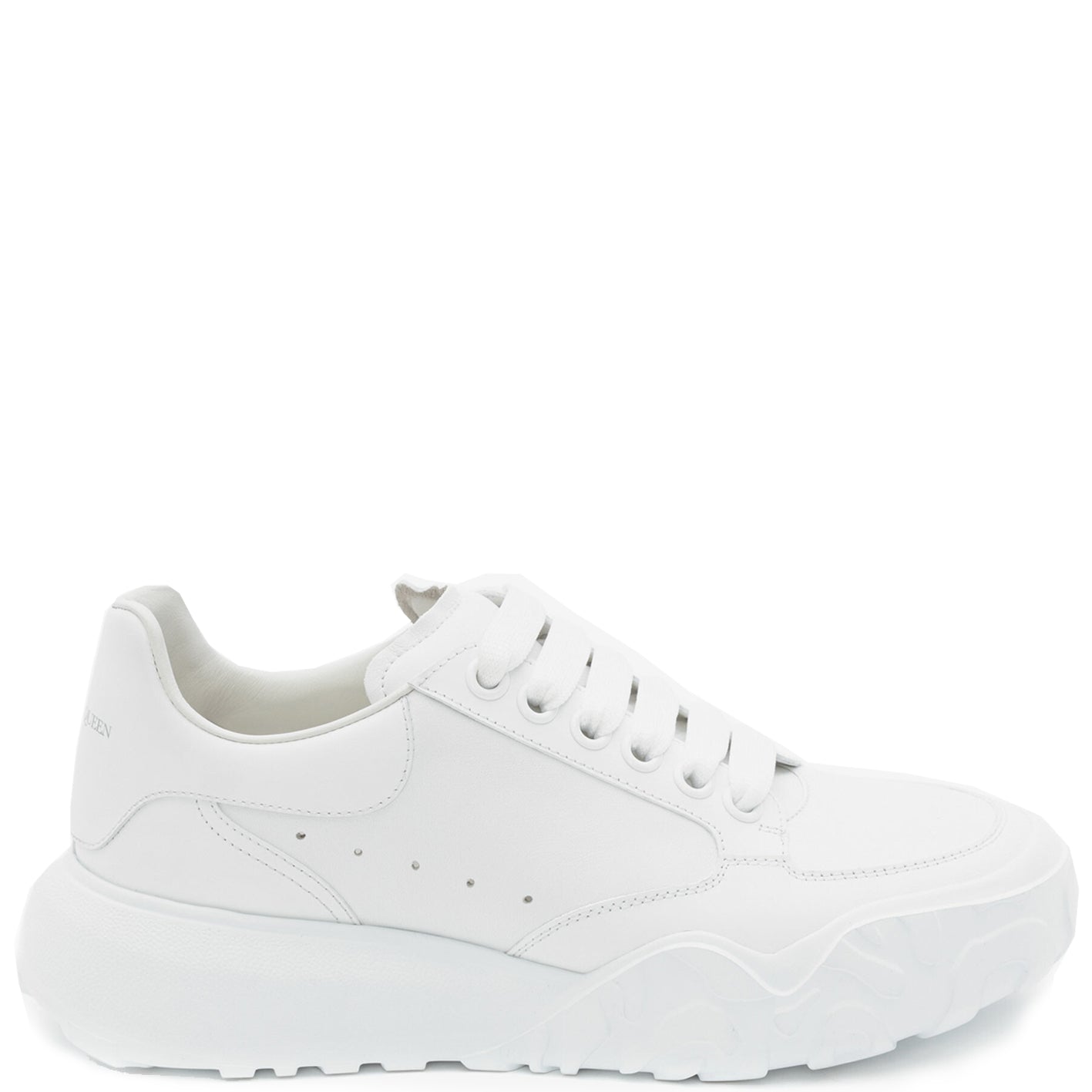 The sneaker features large flat laces and finished with an Alexander McQueen signature on the heel counter. Over-sized clear sole with signature stamp design.