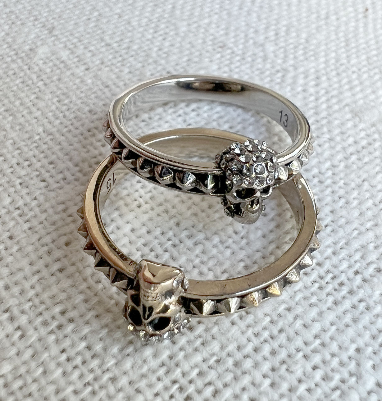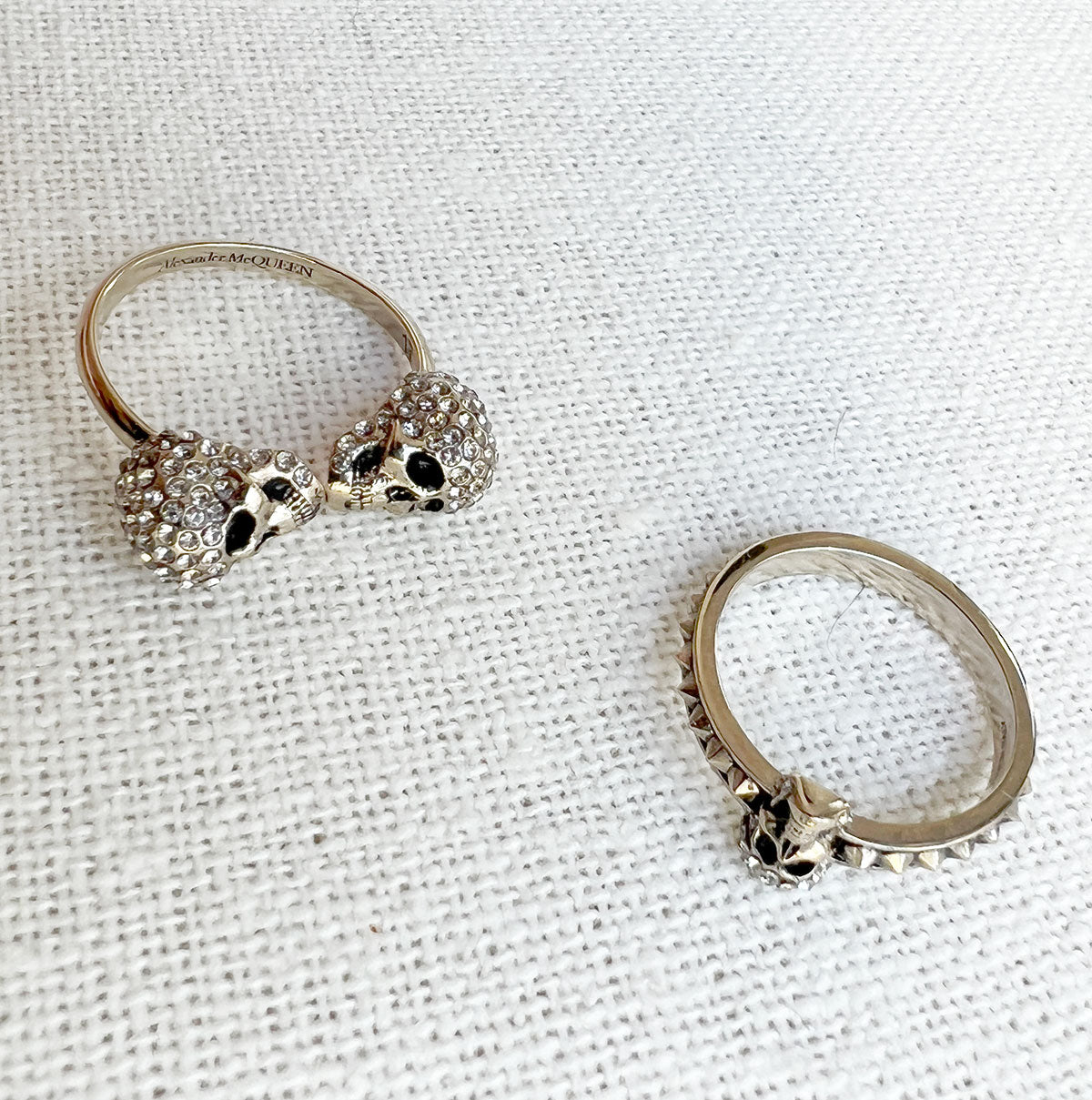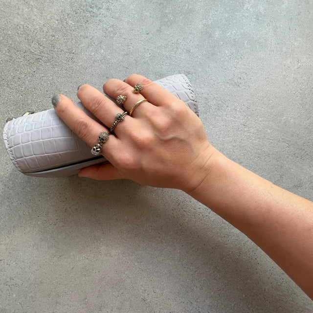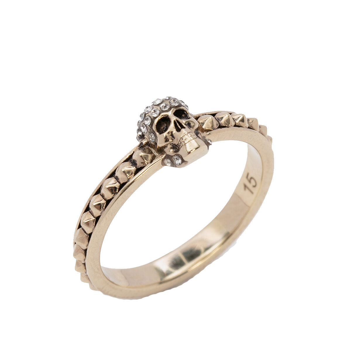 Pale gold-finished skull ring embellished with Swarovski crystals. Brass hardware.