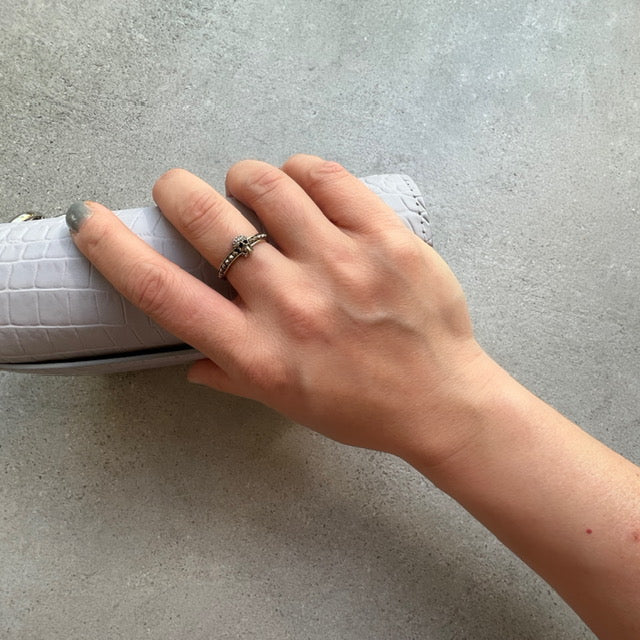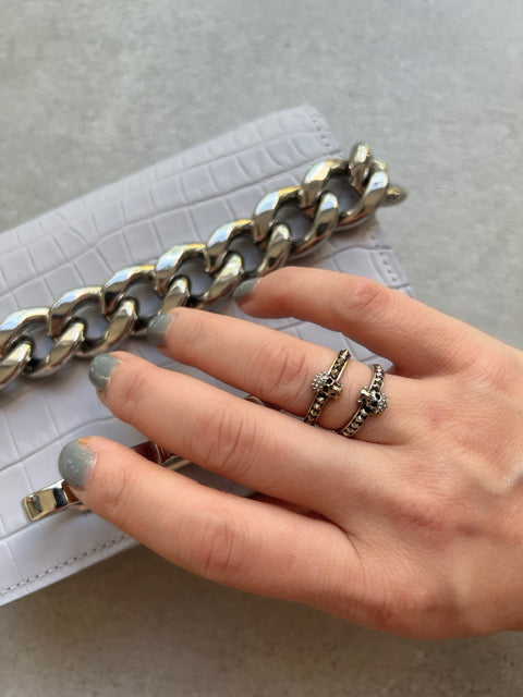 Silver-finished skull ring embellished with Swarovski crystals. Brass hardware.