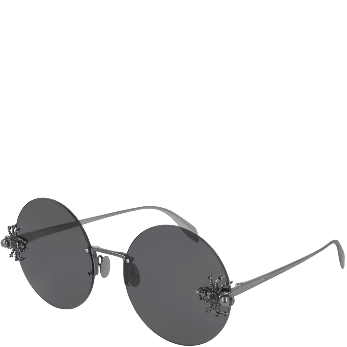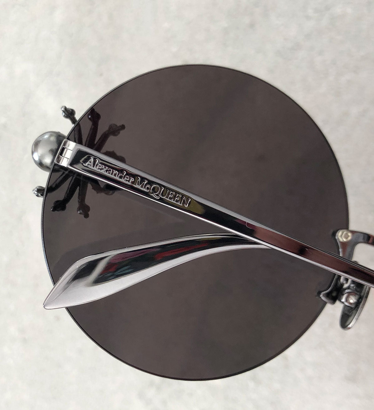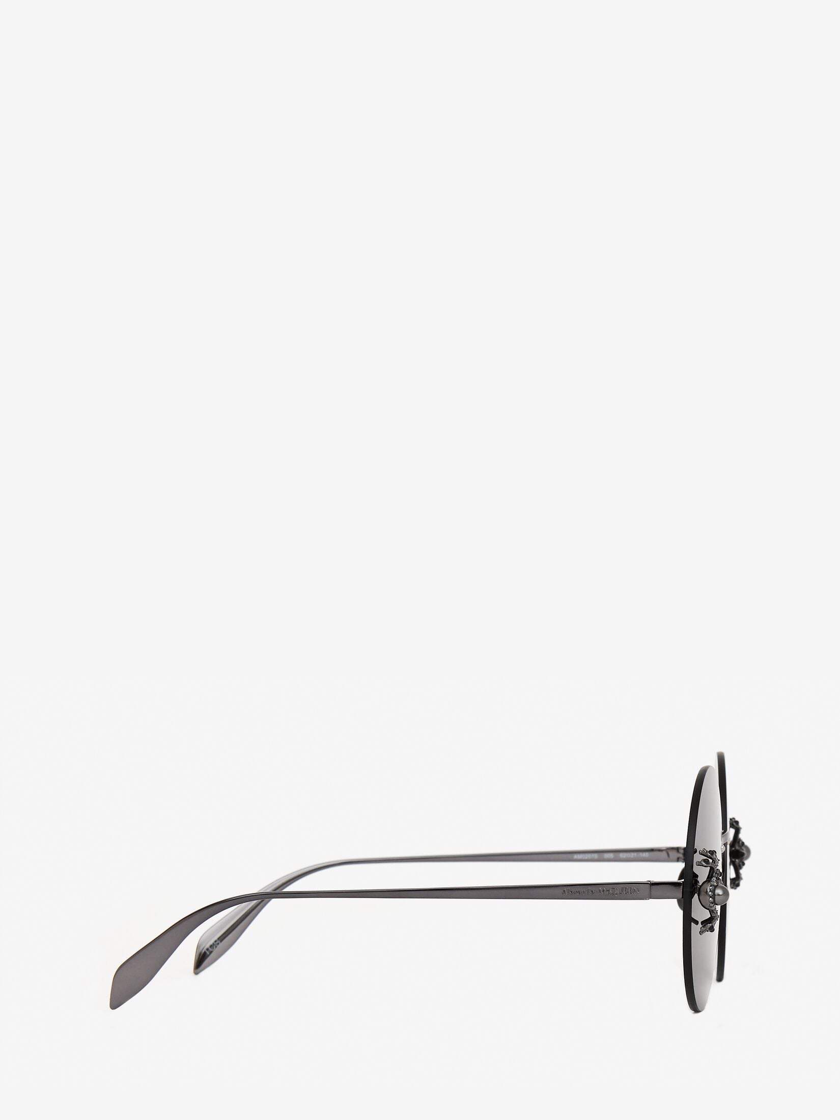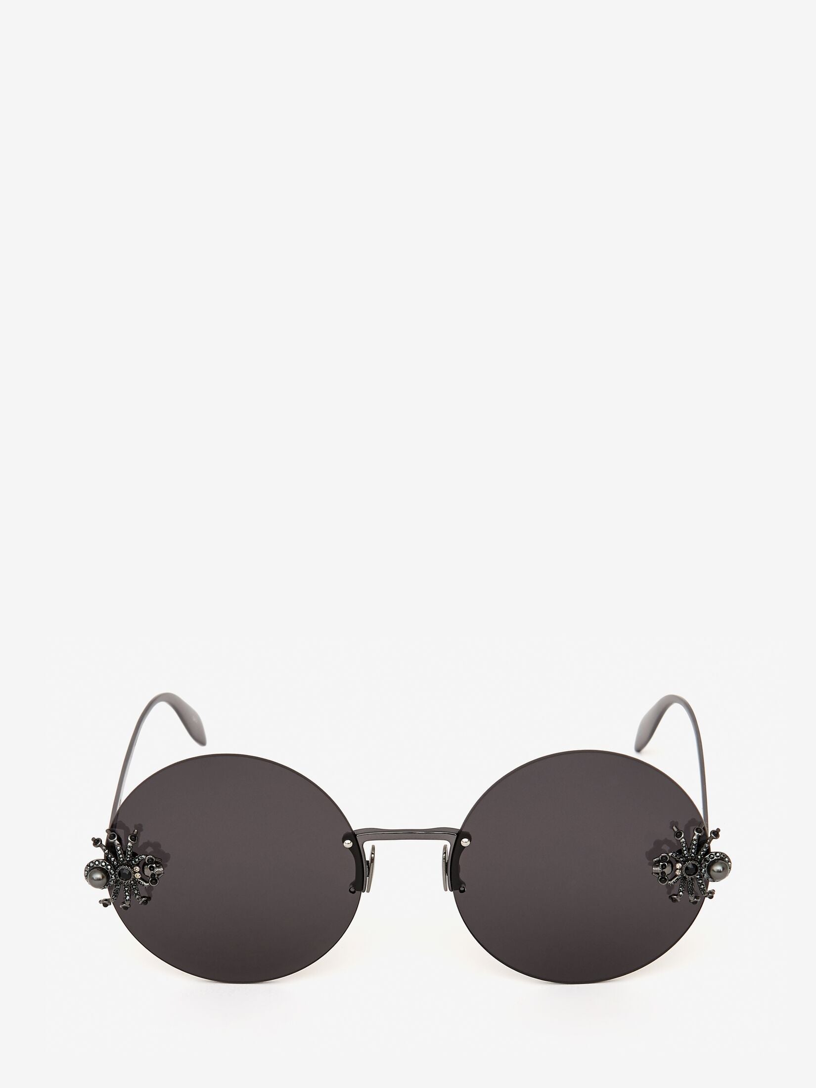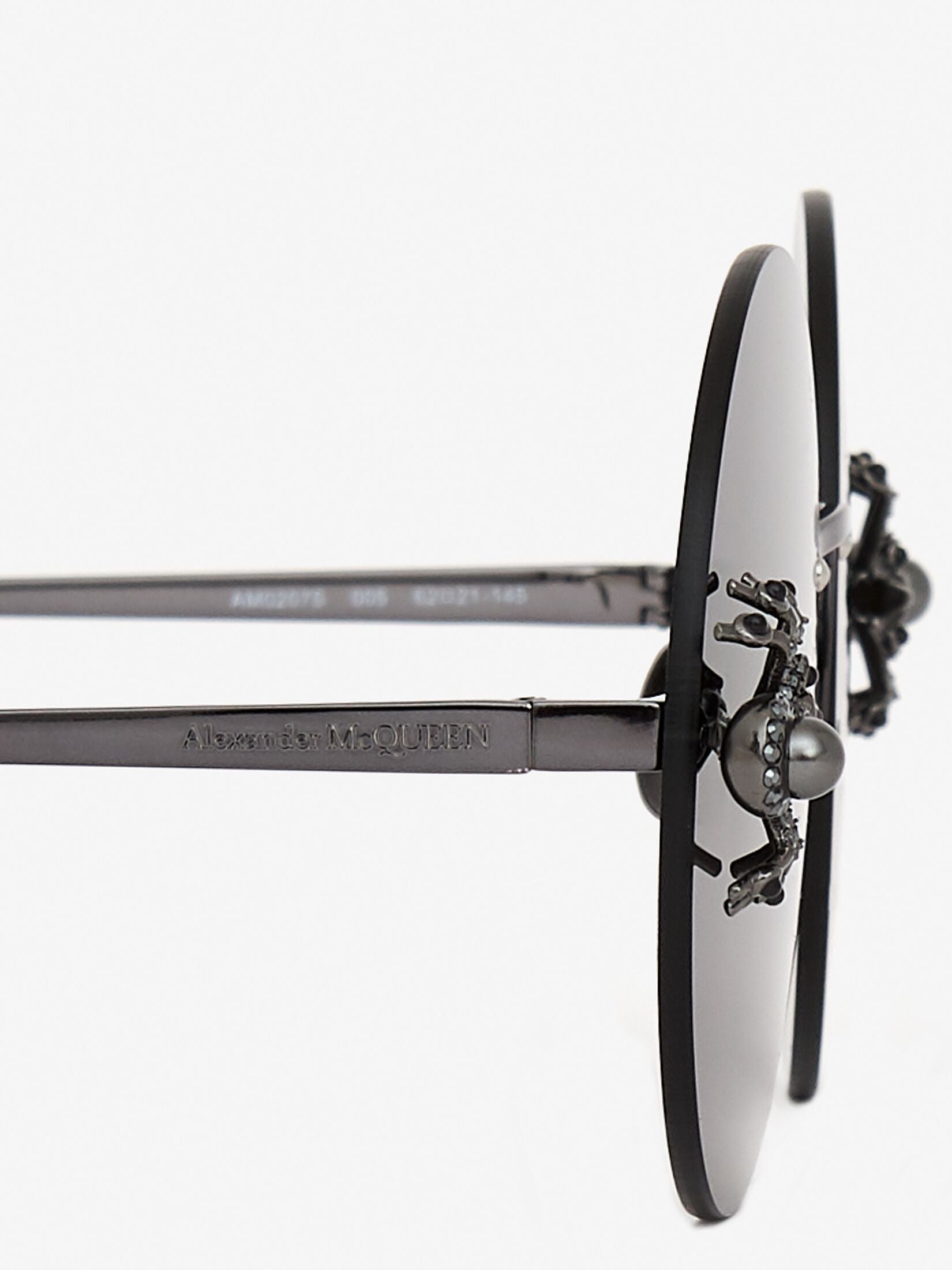 Round rimless sunglasses are fitted with grey lenses and embellished with a crystal-encrusted spider. The frame is fitted with dark ruthenium-finished temples lasered with a tonal Alexander McQueen logo.