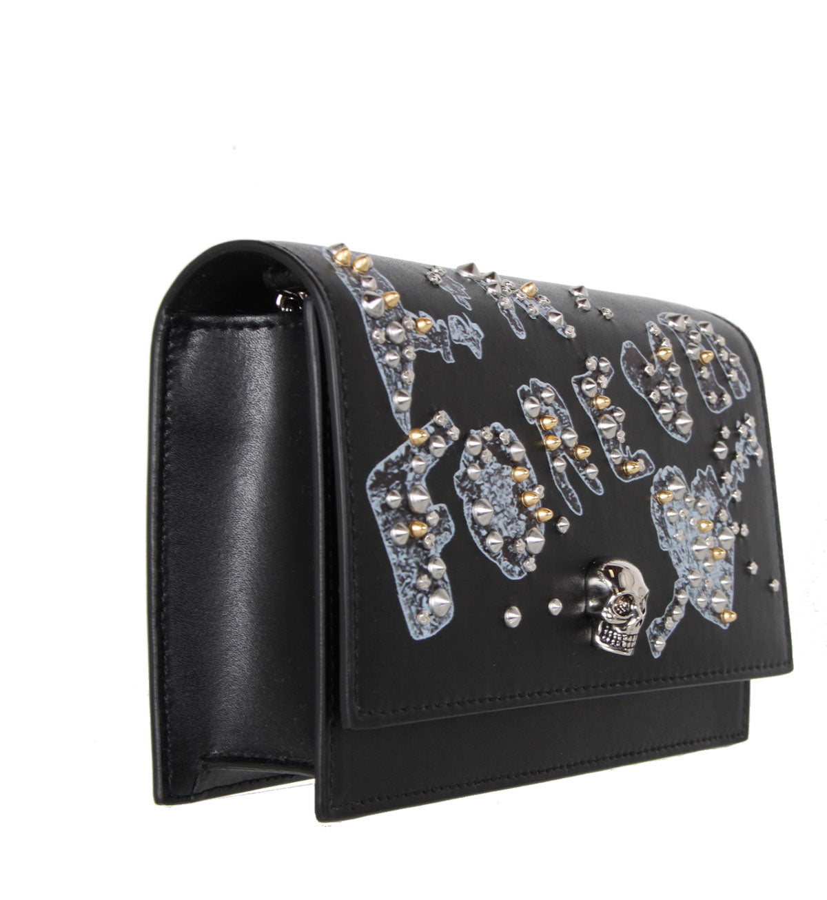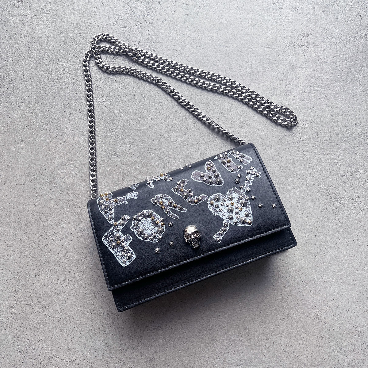 Alexander McQueen lamb leather Mini Skull Bag, detailed with a silver-finished skull and crystal forever AMQ embellishments. Features a snap button fastening, one central compartment and one card pocket. Silver finished chain strap. Accommodates smartphones