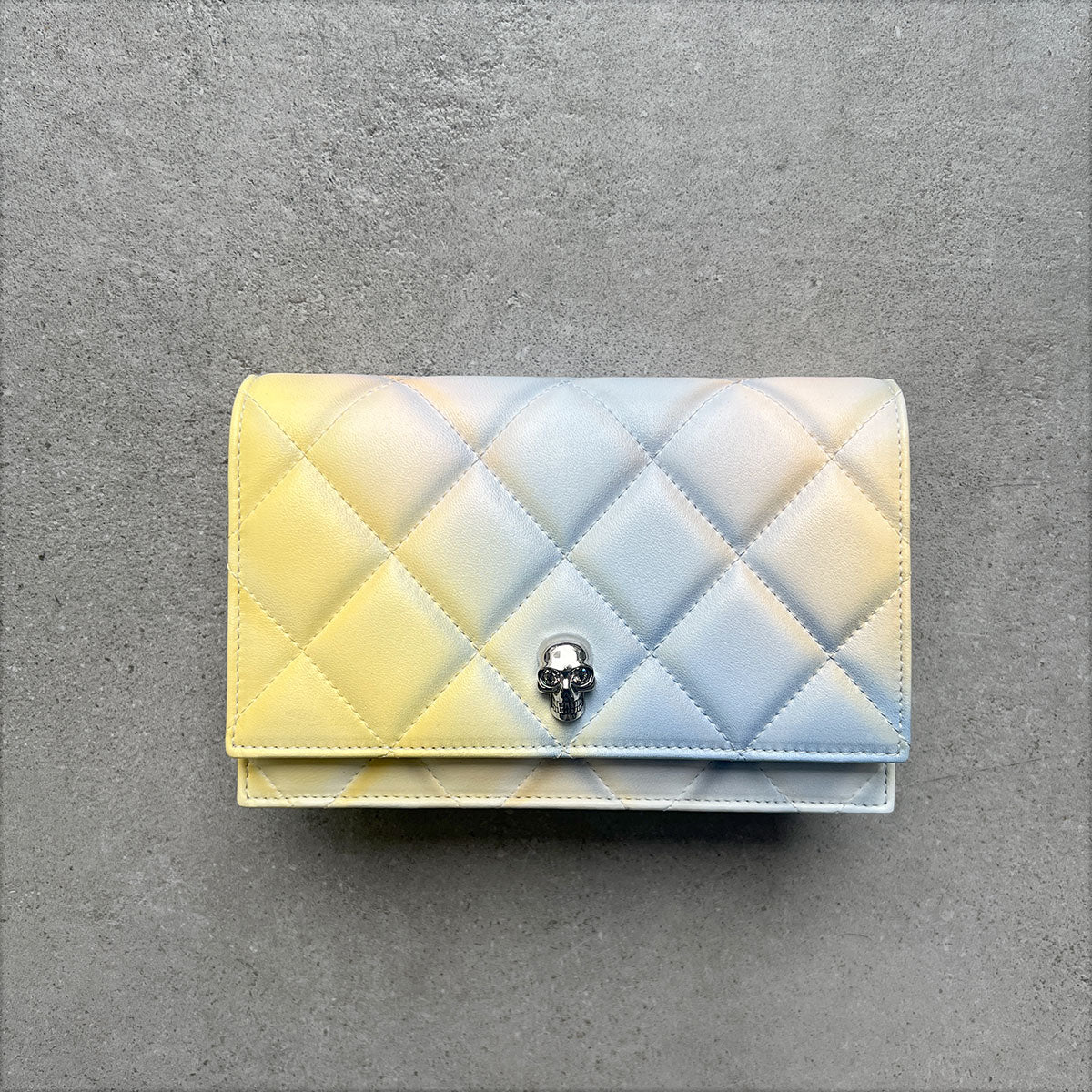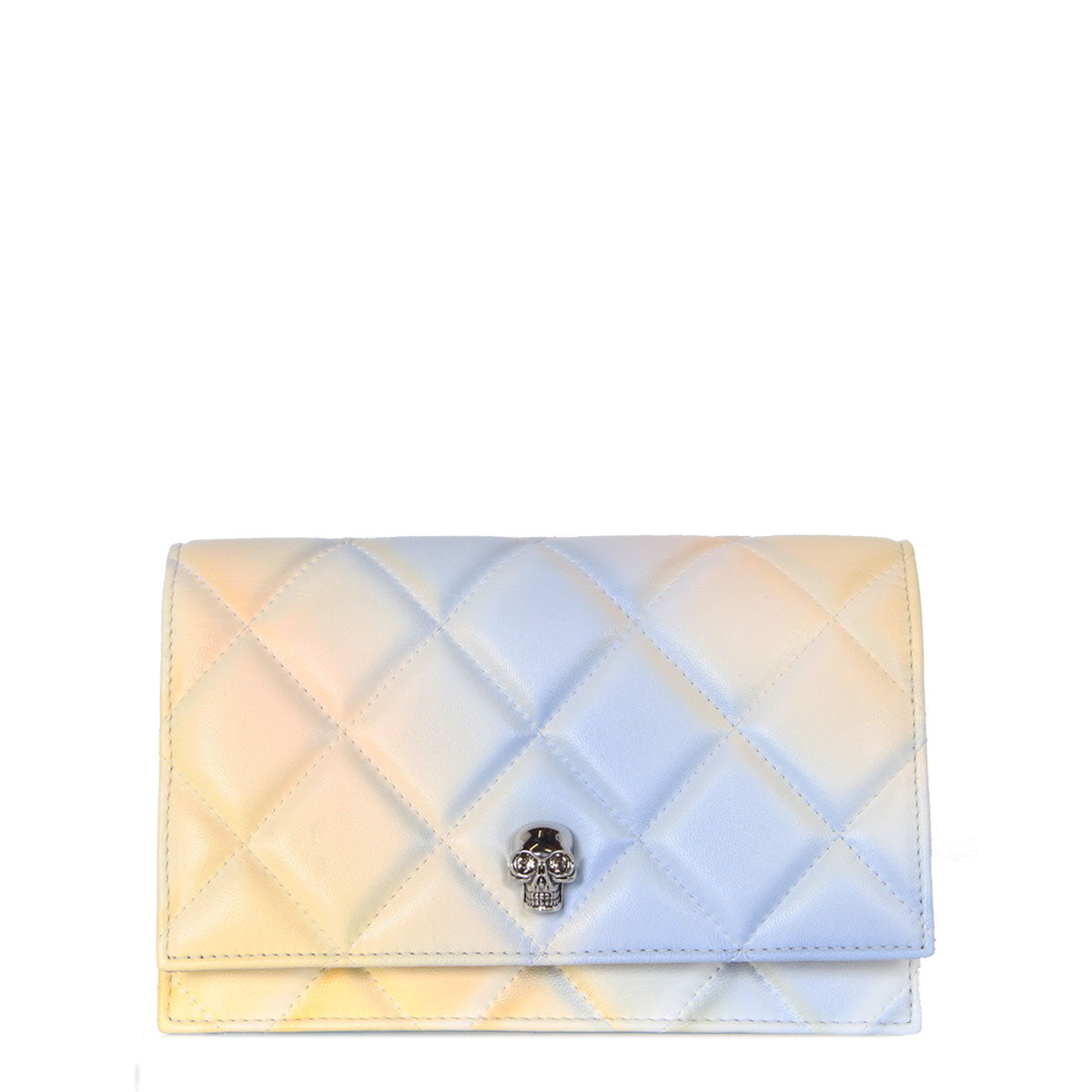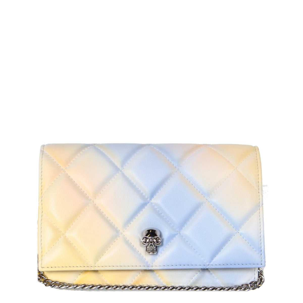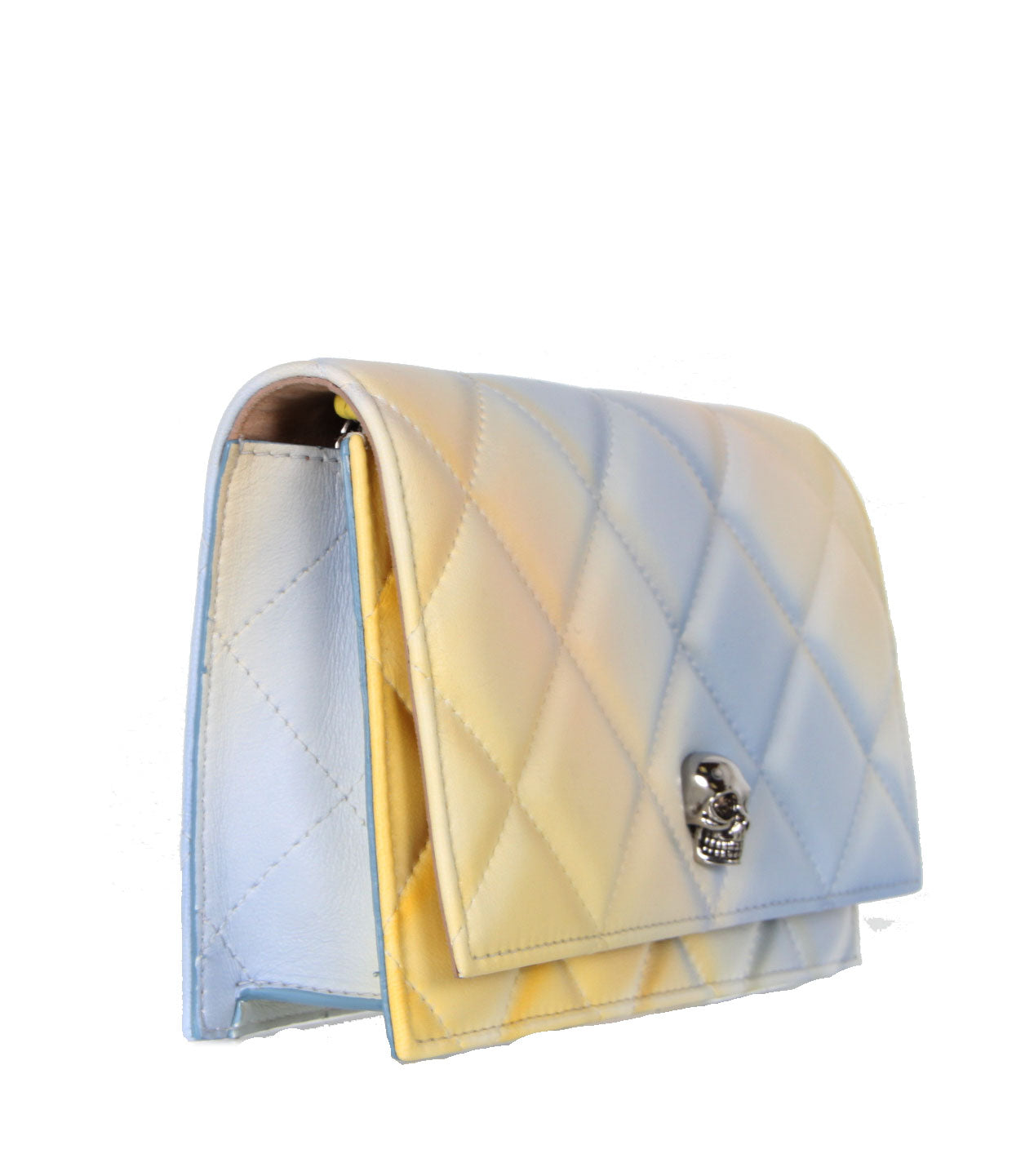Alexander McQueen tie dye calf leather Mini Skull Bag, detailed with a silver-finished skull. Features a snap button fastening, one central compartment and one card pocket. Silver finished chain strap. Accommodates smartphones
