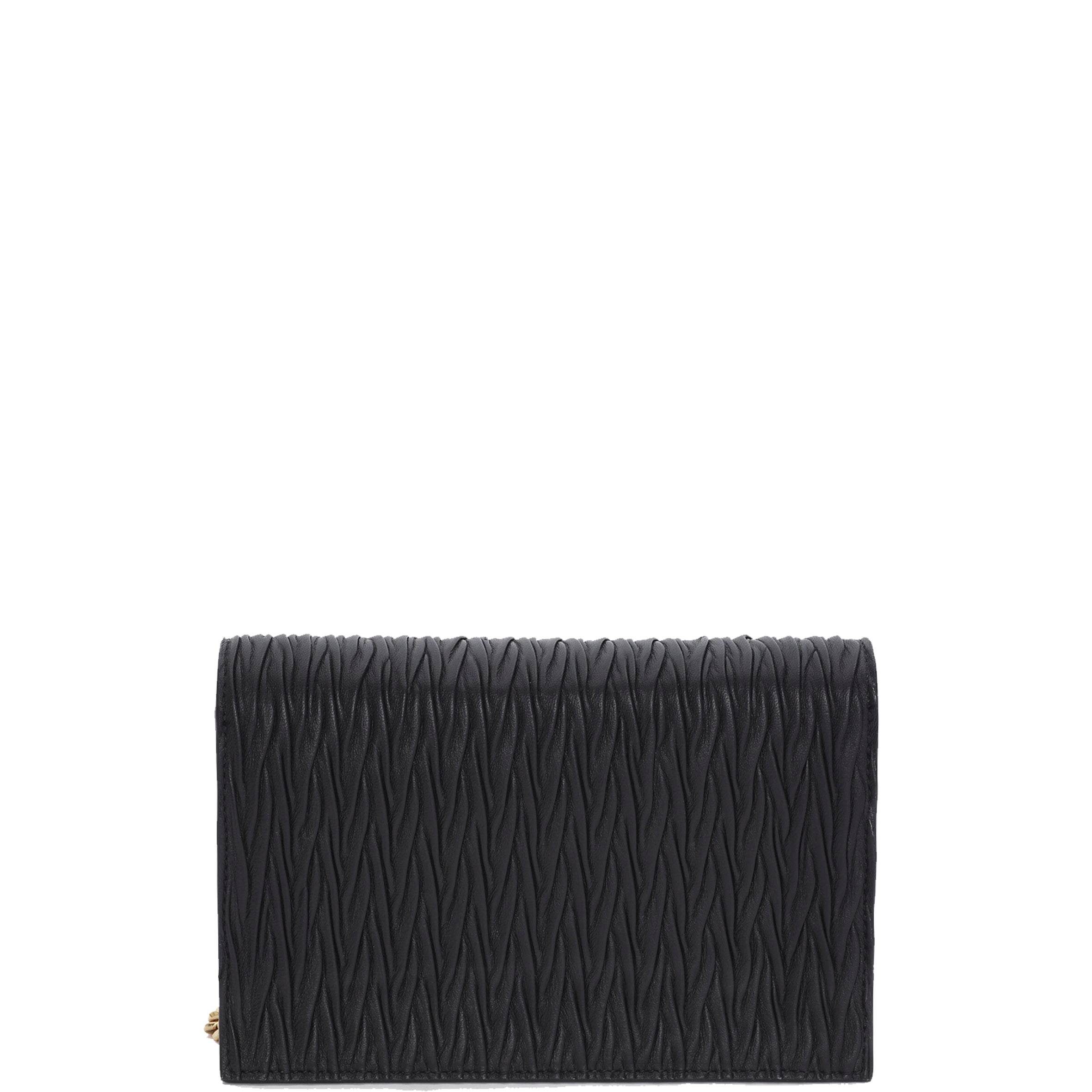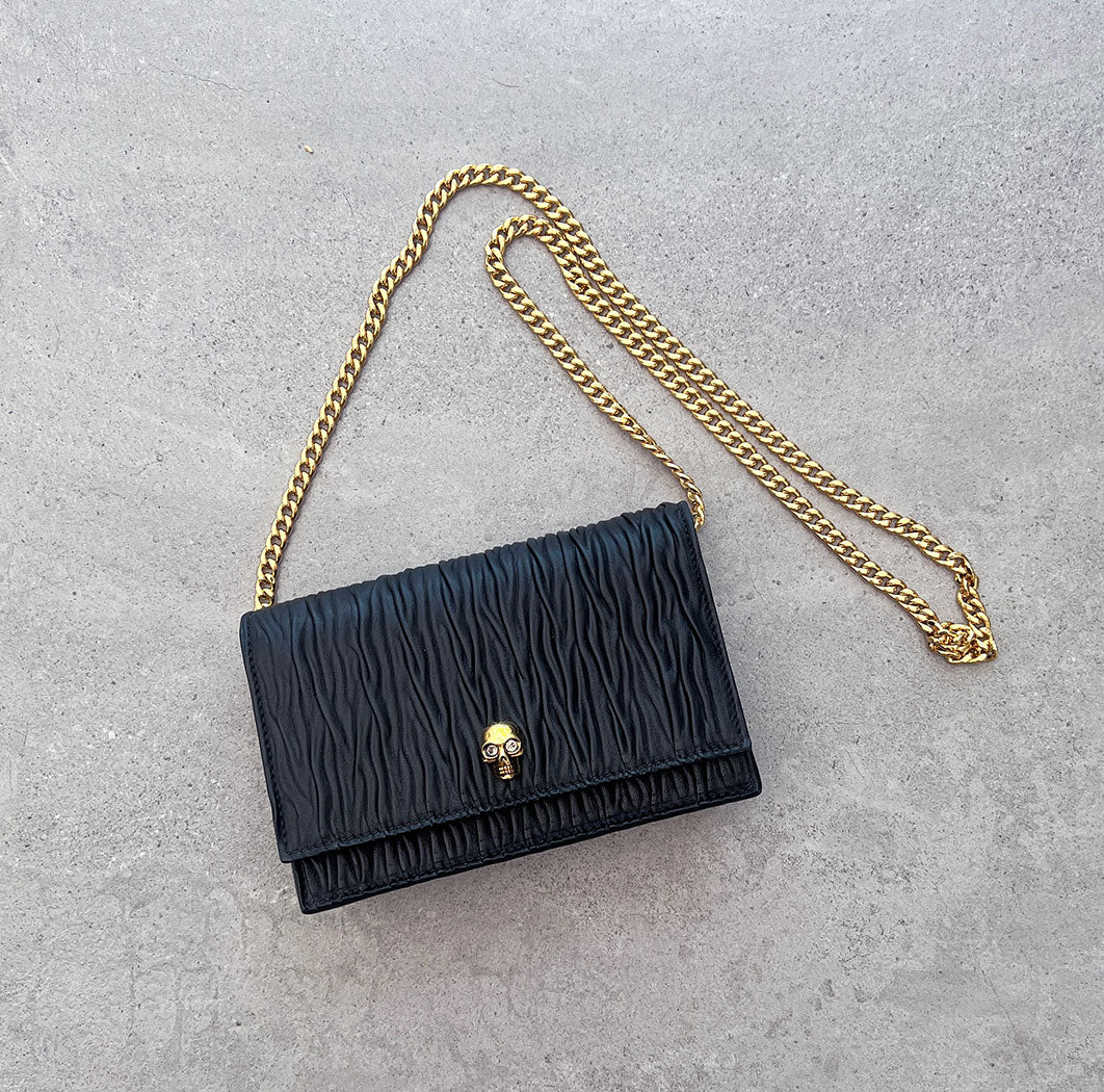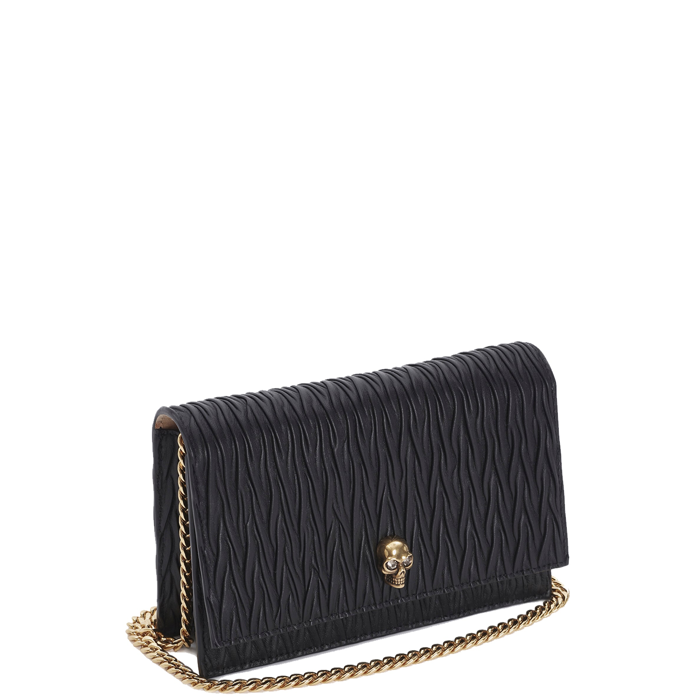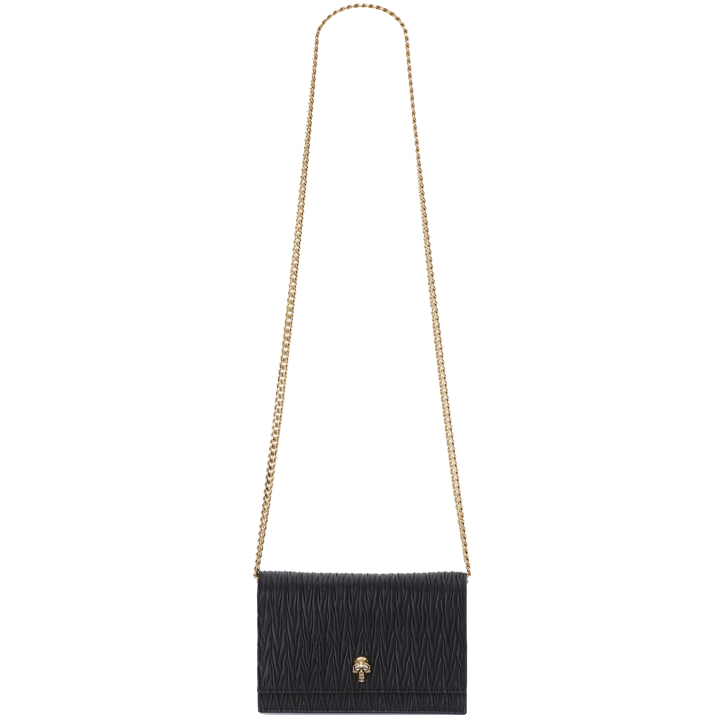 Alexander McQueen Small pleated nappa leather Bag with a Suede-effect lining detailed with a gold-finished skull and chain strap. Features a magnetic closure, one central compartment as well as one card pocket. Accommodates smartphones.