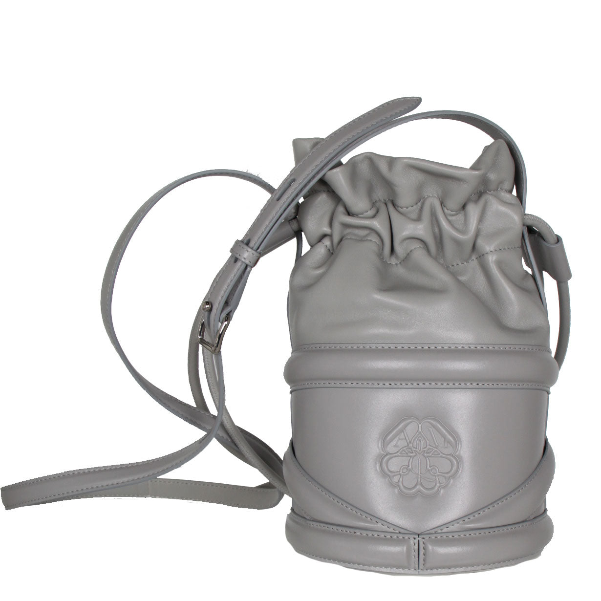 The Soft Curve in pale grey calf leather inspired by the harness silhouette and finished with a lambskin drawstring closure and high frequency debossed Seal Signature. This bag can we worn across the body by using the leather strap or over the shoulder with the strap through the leather loop folded back. It has one main compartment with one leather card compartment. Can accommodate a smartphone