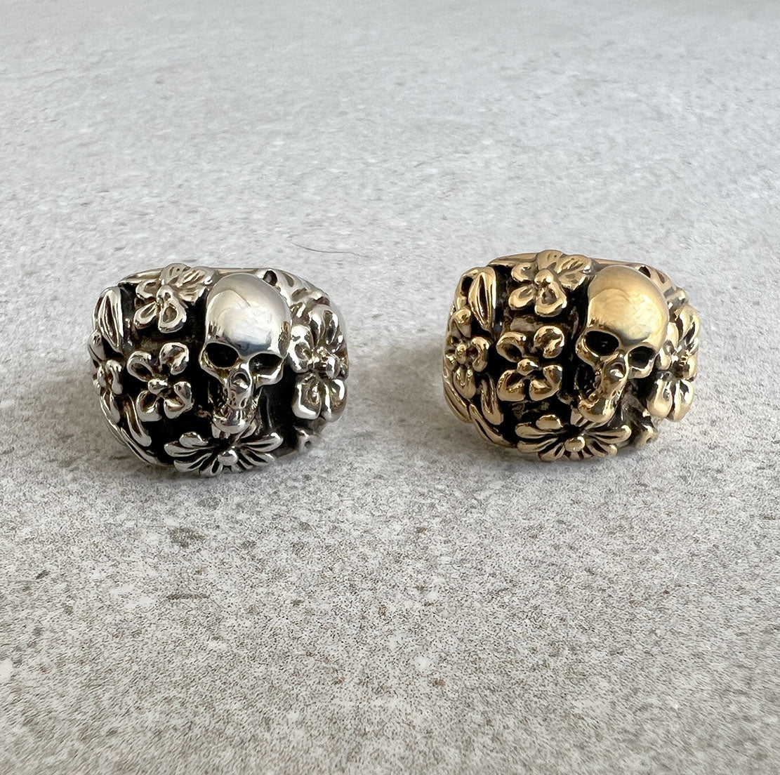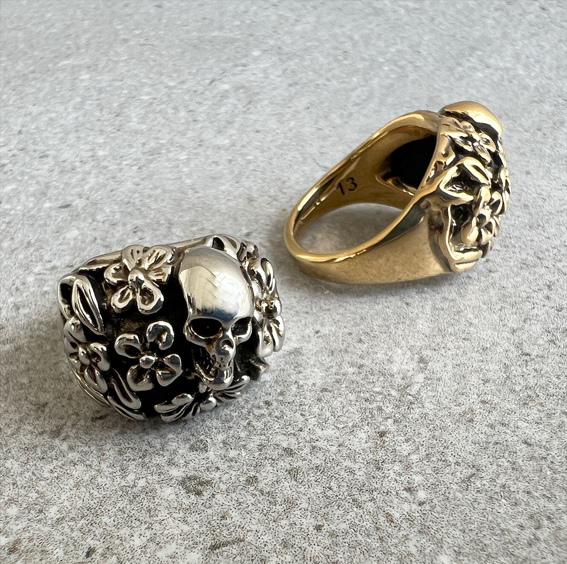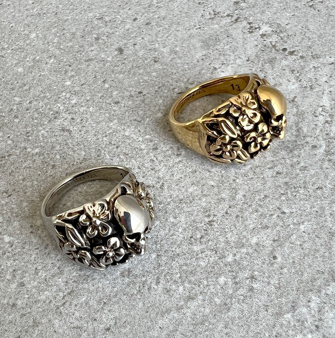 Antique siilver-finished ring inspired by the house's iconic Knuckle. The ring features a skull with floral engraving. Eco brass hardware. This is a for a single silver tone ring, gold ring provided for colour options.
