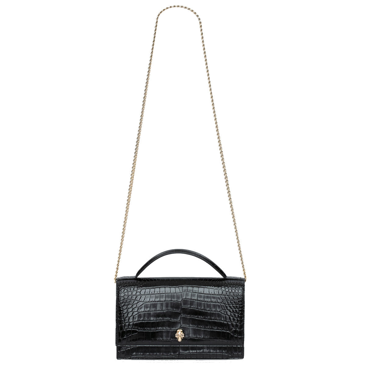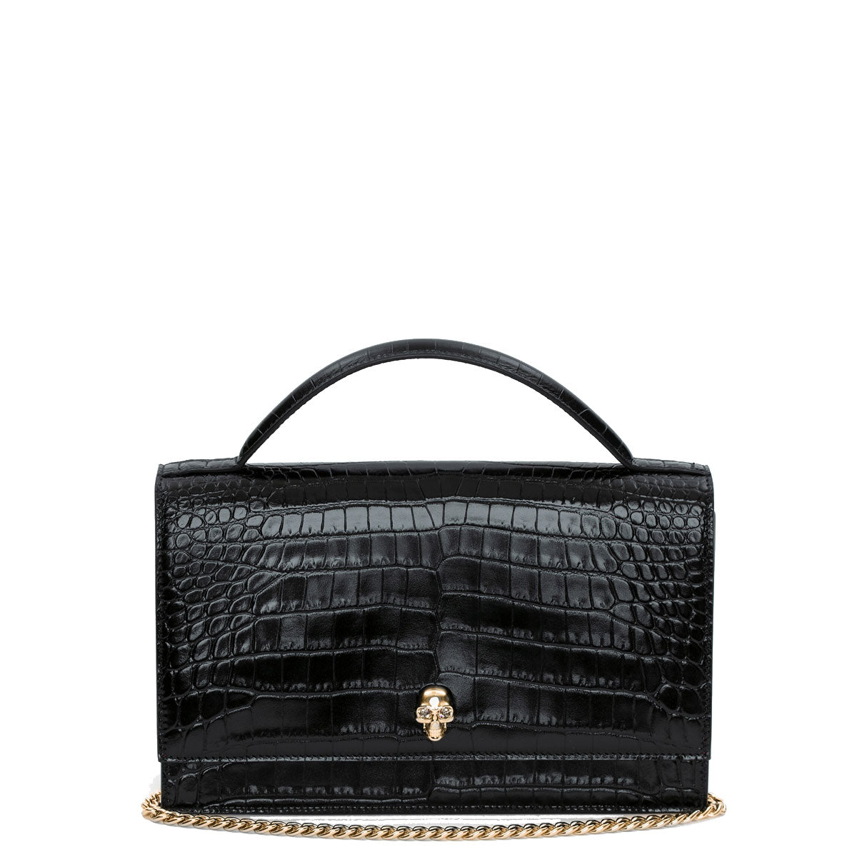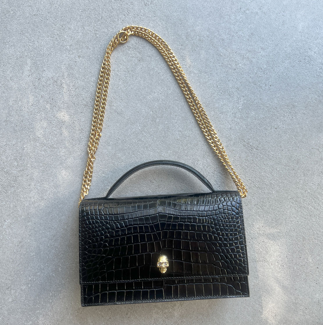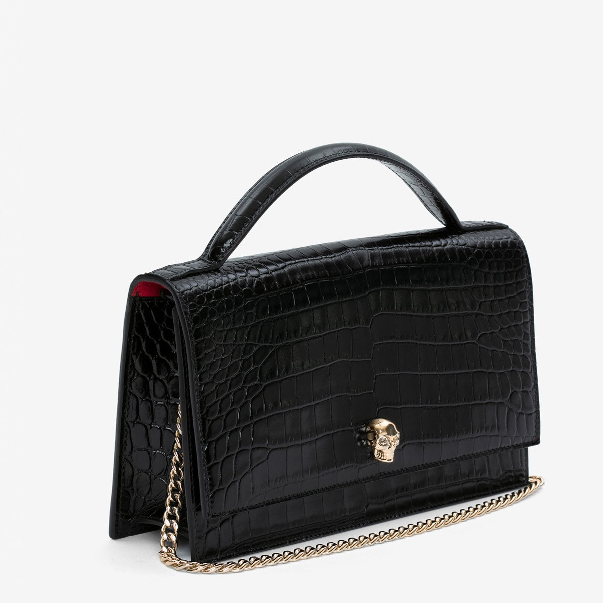 Shiny black embossed croc calfskin leather Skull Bag detailed with a gold-finished skull and a leather top handle. The bag can be worn either hand-held with its removable chain strap or over the shoulder by doubling up the chain or cross the body. This bag features one central compartment, one card pocket and snap button closure. Accomodates smartphones.
