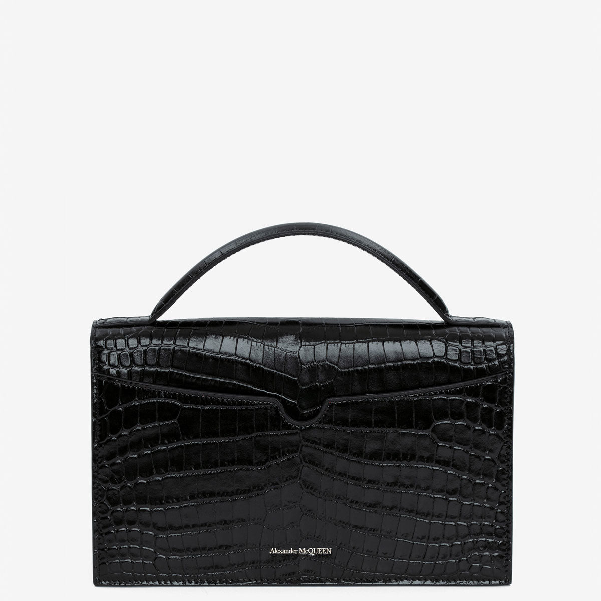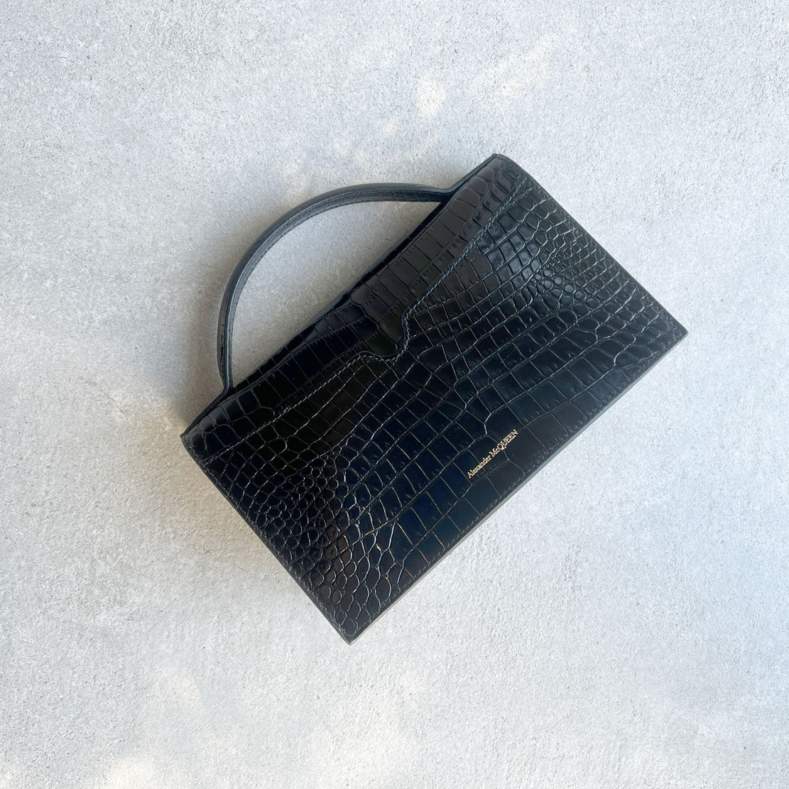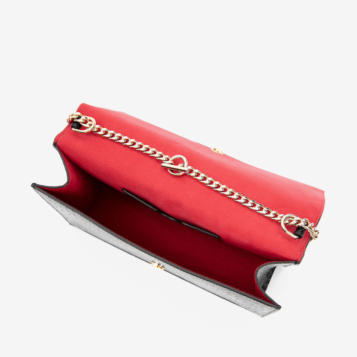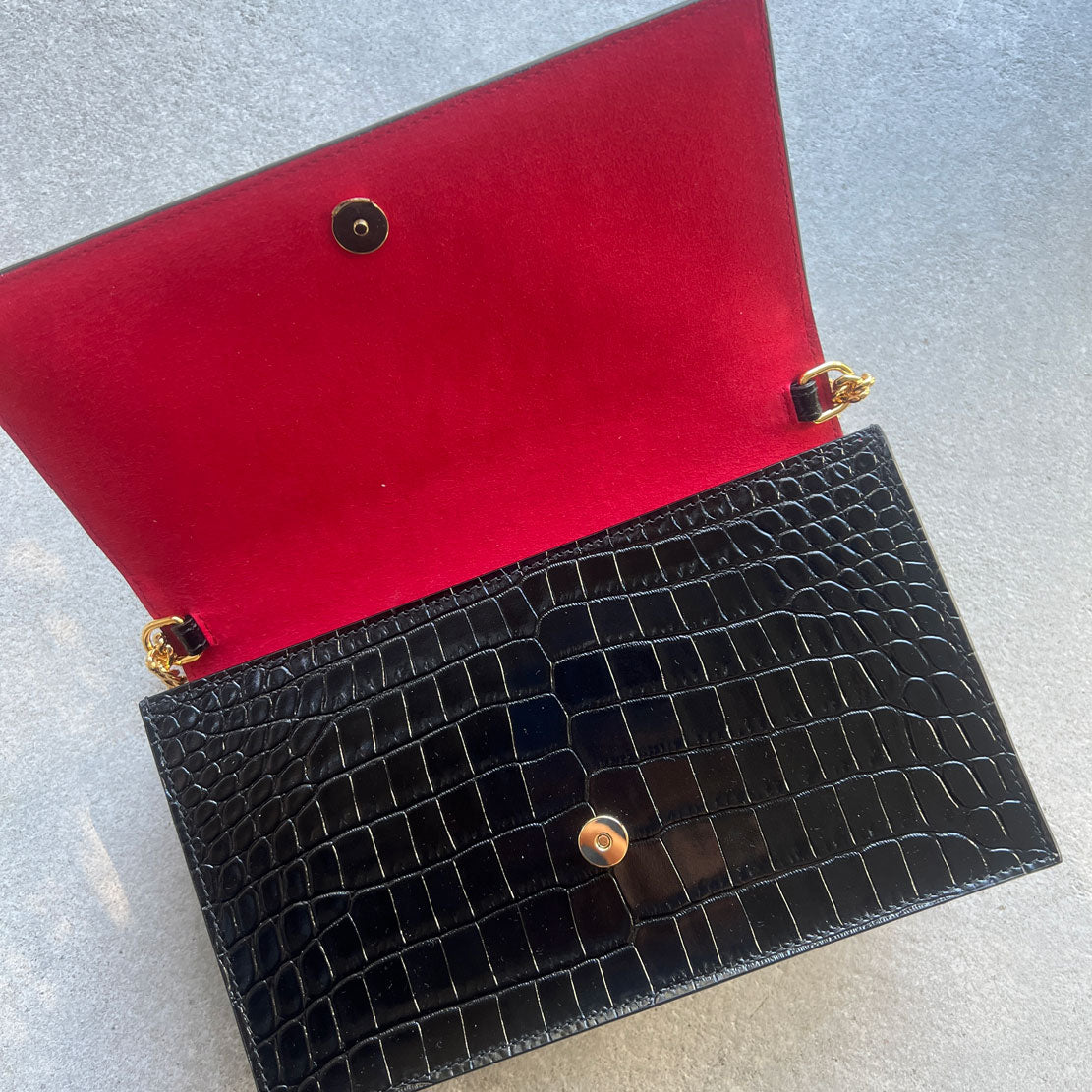 Shiny black embossed croc calfskin leather Skull Bag detailed with a gold-finished skull and a leather top handle. The bag can be worn either hand-held with its removable chain strap or over the shoulder by doubling up the chain or cross the body. This bag features one central compartment, one card pocket and snap button closure. Accomodates smartphones.