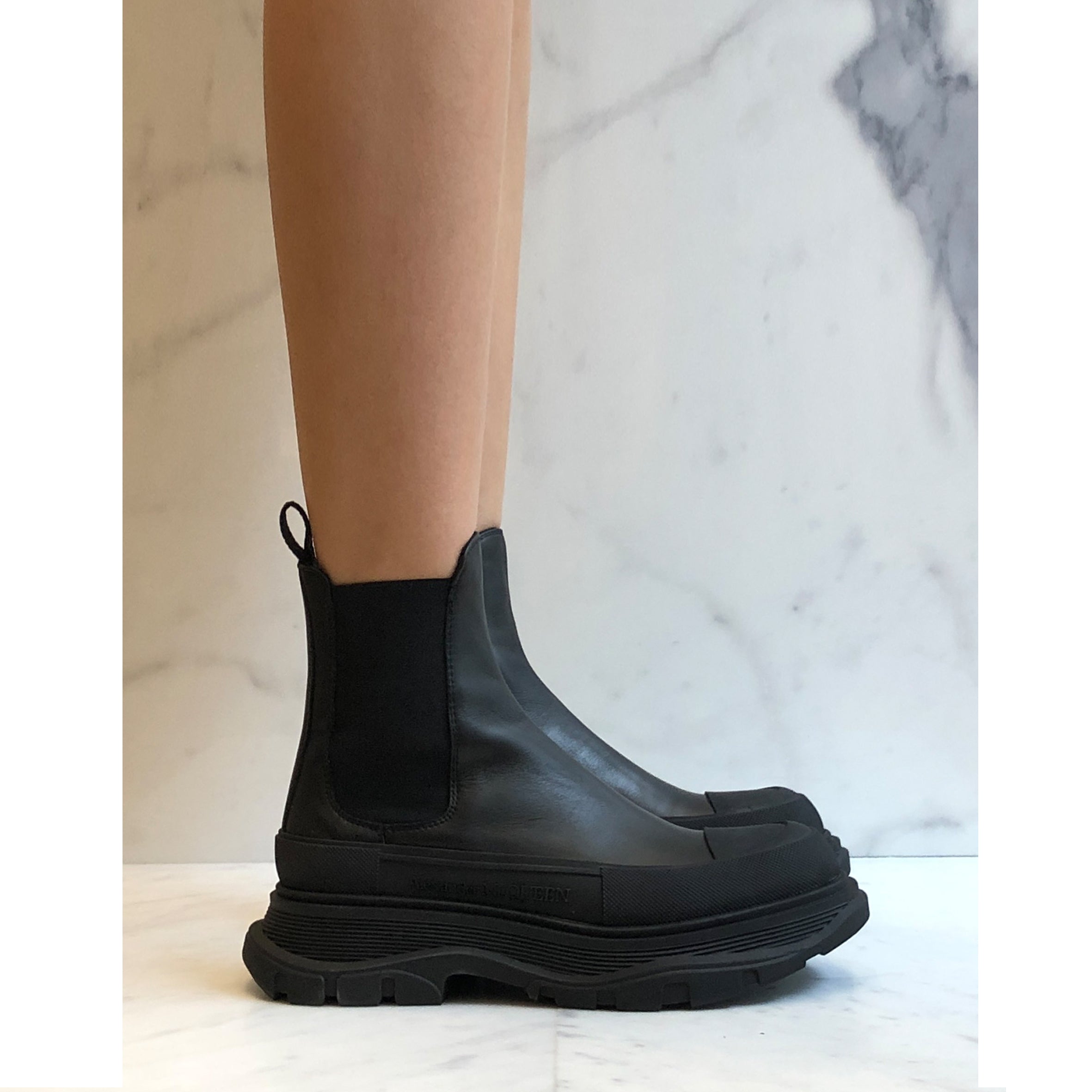 Black boot with a lightweight over-sized rubber tread sole. The boot is detailed with a textured rubber wrap and tonal Alexander McQueen signature, finished with a signature ribbon on the back of boot. Round toe shape boot silhouette with rubber toe cap detail.