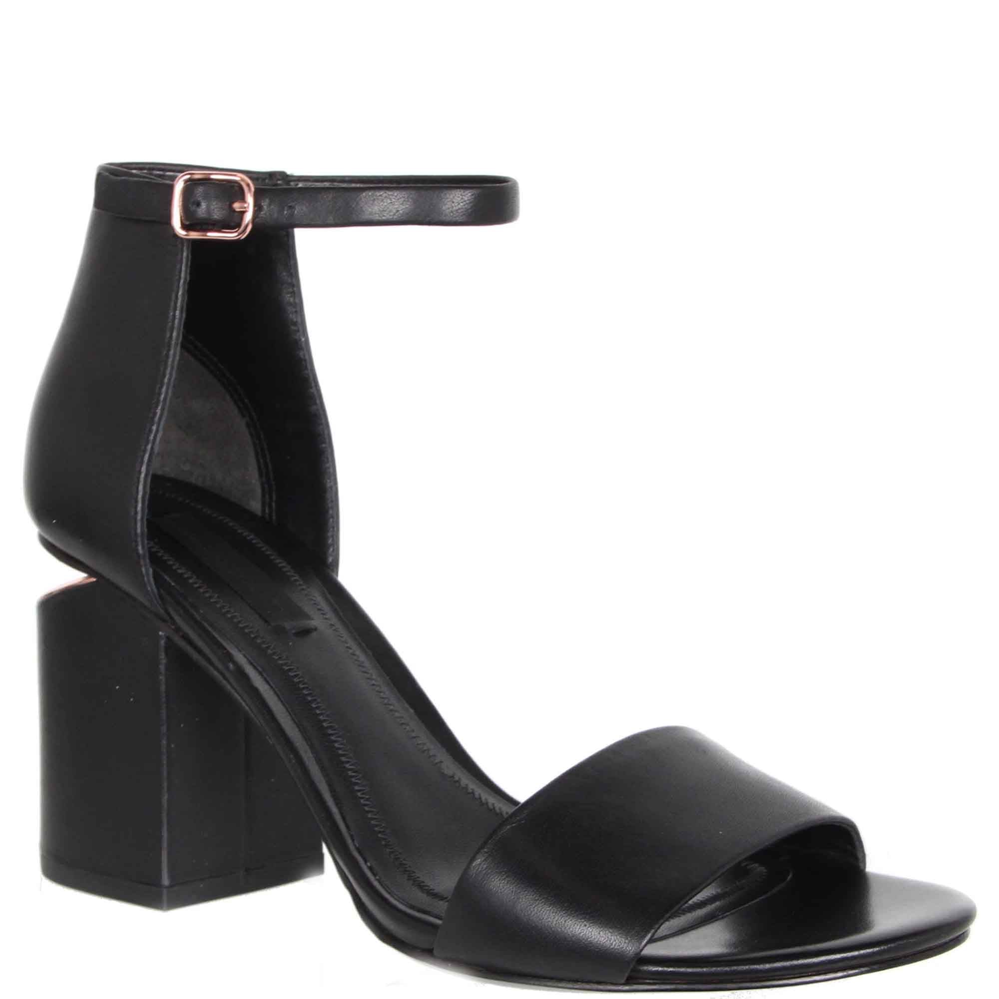 Mid heel sandal with signature cut out heel and Rose Gold metal plate. Ankle strap detail with buckle closure. Leather wrapped heel and leather outsole.
