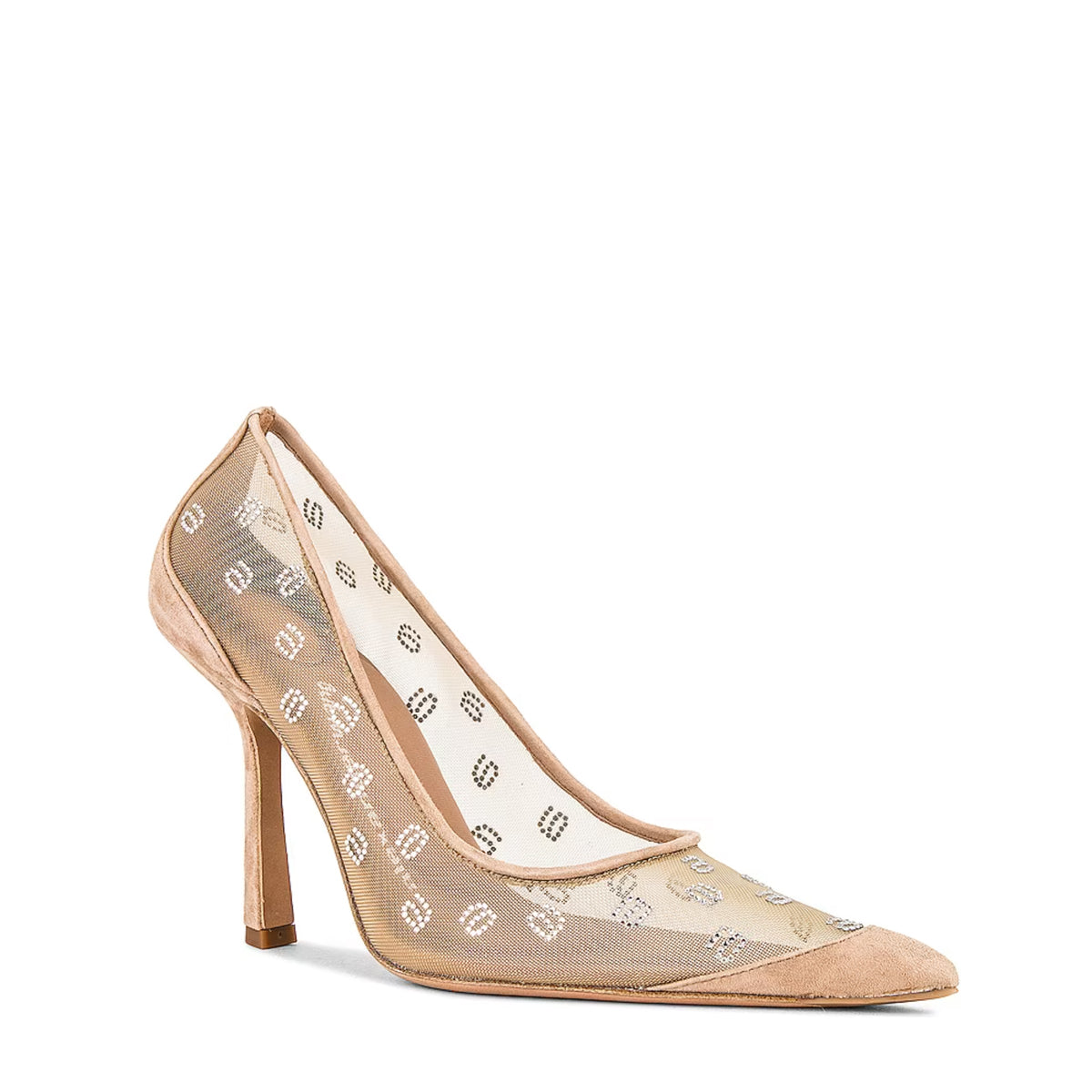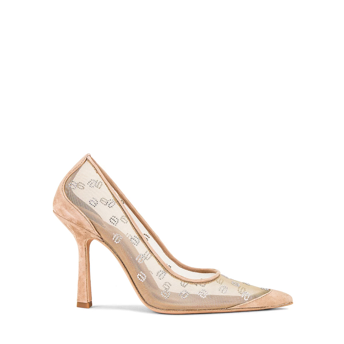 Delphine high-heel pump with pointed toe in new nude crystal mesh.