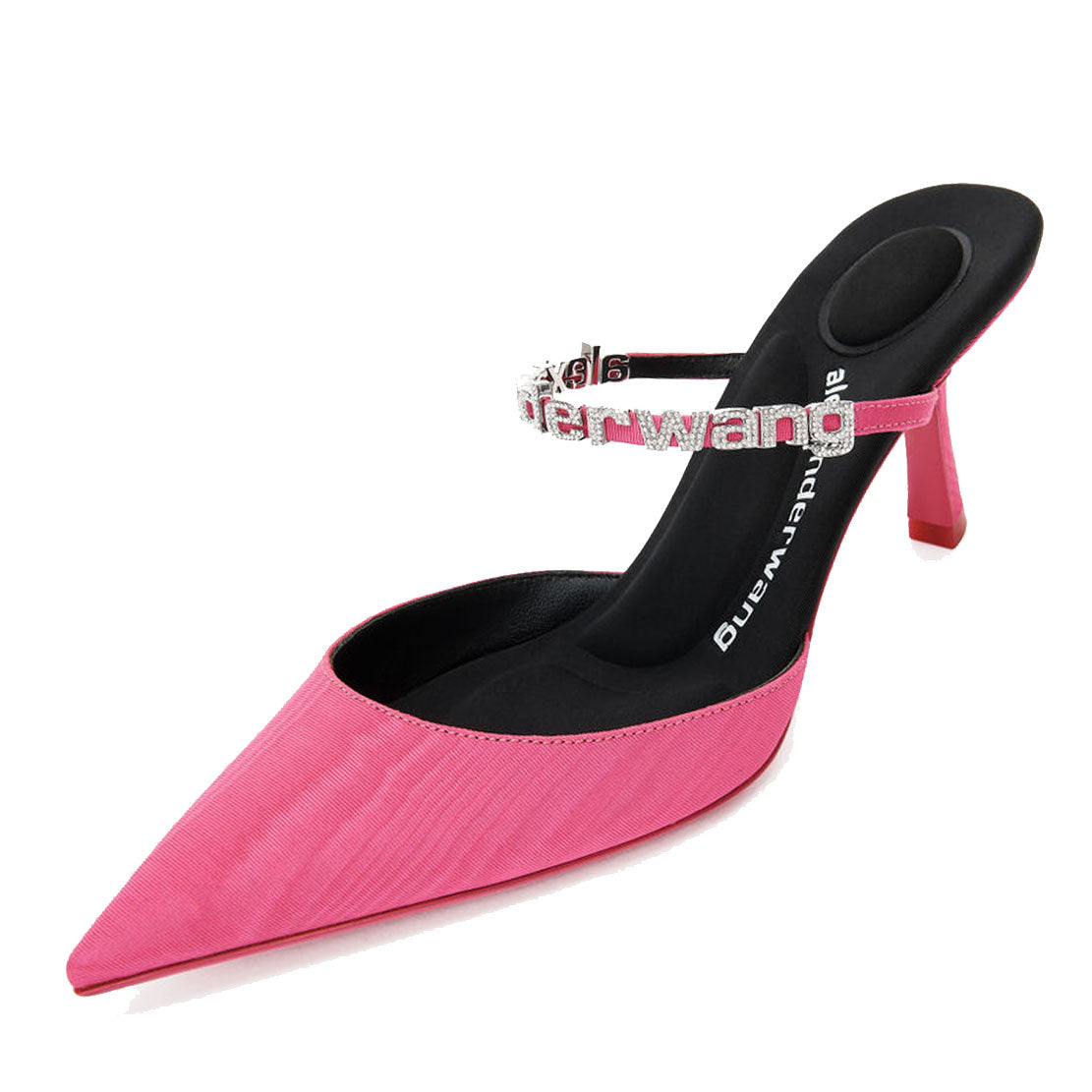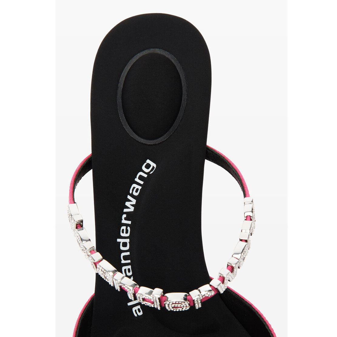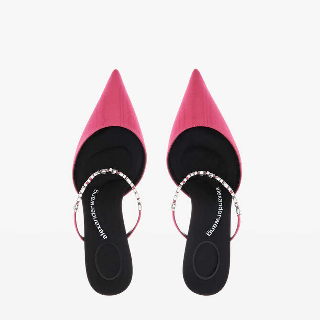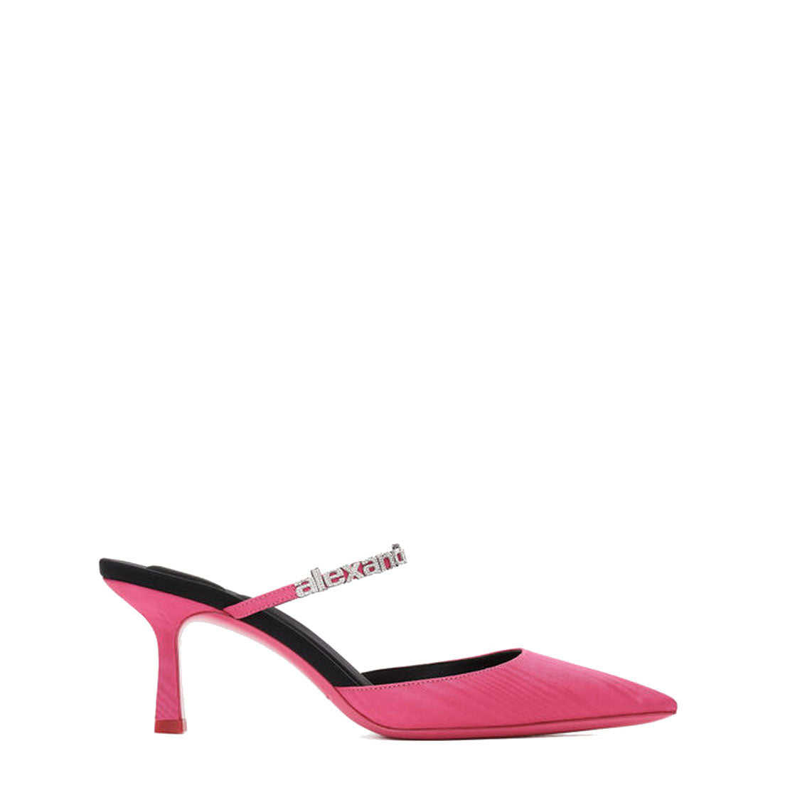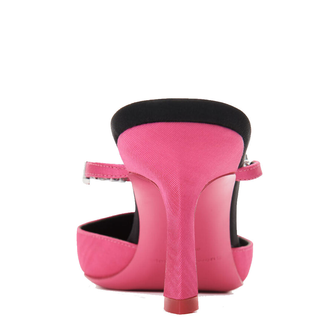 Mid-heel mule with crystal embellished logo sliders at straps in black viscose.