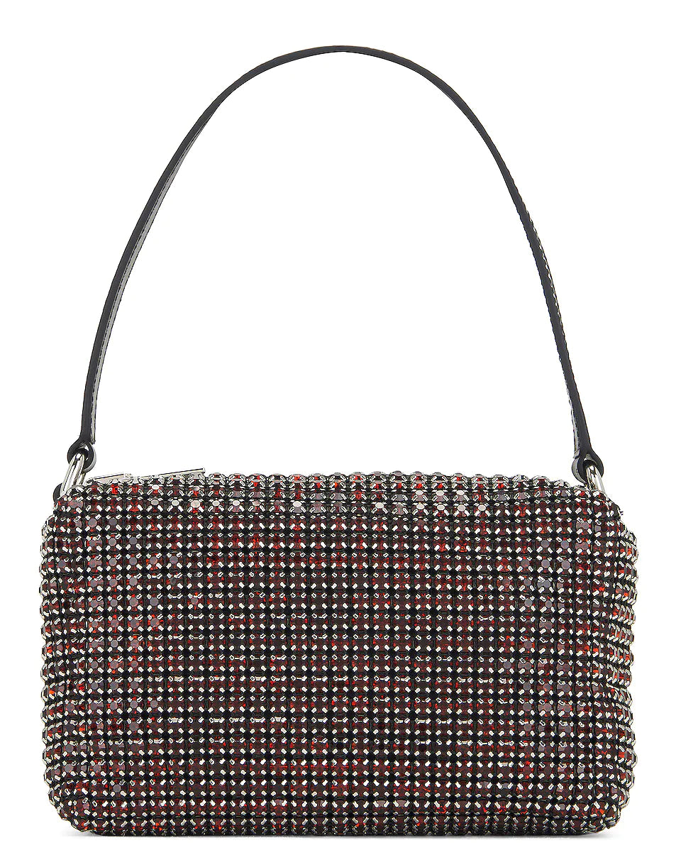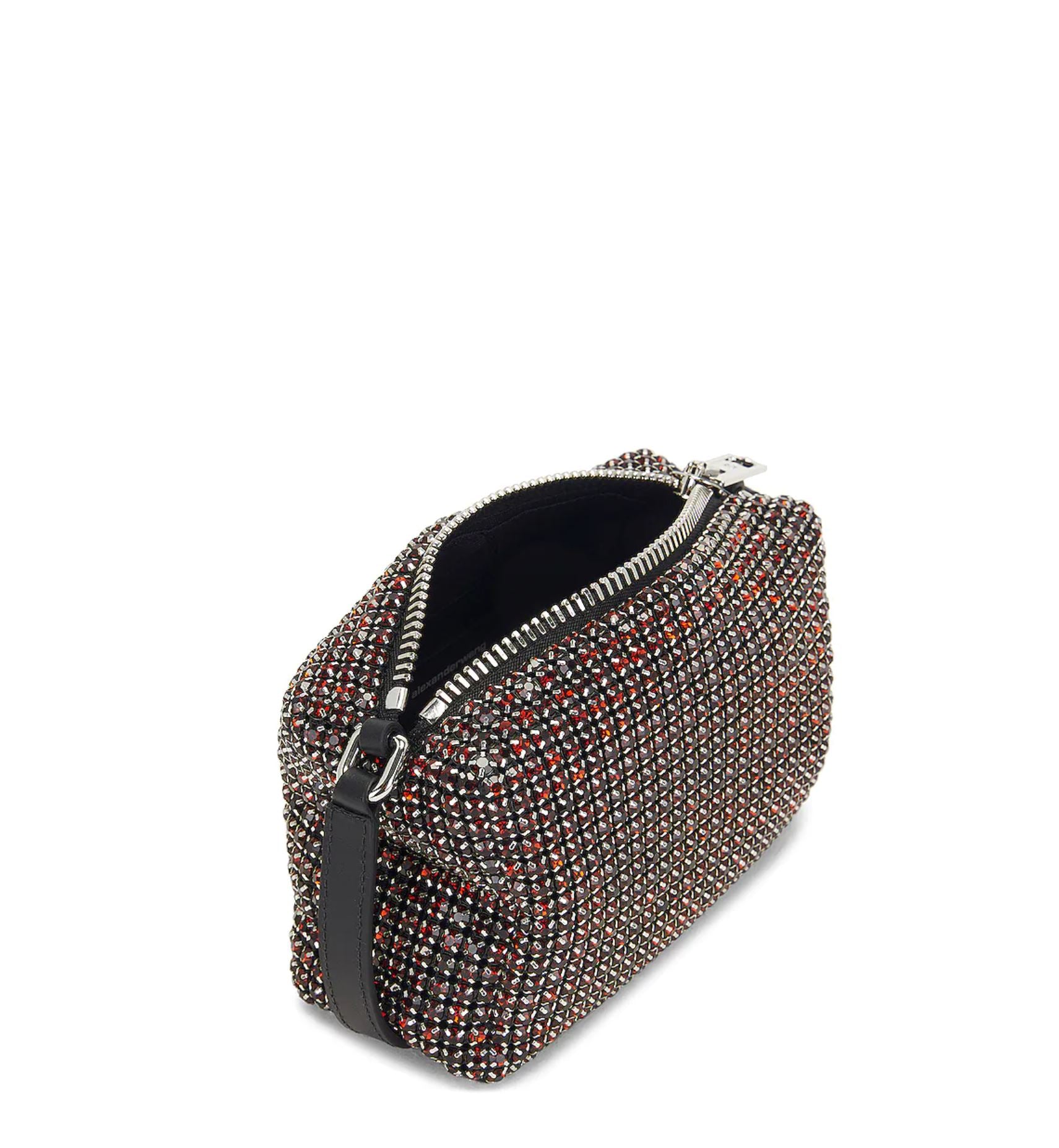 This medium pouch features crystal glass rhinestone embellishments and a statement zipper. The interior lining is made from nylon with an interior card slots. The handle is imprinted with the logo.