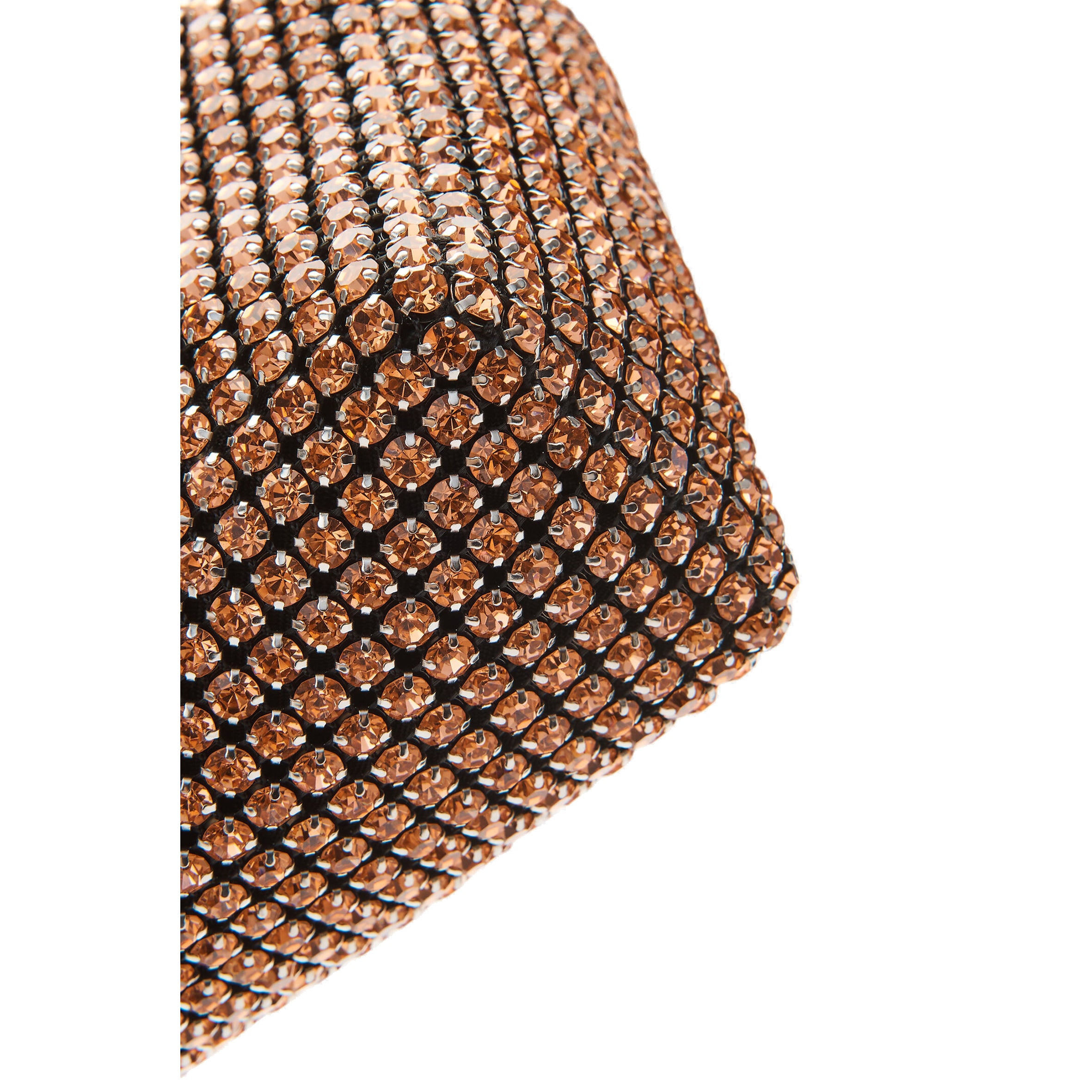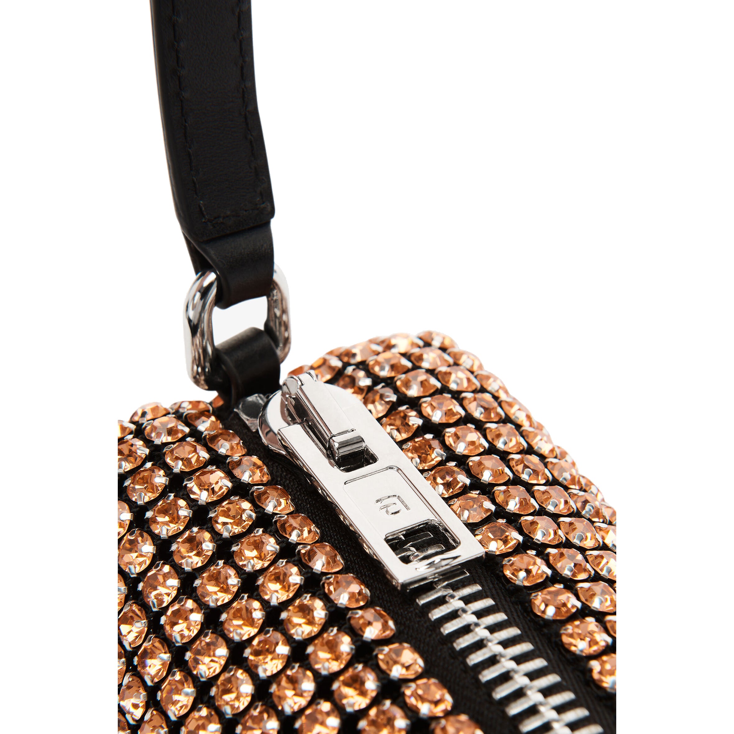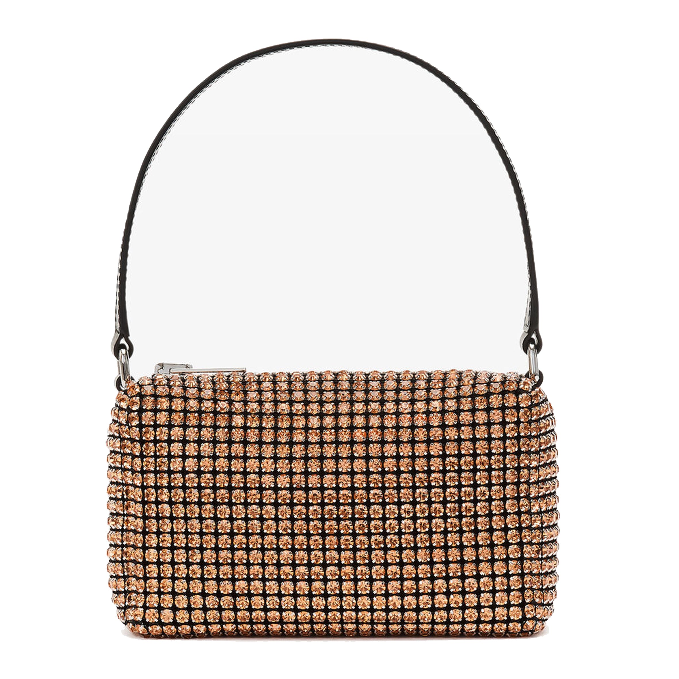 This medium pouch features crystal glass rhinestone embellishments and a statement zipper. The interior lining is made from nylon with an interior card slots. The handle is imprinted with the logo.