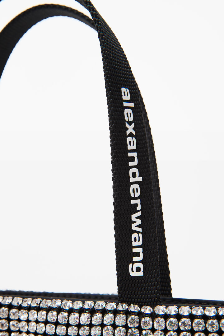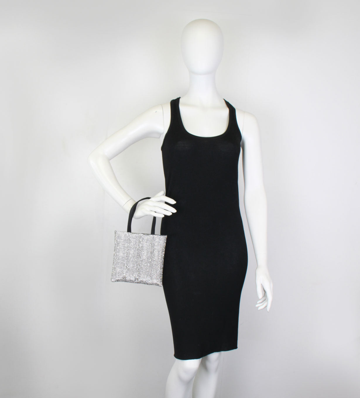 Miniature tote in quilted white rhinestone chain mesh with black webbed nylon top handles.
