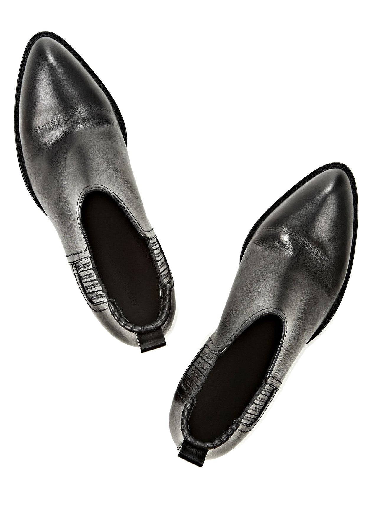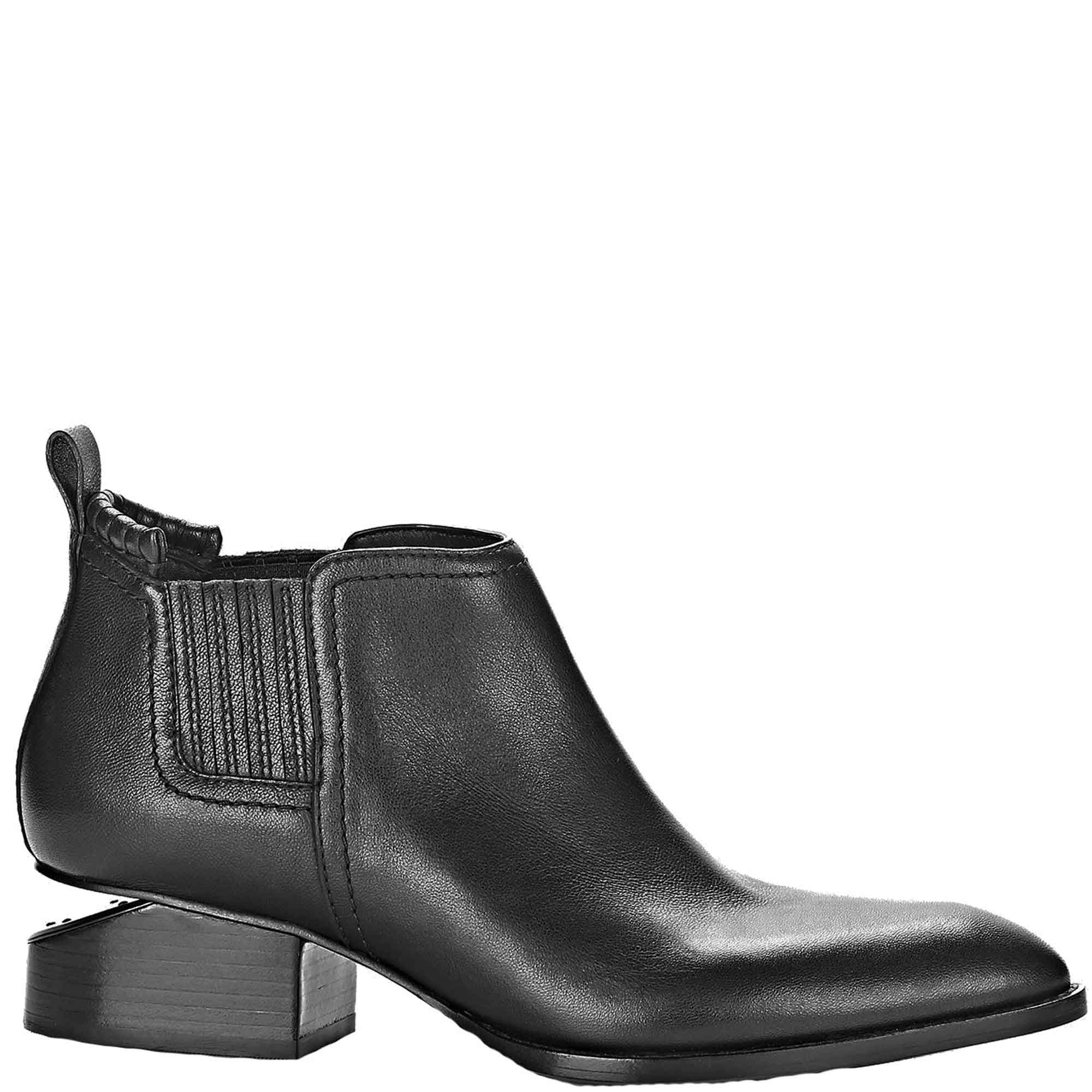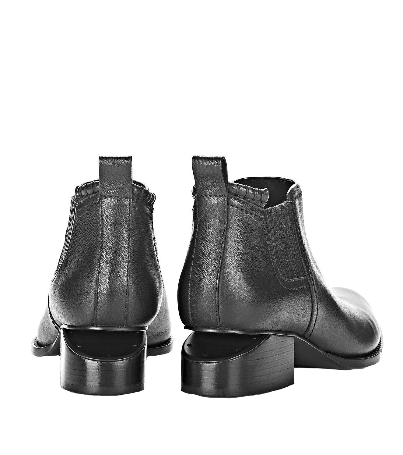 Heeled oxford boots with elastic finger gores and box stitch detail at back top-line. Signature cut out heel with a matte black metal plate. Leather stacked heel and buff leather out sole.