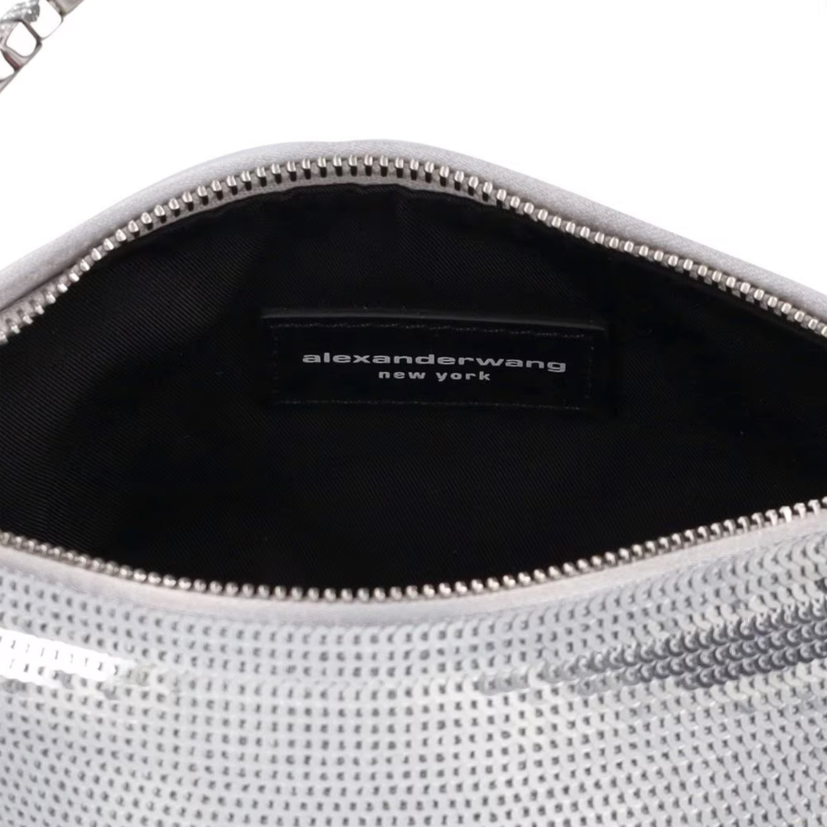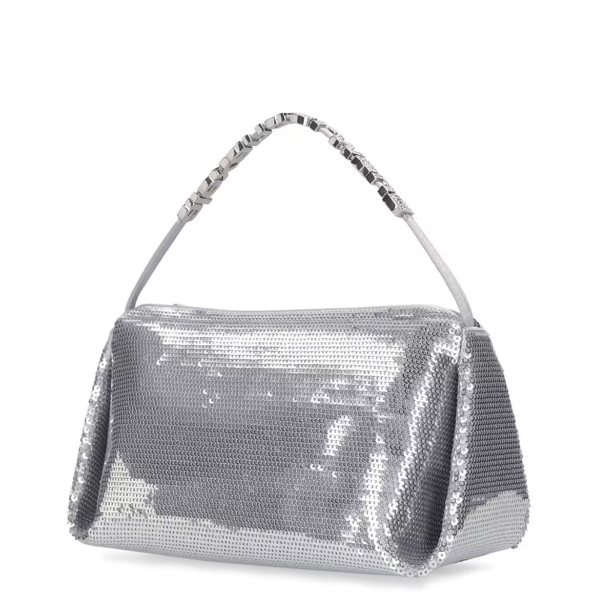 A micro sized hobo bag in silver sequined satin featuring a seamless body, diamante embellished logo charm and top handle. Metal zip closure, with twill lining.
