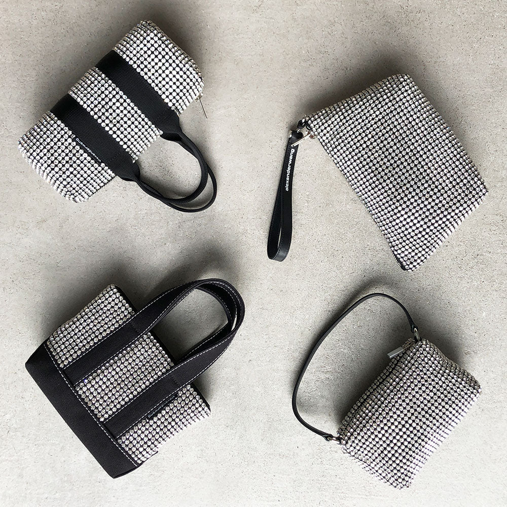 This medium pouch features crystal glass rhinestone embellishments and a statement zipper. The interior lining is made from nylon with an interior card slots. The handle is imprinted with the logo.