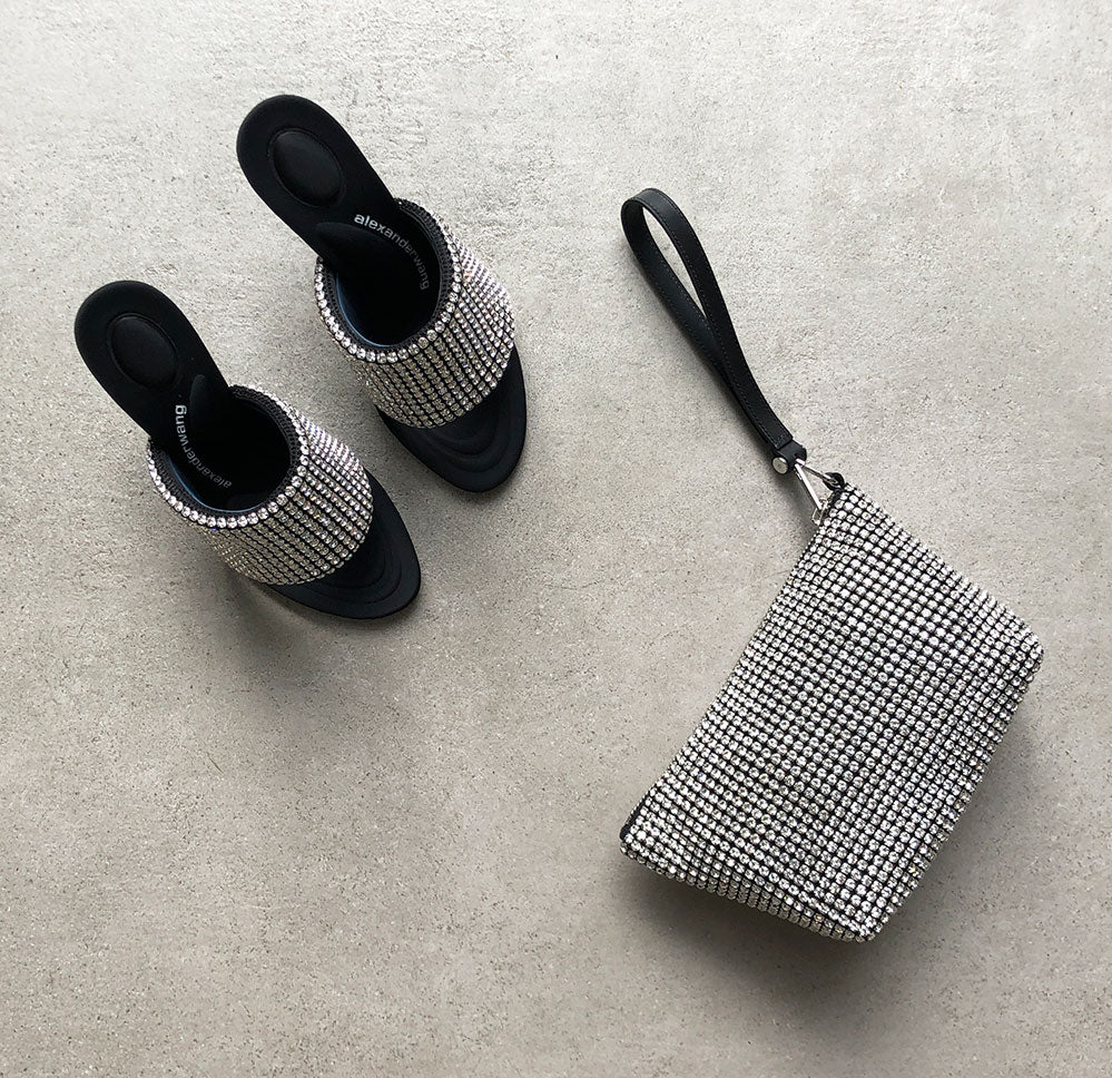 Sienna Crystal open-toe slide sandals with crystal rhinestone embellished upper strap. Moulded comfort foot-bed, almond toe and flared enamel stiletto heel. True to size, Dust bag included.