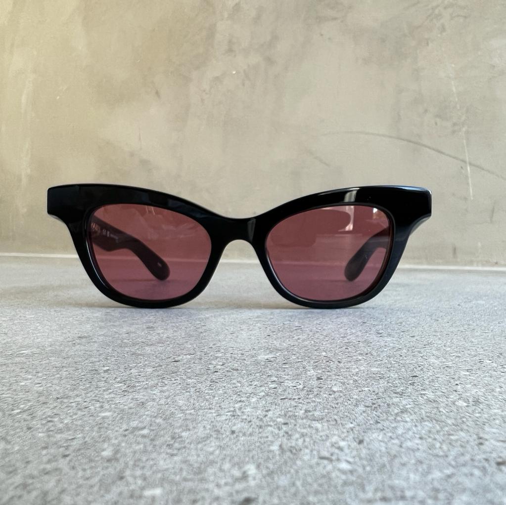 Shiny Black acetate sunglasses featuring a cat eye construction with pink lenses. Finished with a printed Alexander McQueen signature on the temples.