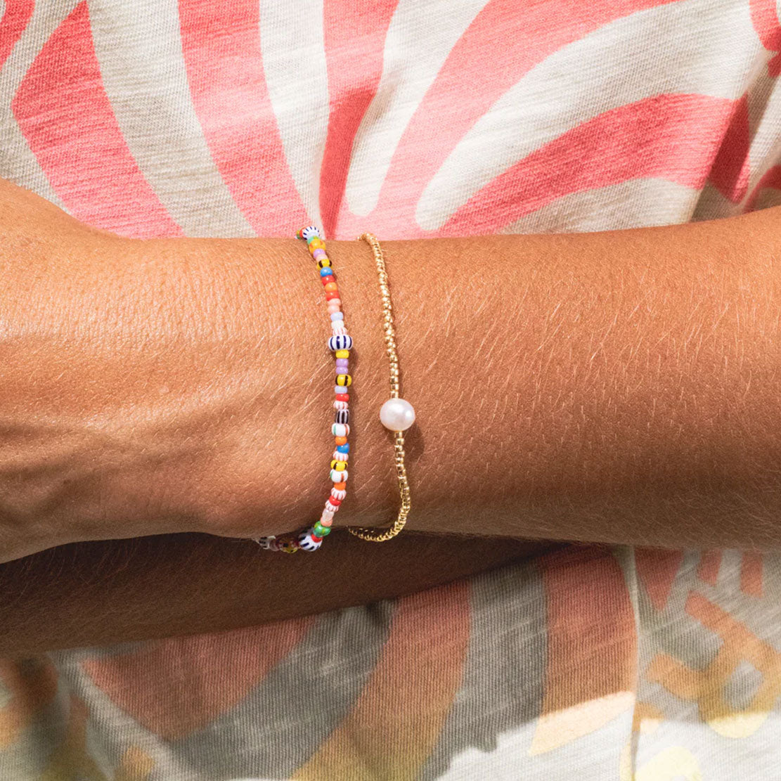 An Alaia is a classic, hawaiian surfboard, and the Alaia bracelet definitely has a magical aura of relaxed evenings at the beach and big wave surfing. Detailed in glass beads and a baroque pearl.