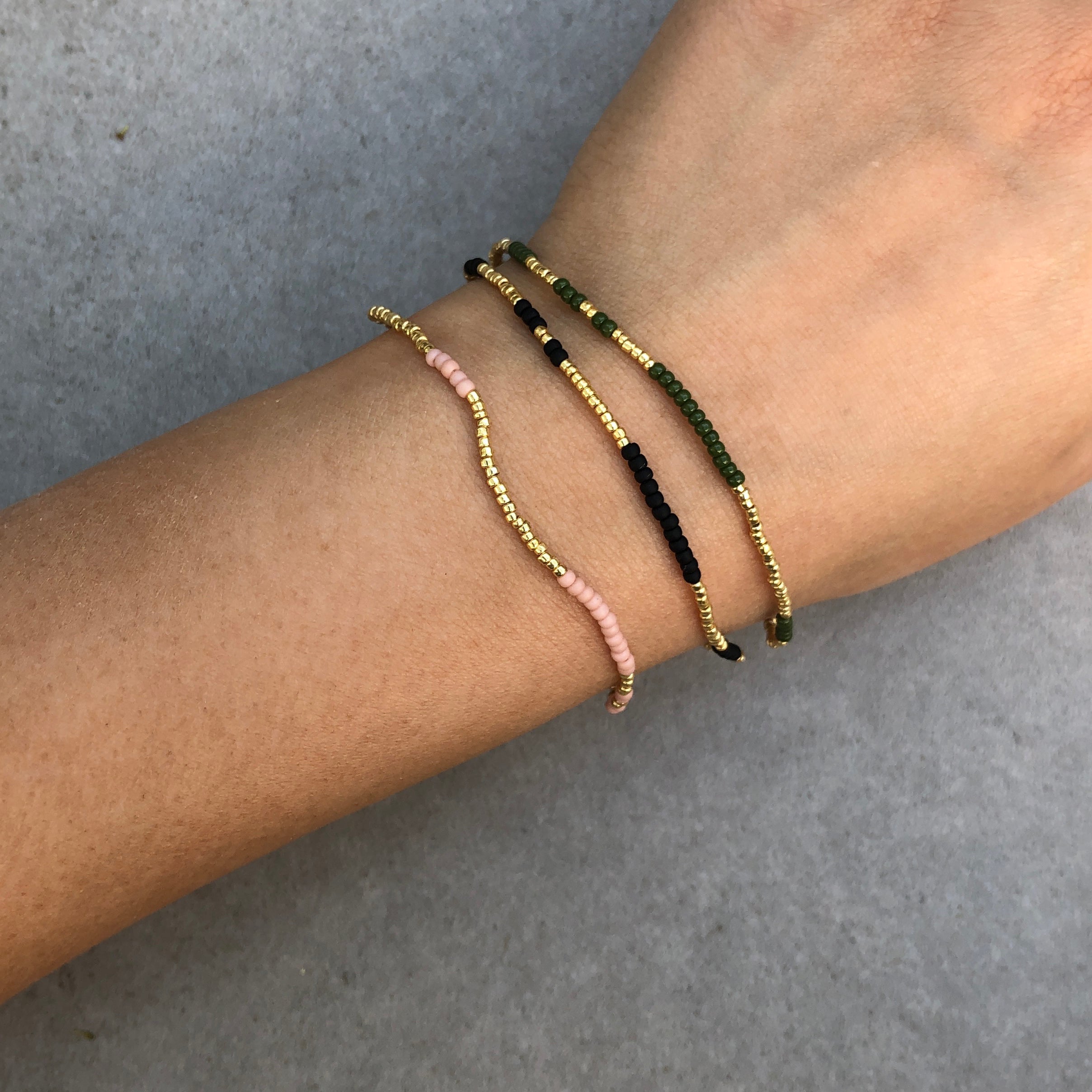 ASYM bracelet detailed in gold and colourful seed beads. Perfect for stacking.