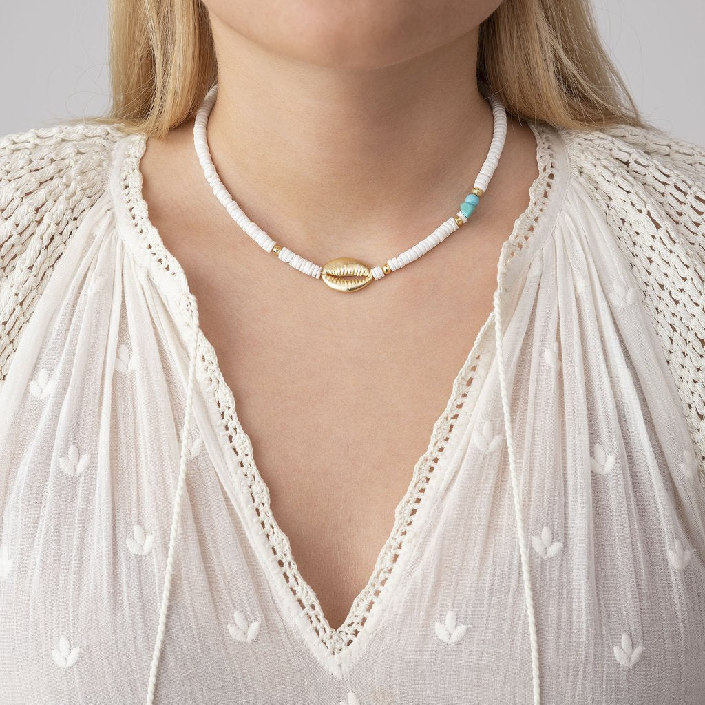 The I Found You Conch Necklace will evoke feelings of summer with a single glance. Detailed in shell disc beads, dyed seabamboo bead, turquoise bead and chips.