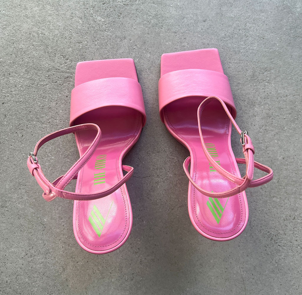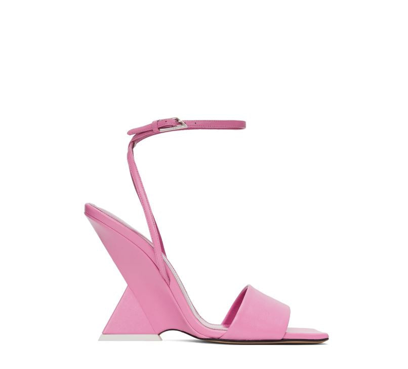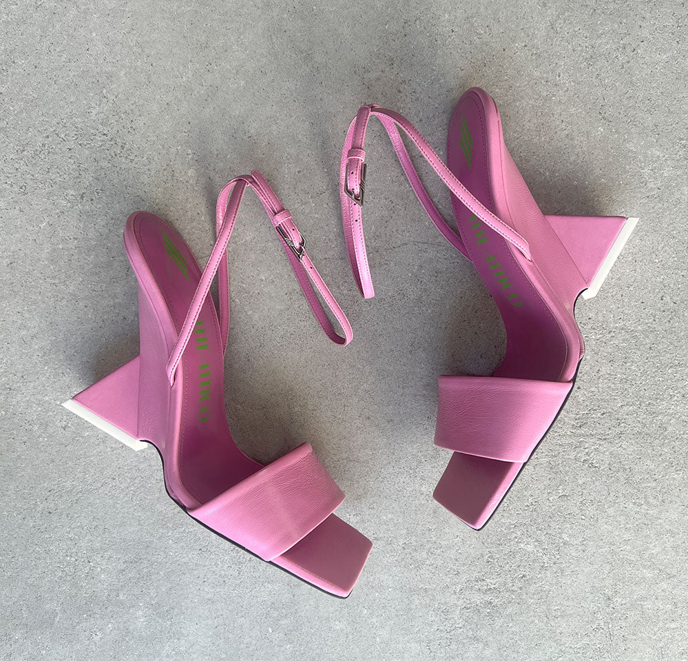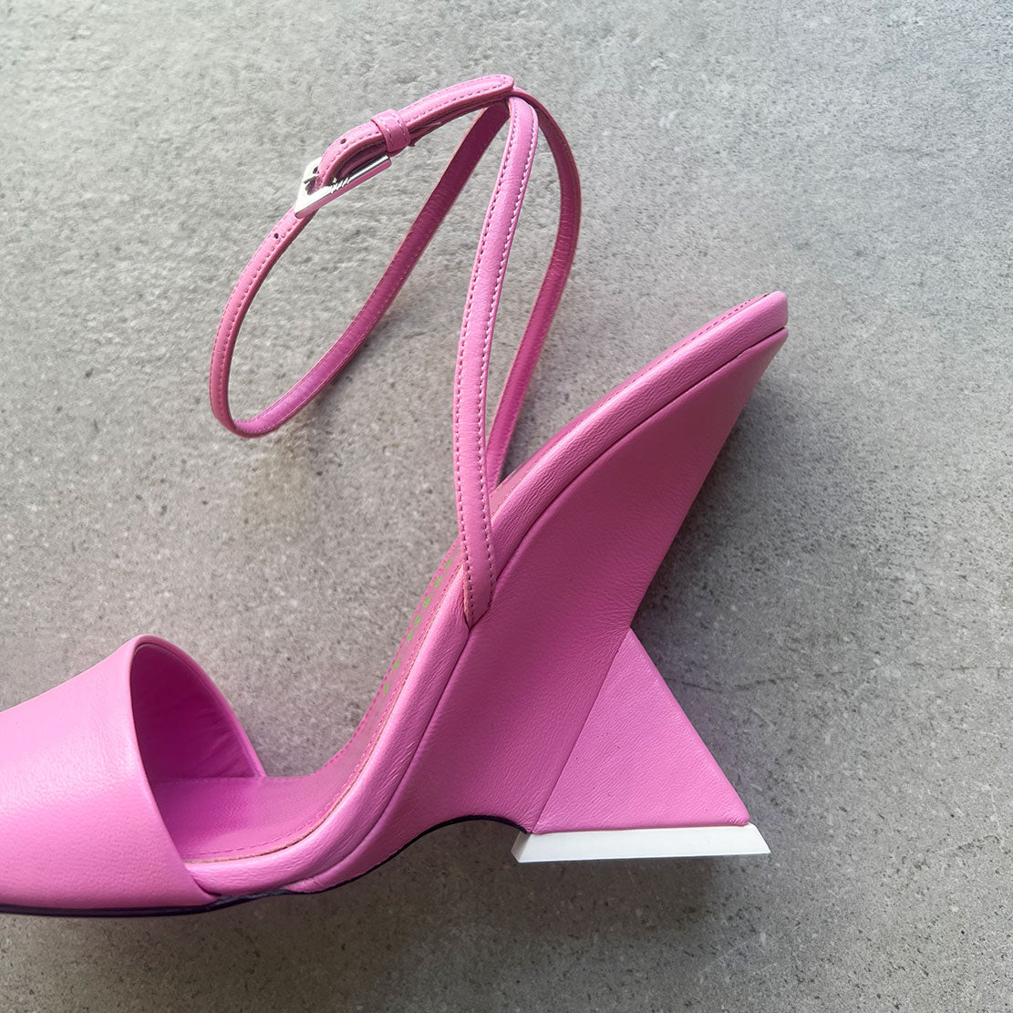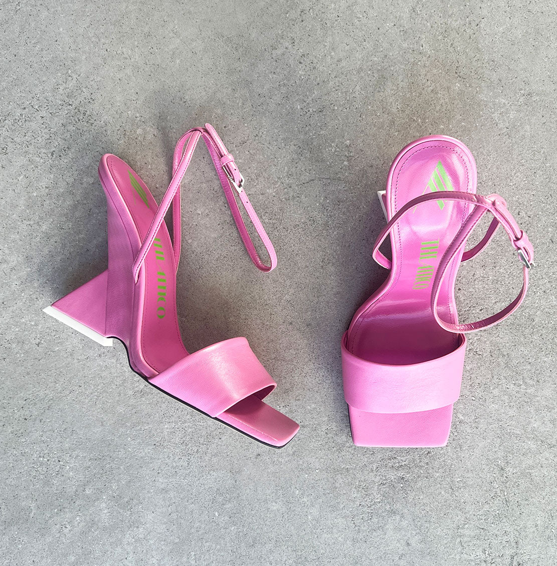''Cheope'' sandal in fuchsia satin with fluo fuchsia eco-friendly patent pyramid wedge, height 105mm.