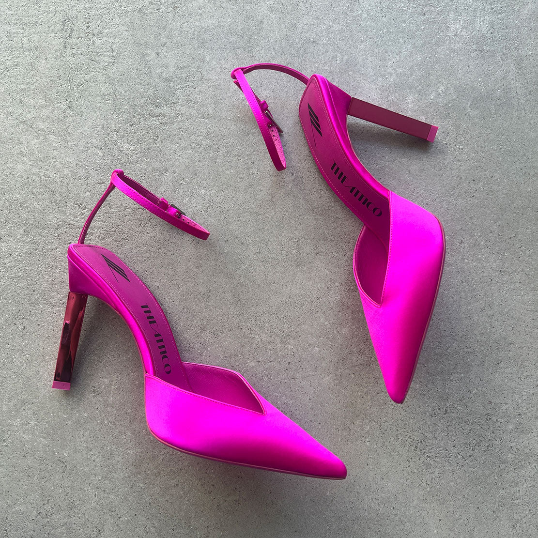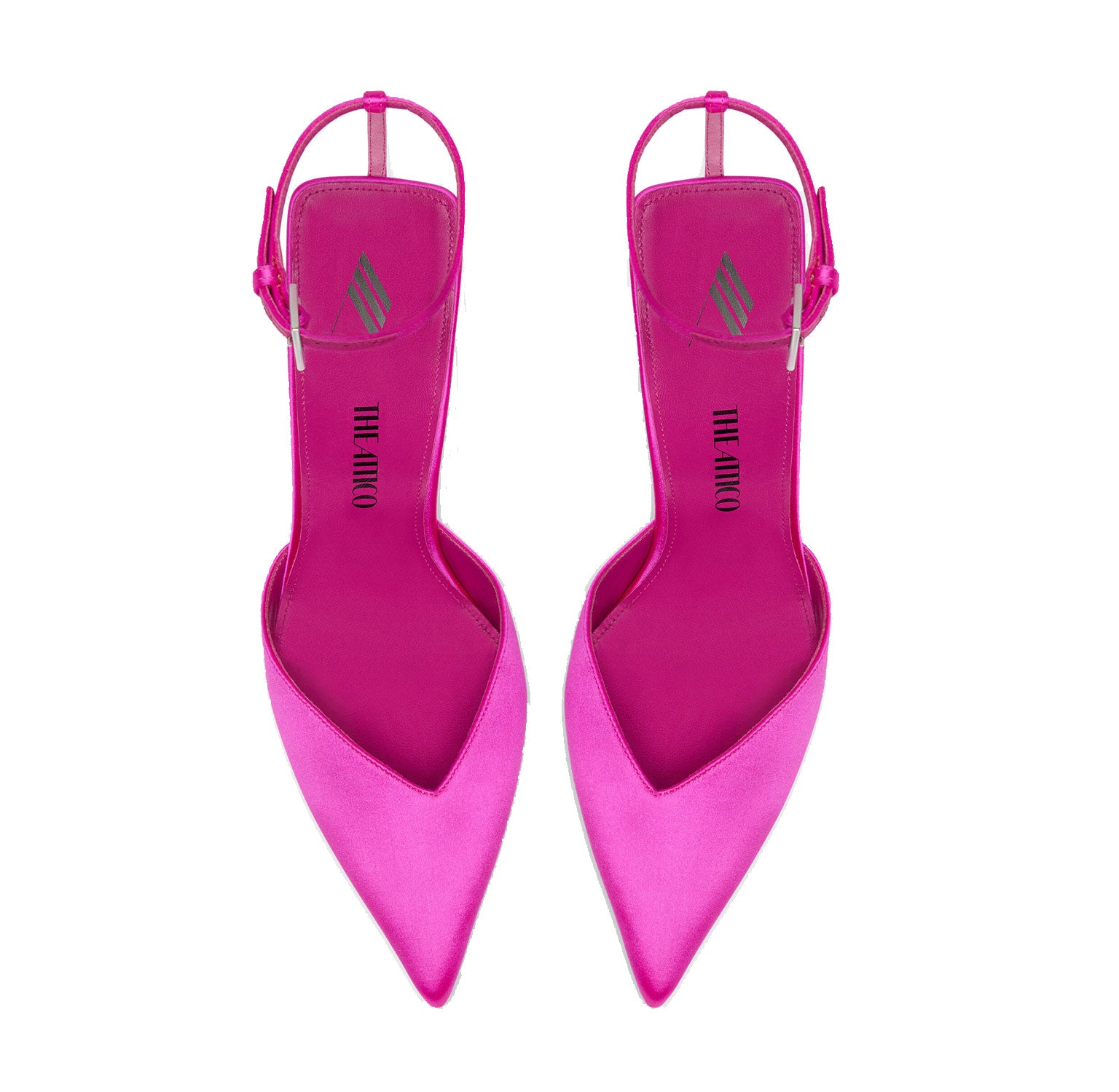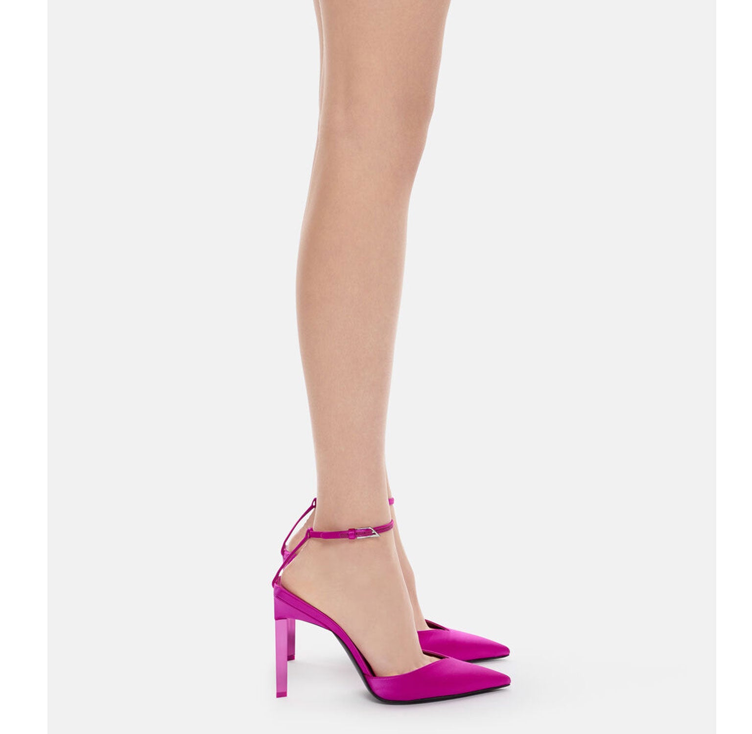 'Perine'' fuchsia slingback in satin with ankle strap, silver logo buckle and fuchsia galvanic heel and fuchsia top piece, height 105 mm