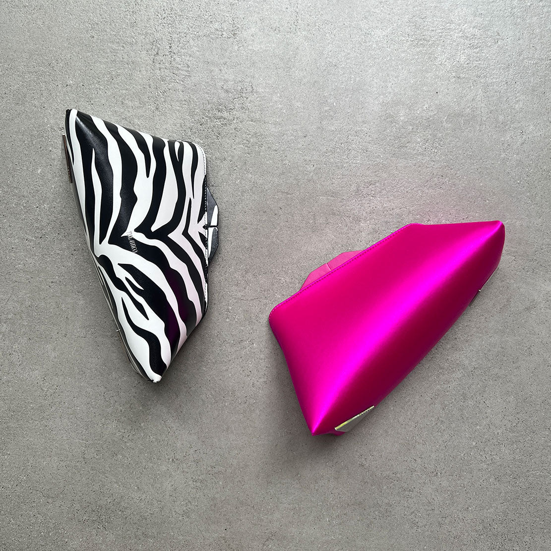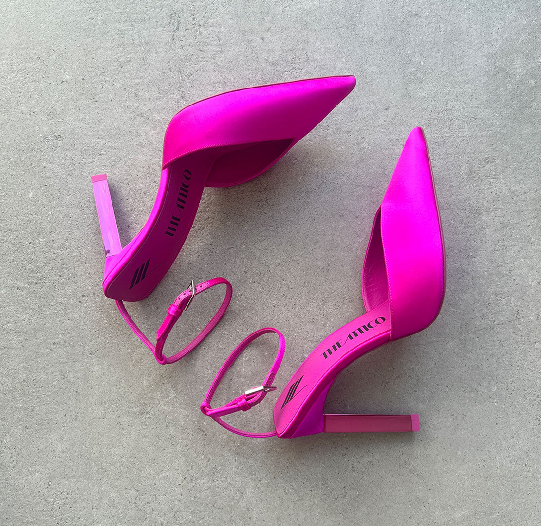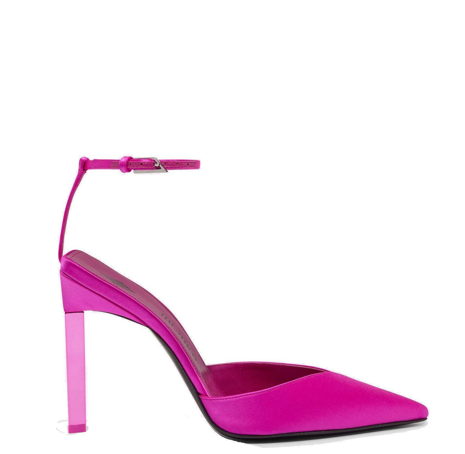 'Perine'' fuchsia slingback in satin with ankle strap, silver logo buckle and fuchsia galvanic heel and fuchsia top piece, height 105 mm