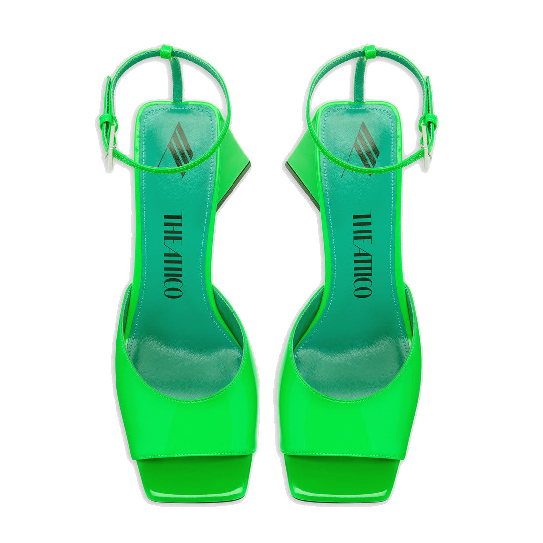 ''Piper'' sandal in neon emerald patent leather with pyramid heel, ankle strap and silver logo buckle, heel height 85mm