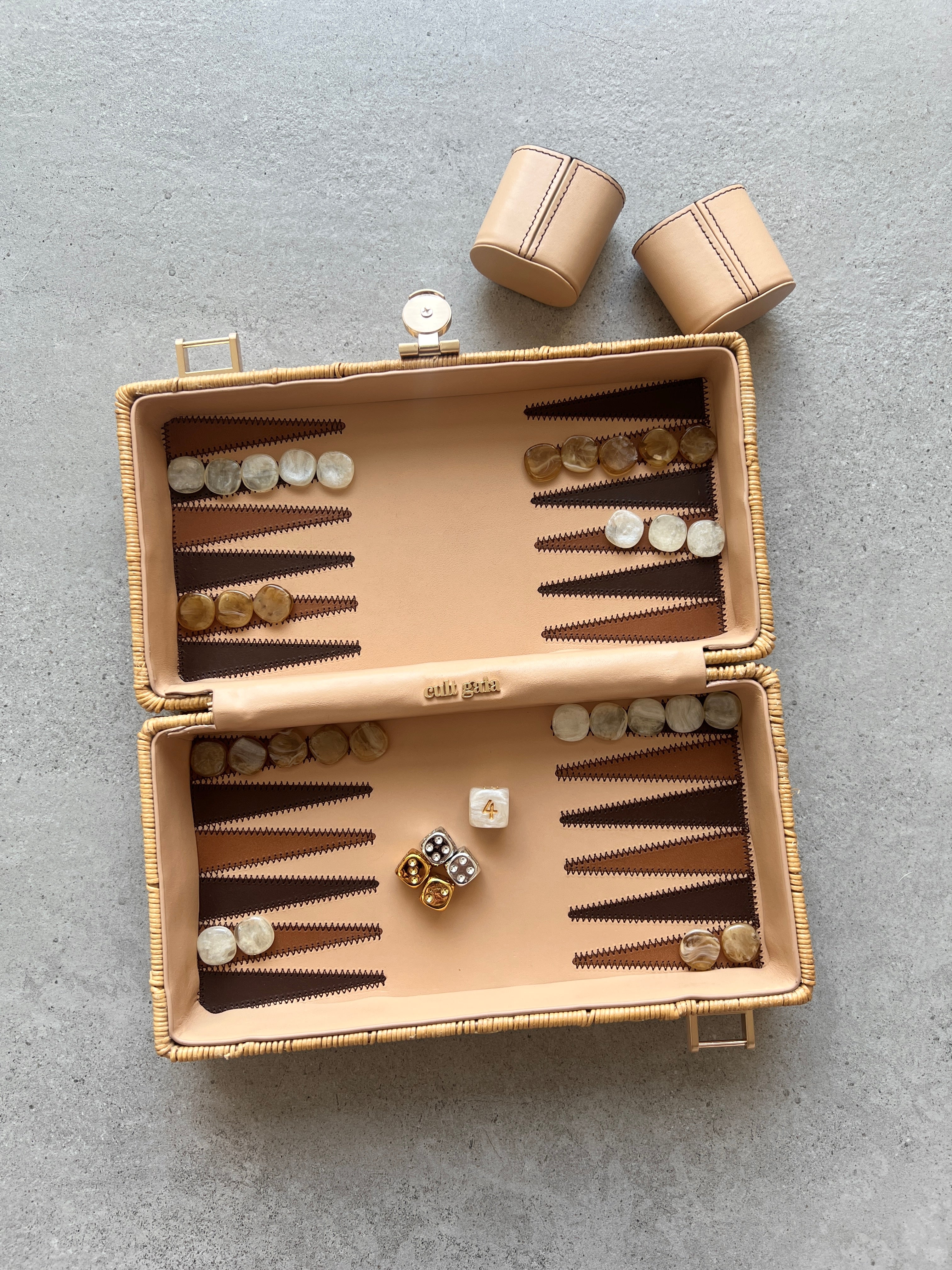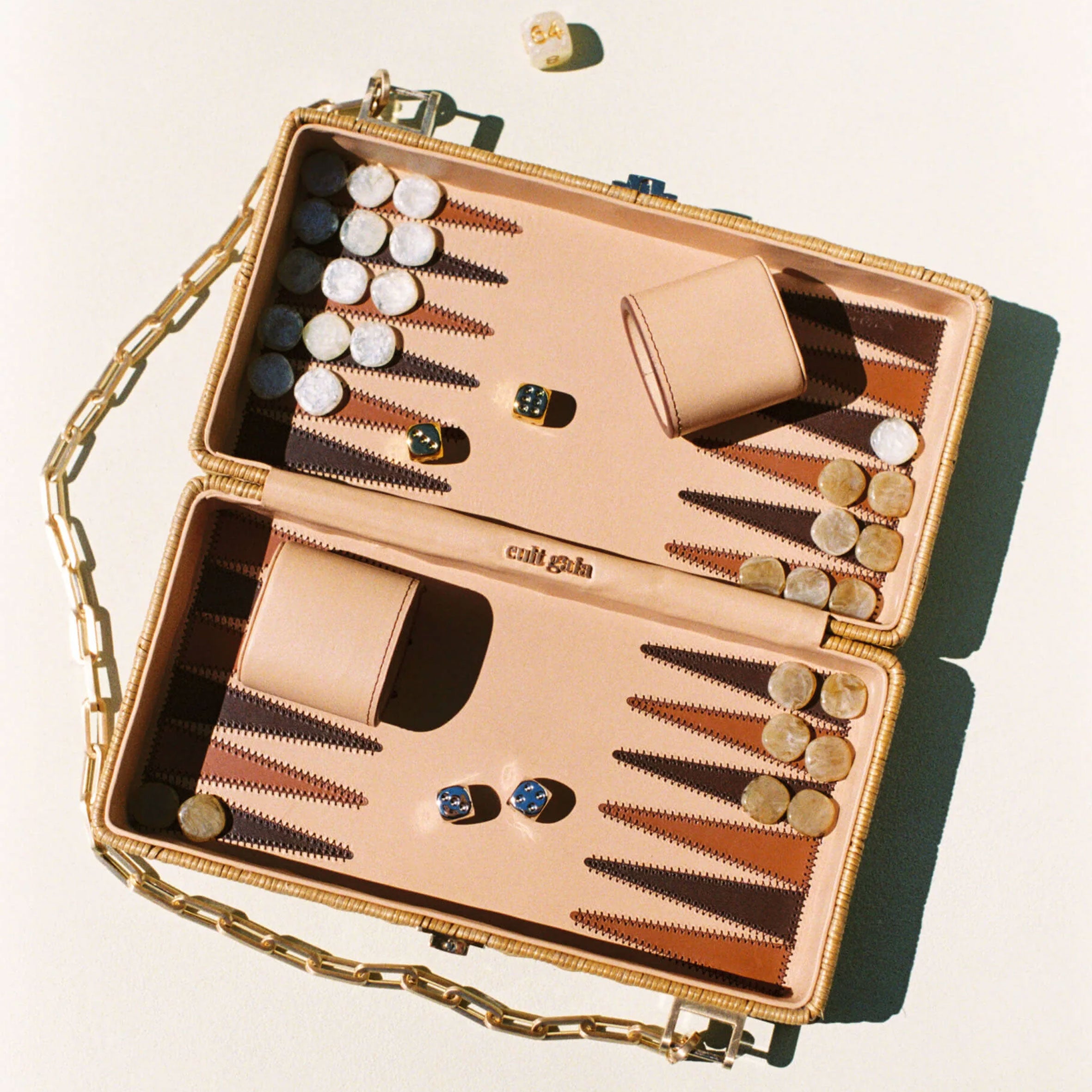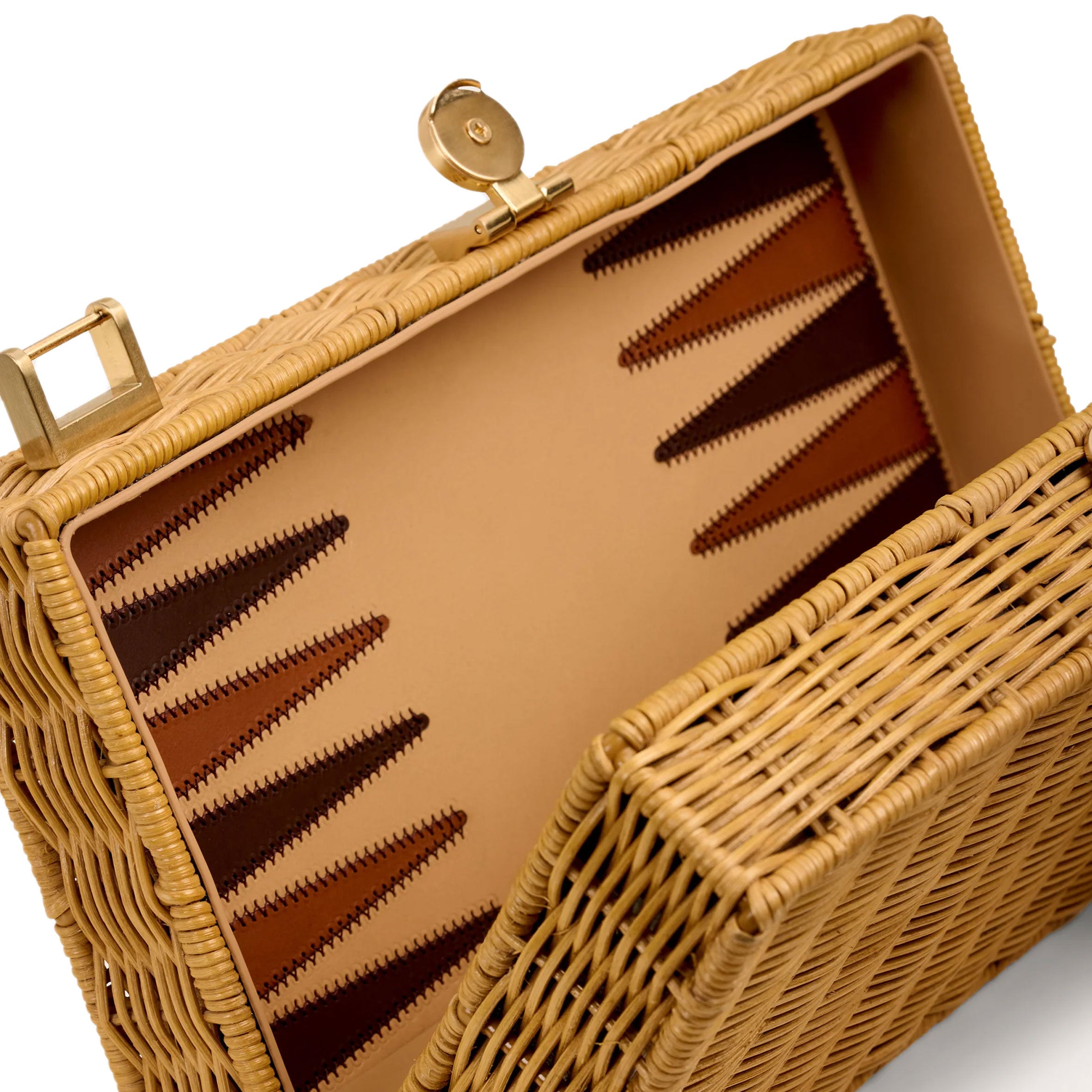 A whimsical rattan clutch that doubles as a portable game of backgammon when opened up.