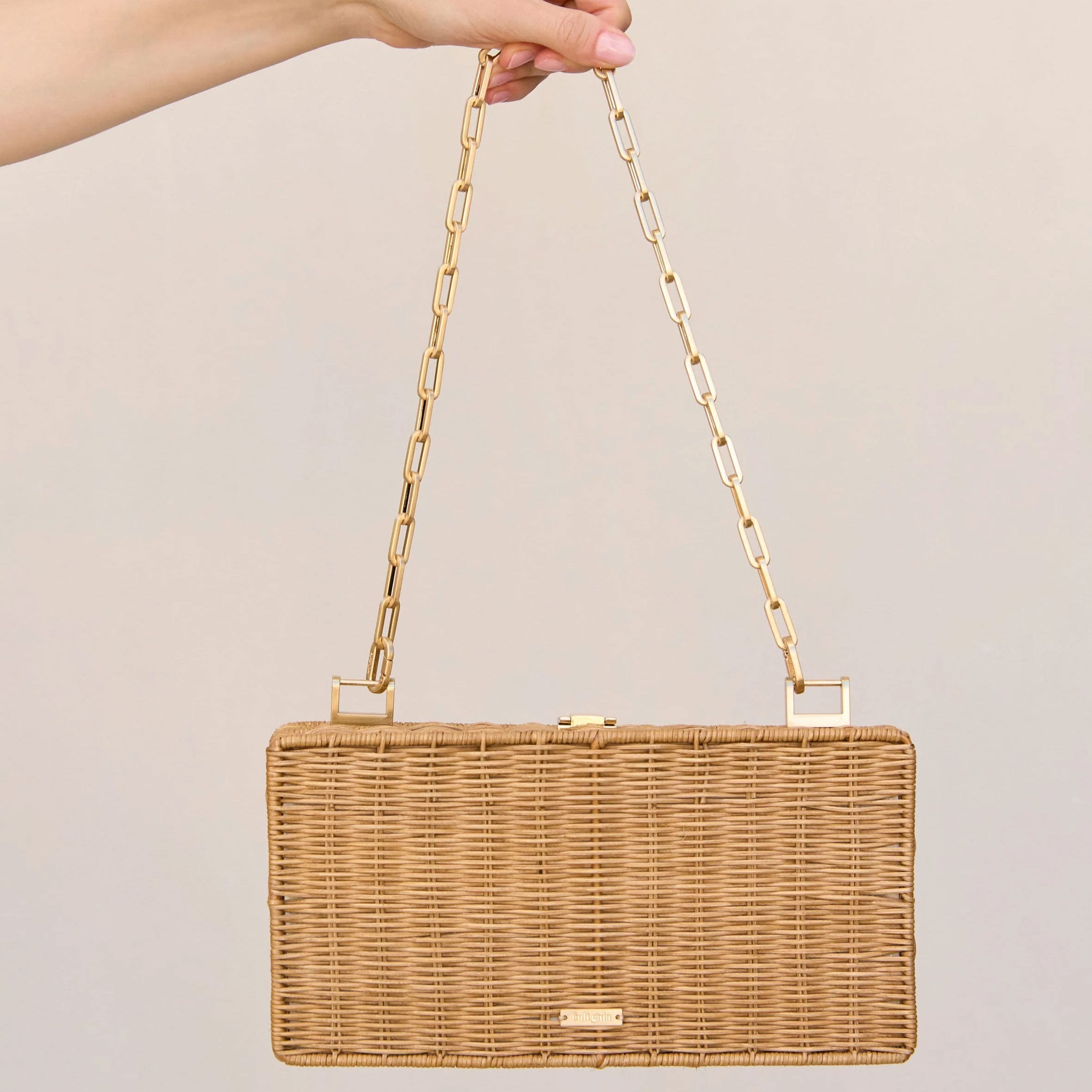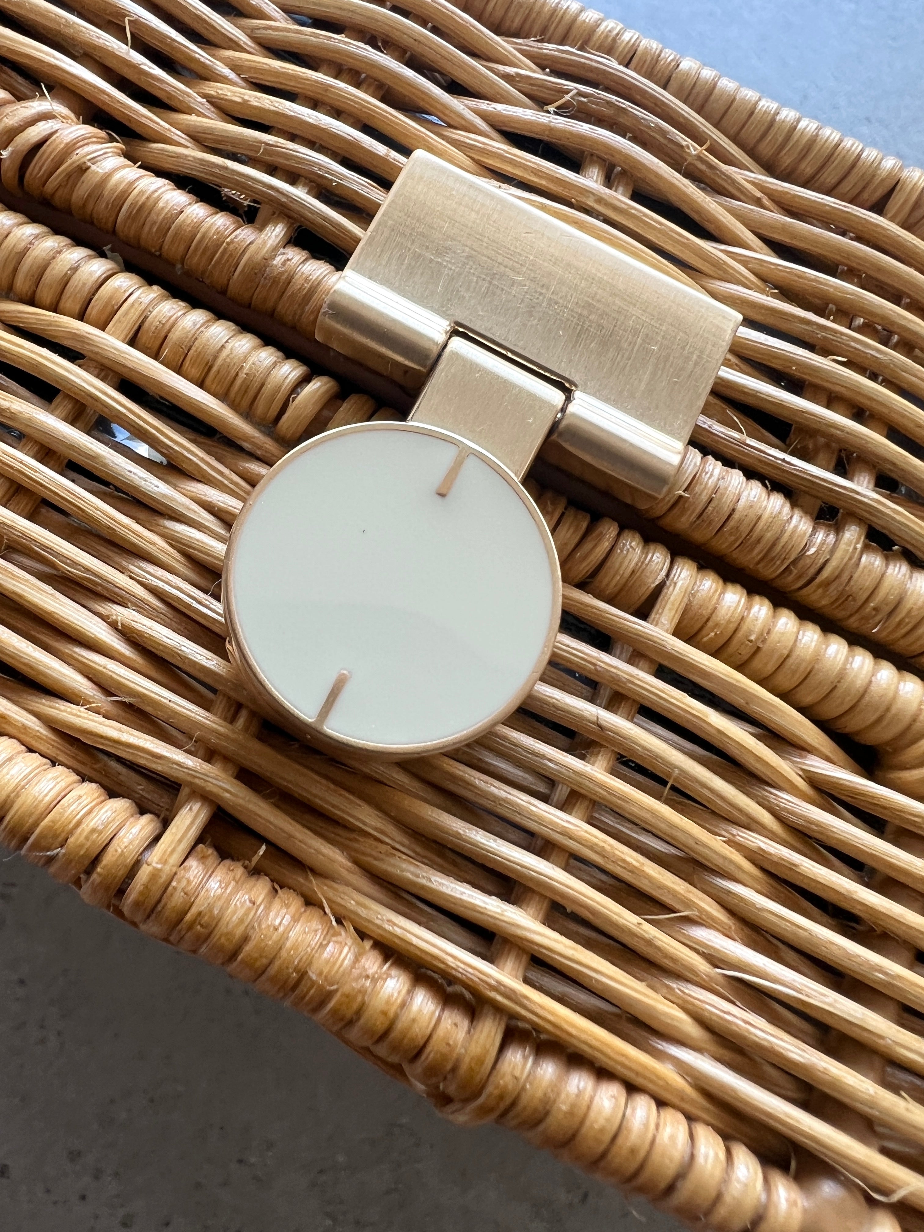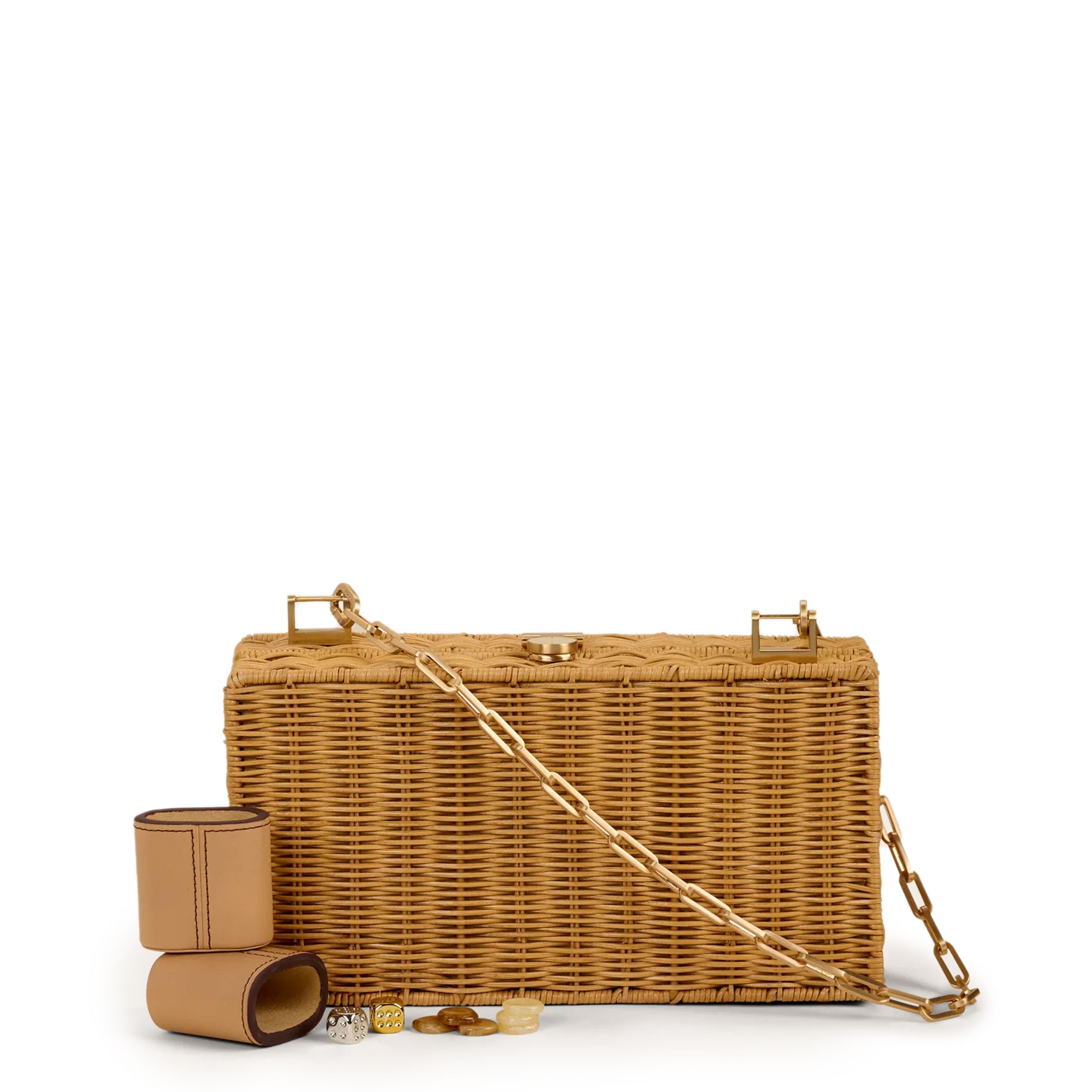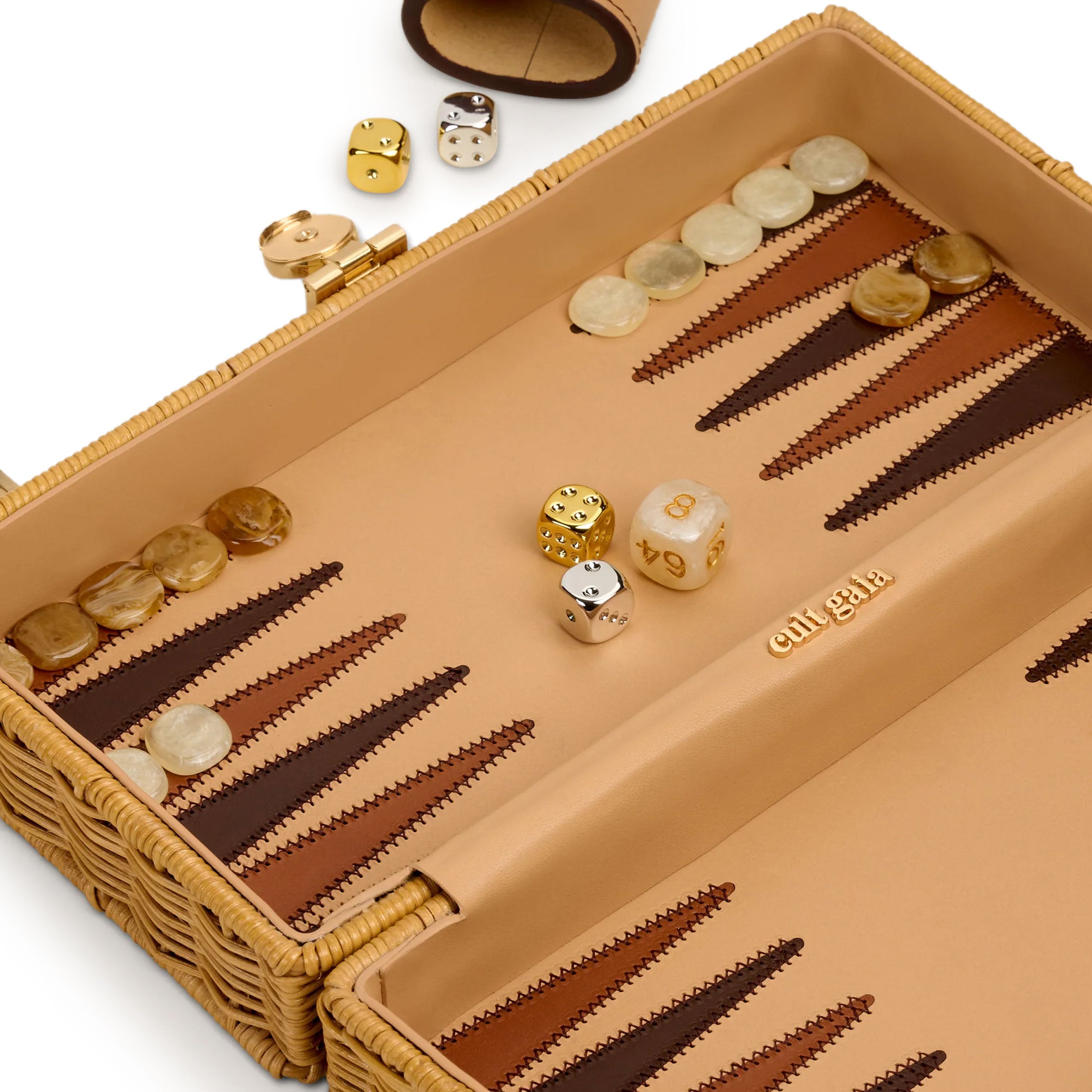 A whimsical rattan clutch that doubles as a portable game of backgammon when opened up.
