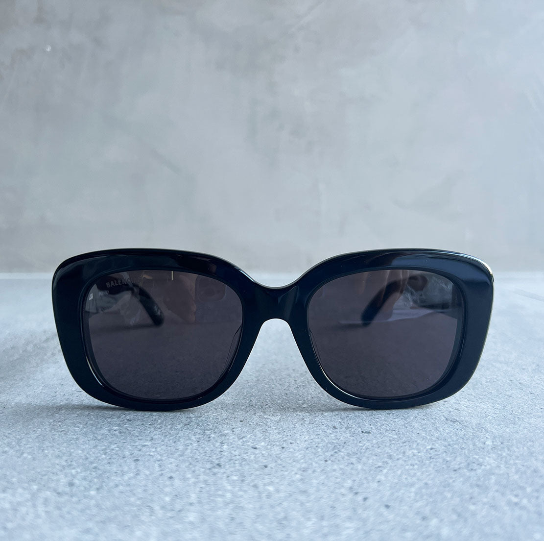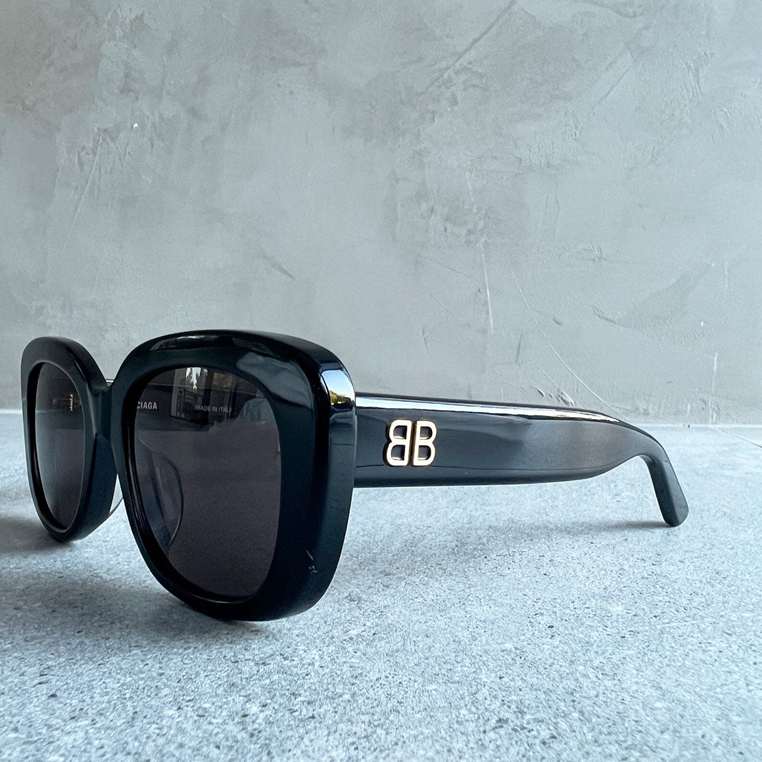 New BB Logo story, key signature for Balenciaga Eyewear. Squared Korean Fitting feminine shape featuring full acetate construction. BB Logo on both temples.