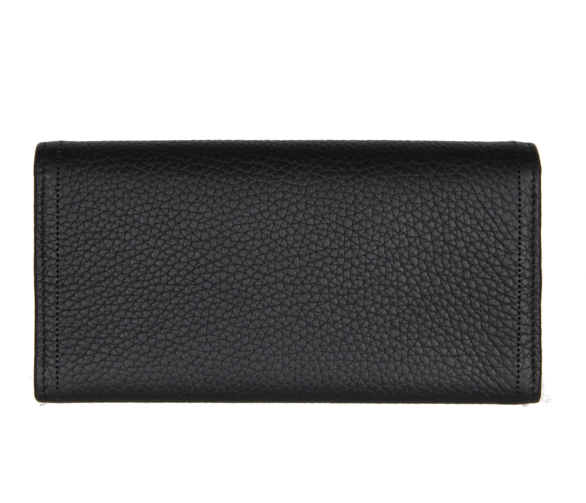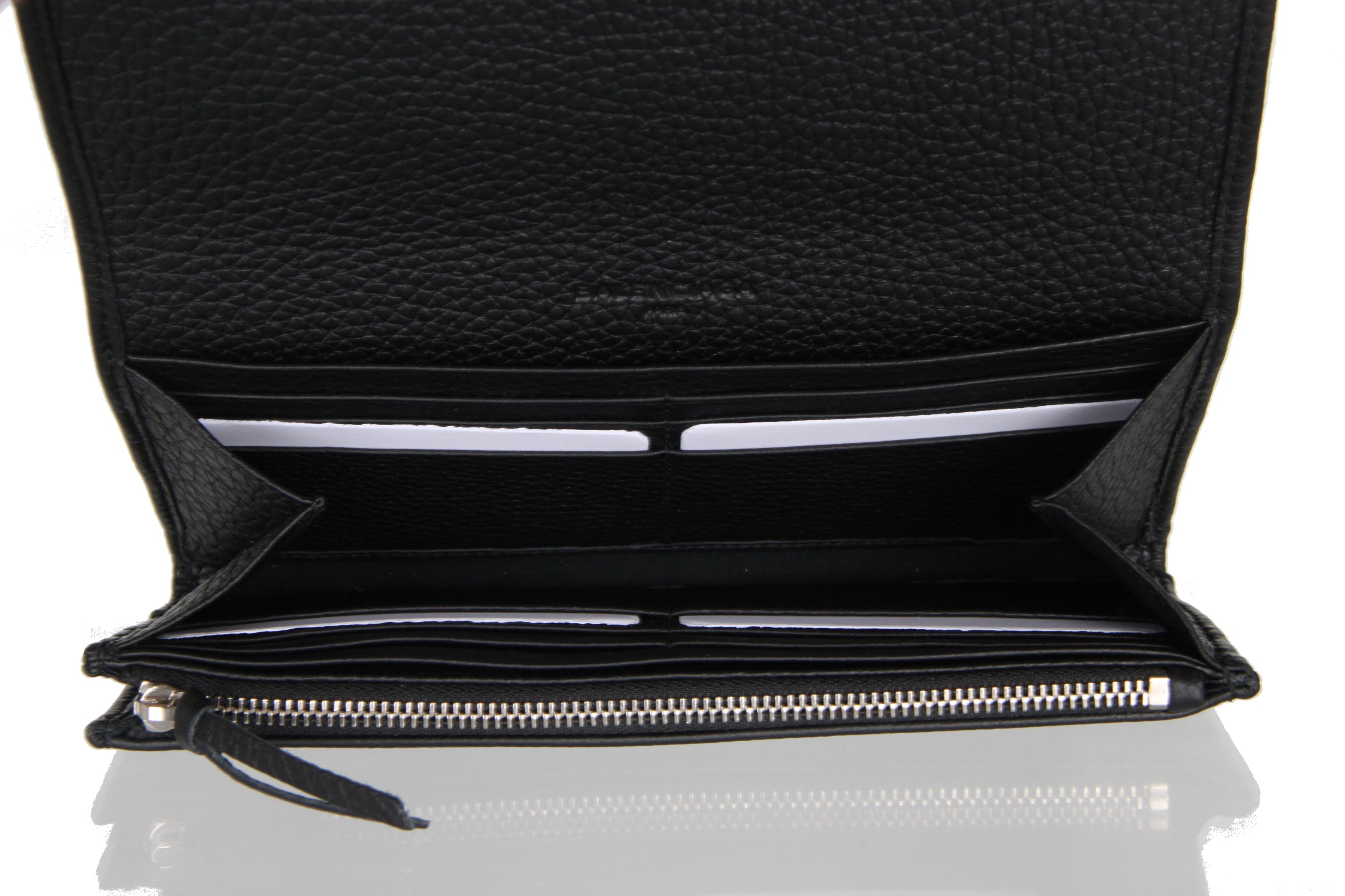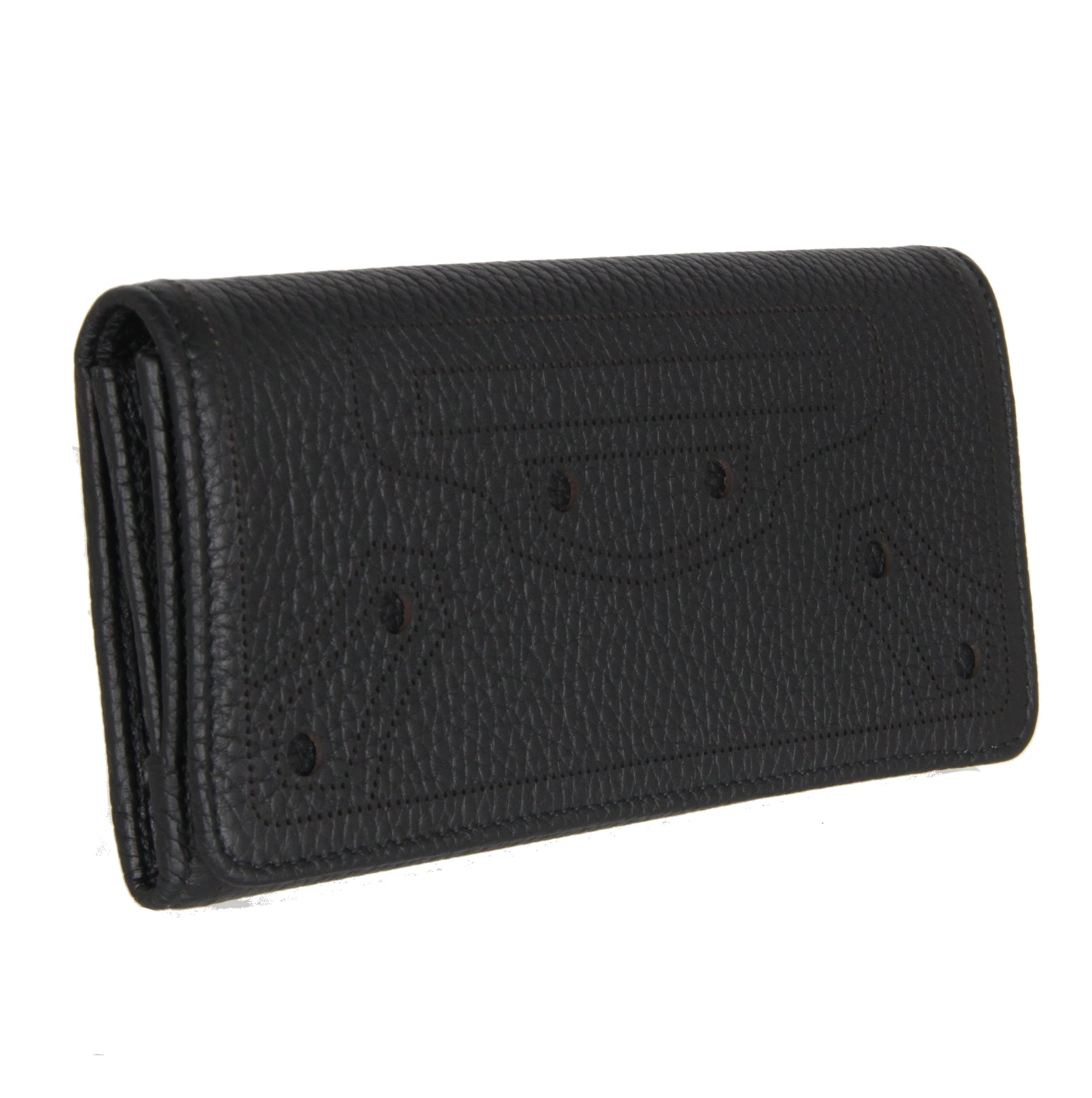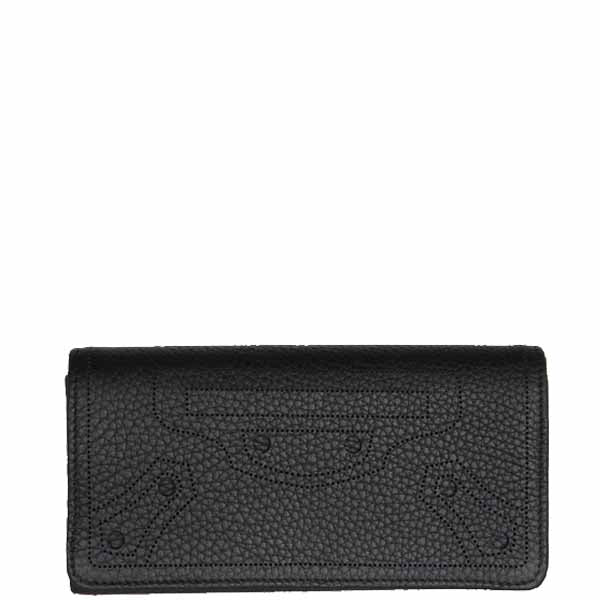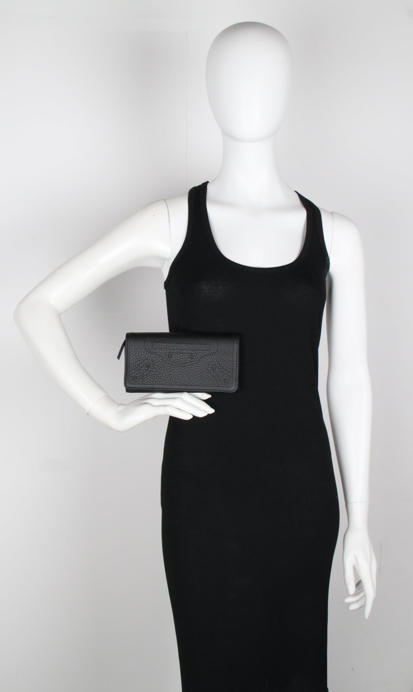 Balenciaga's Blackout money wallet is dot perforated in a motif of the house's signature hardware. Crafted in grained leather with zip-around closure. Leather zipper pull on coin pocket, 3 compartment gusseted interior and 12 card slots. Lined in black cotton canvas.