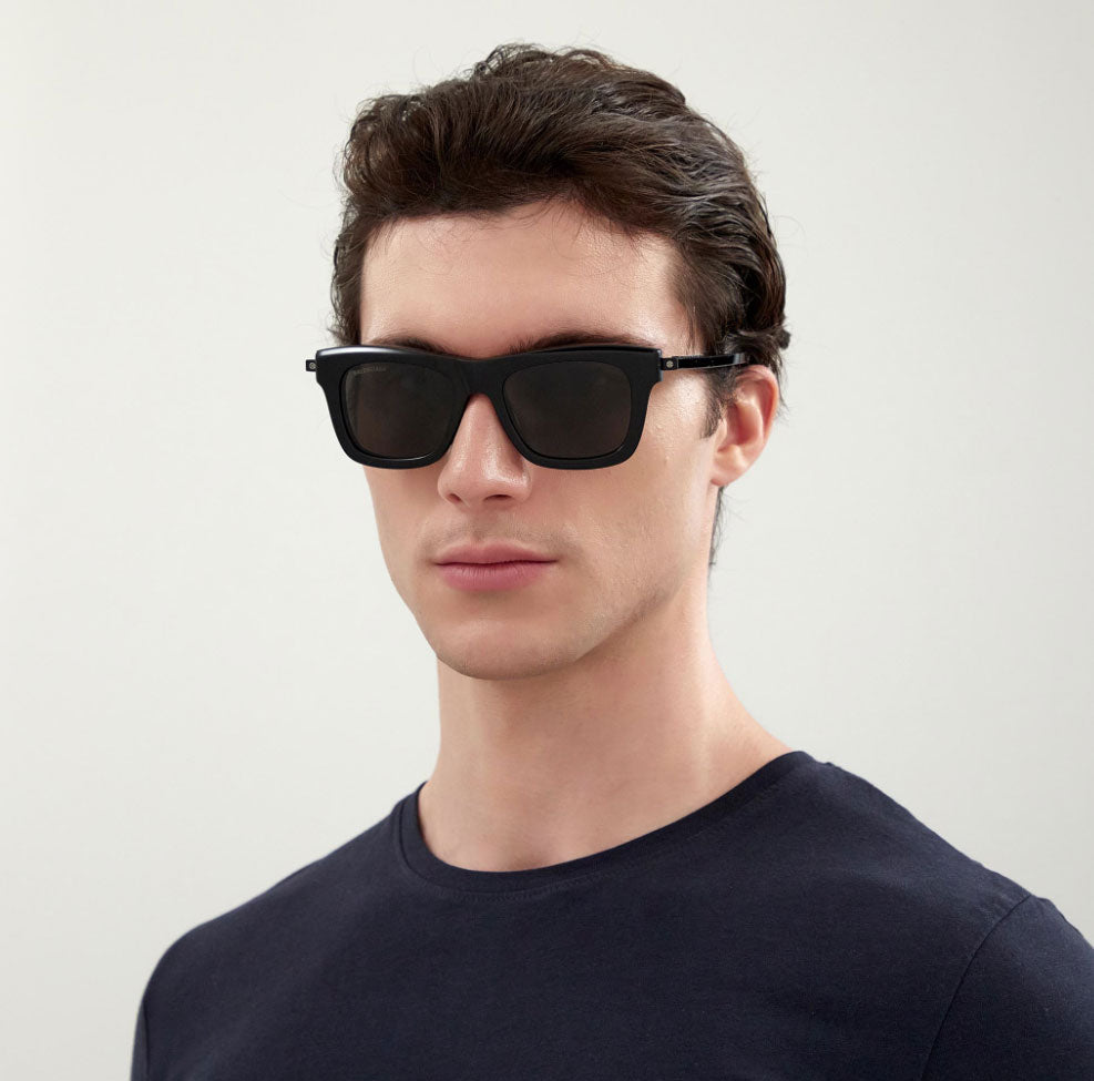 Balenciaga BB0161S sunglasses made with high density acetate frames, fitted with sleek grey lenses. Reverse Rectangle shape. Acetate front with injected temples. BALENCIAGA high relief logo on left temple with white padprinting. Iconic metal screws on temples front view.