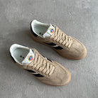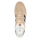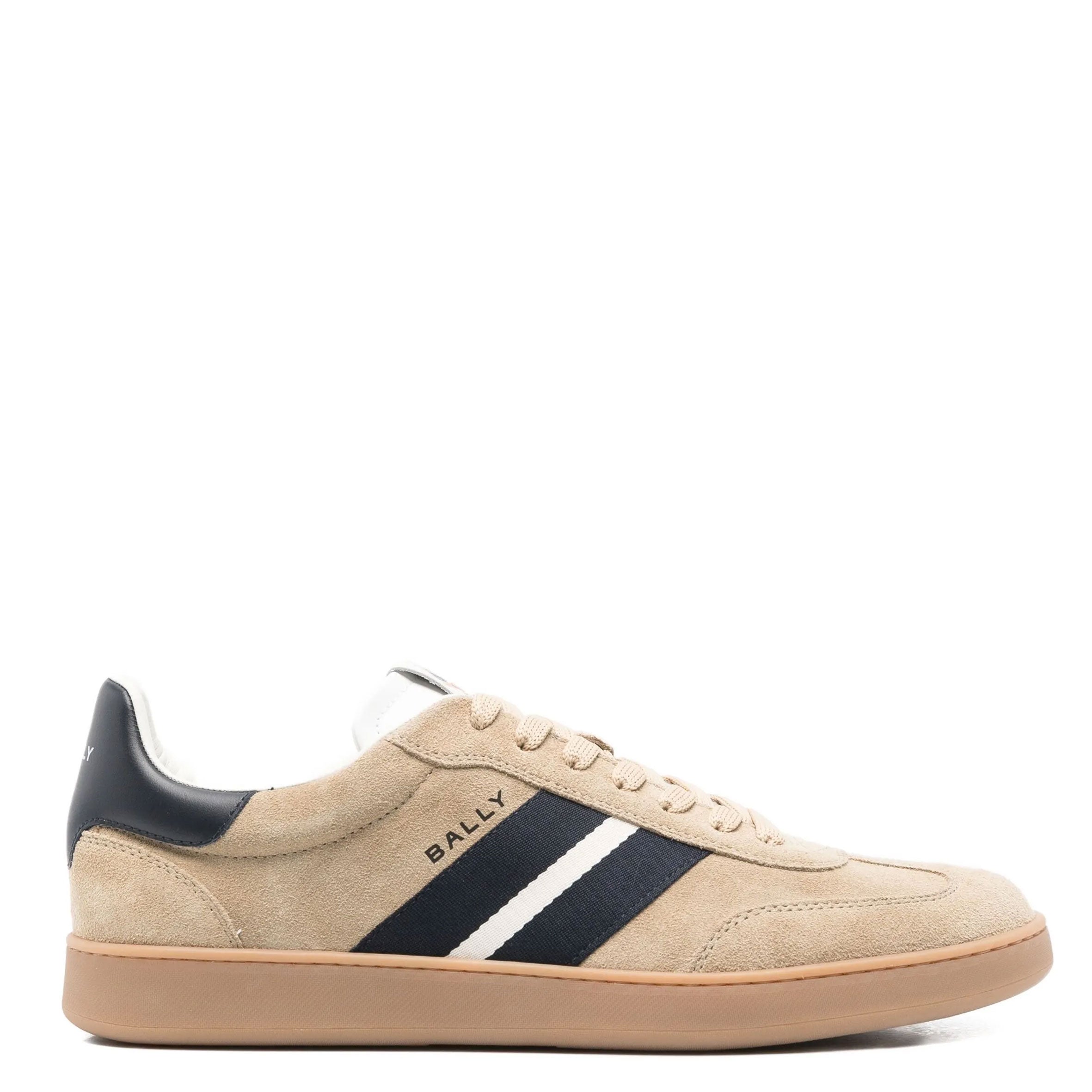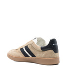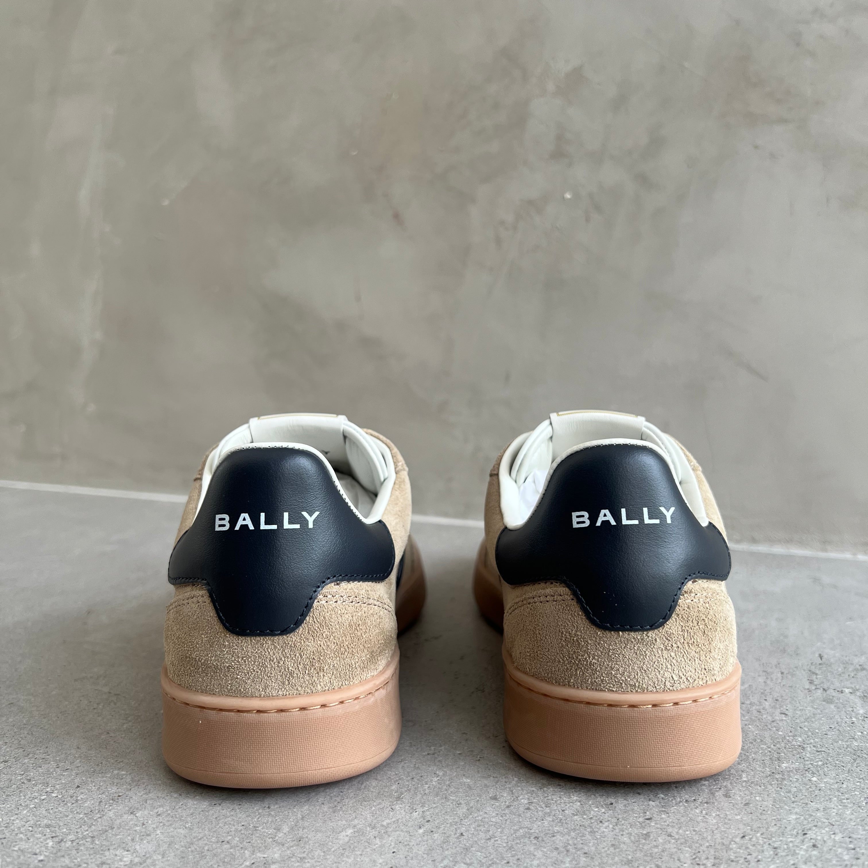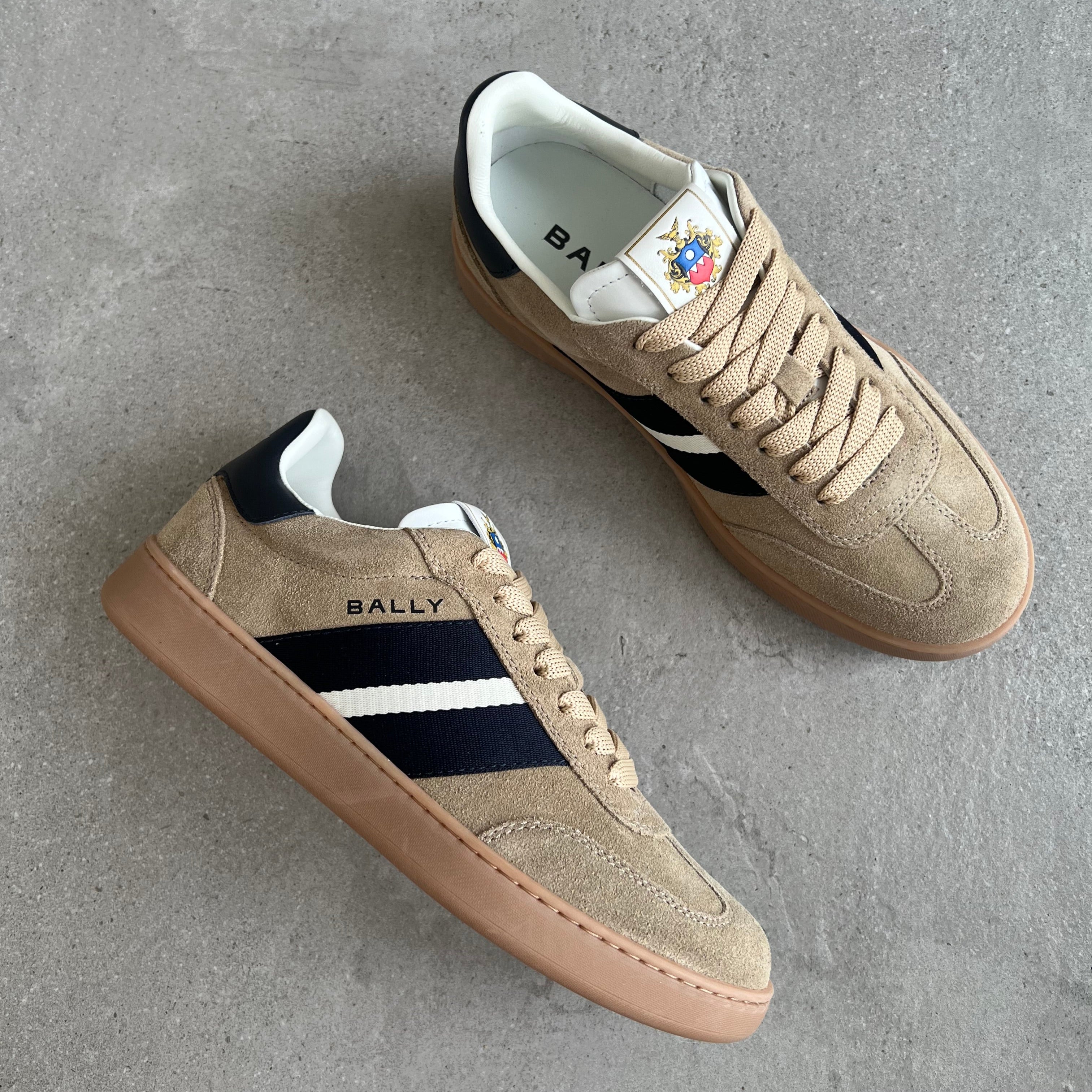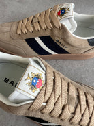 A grosgrain Bally Ribbon decorates the side of these retro crest sneaker in taupe suede with suede trim and a natural-hue rubber sole. On the tongue, a Bally Crest label in leather adds an iconic note to this lace-up style.