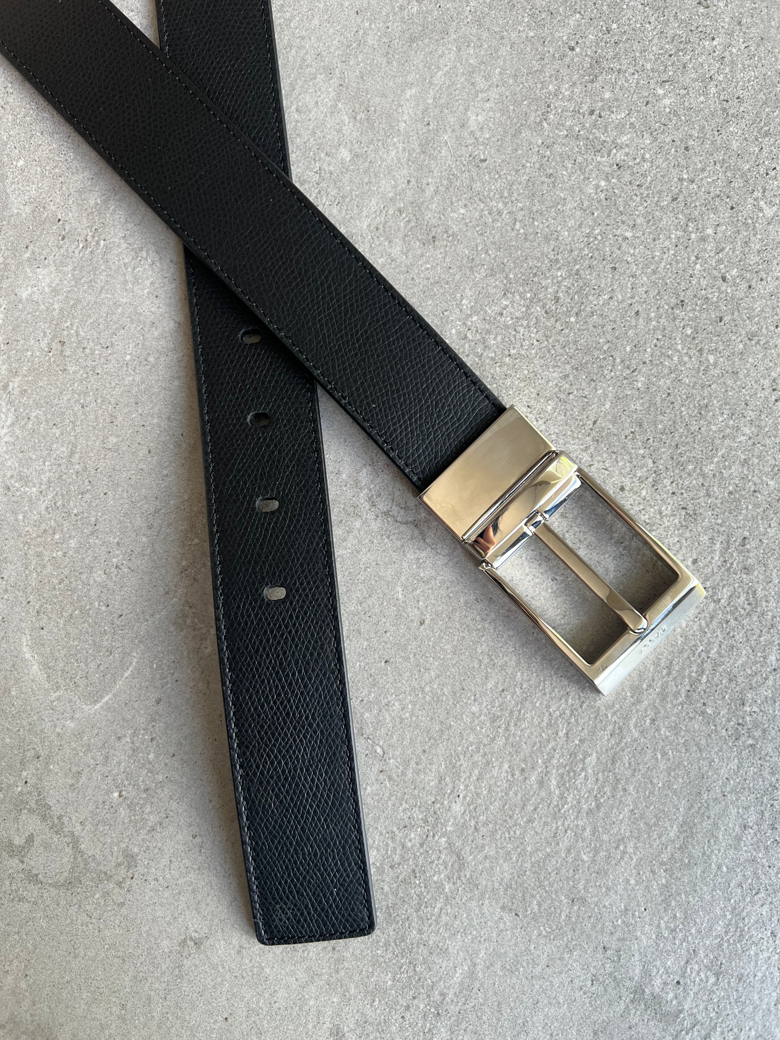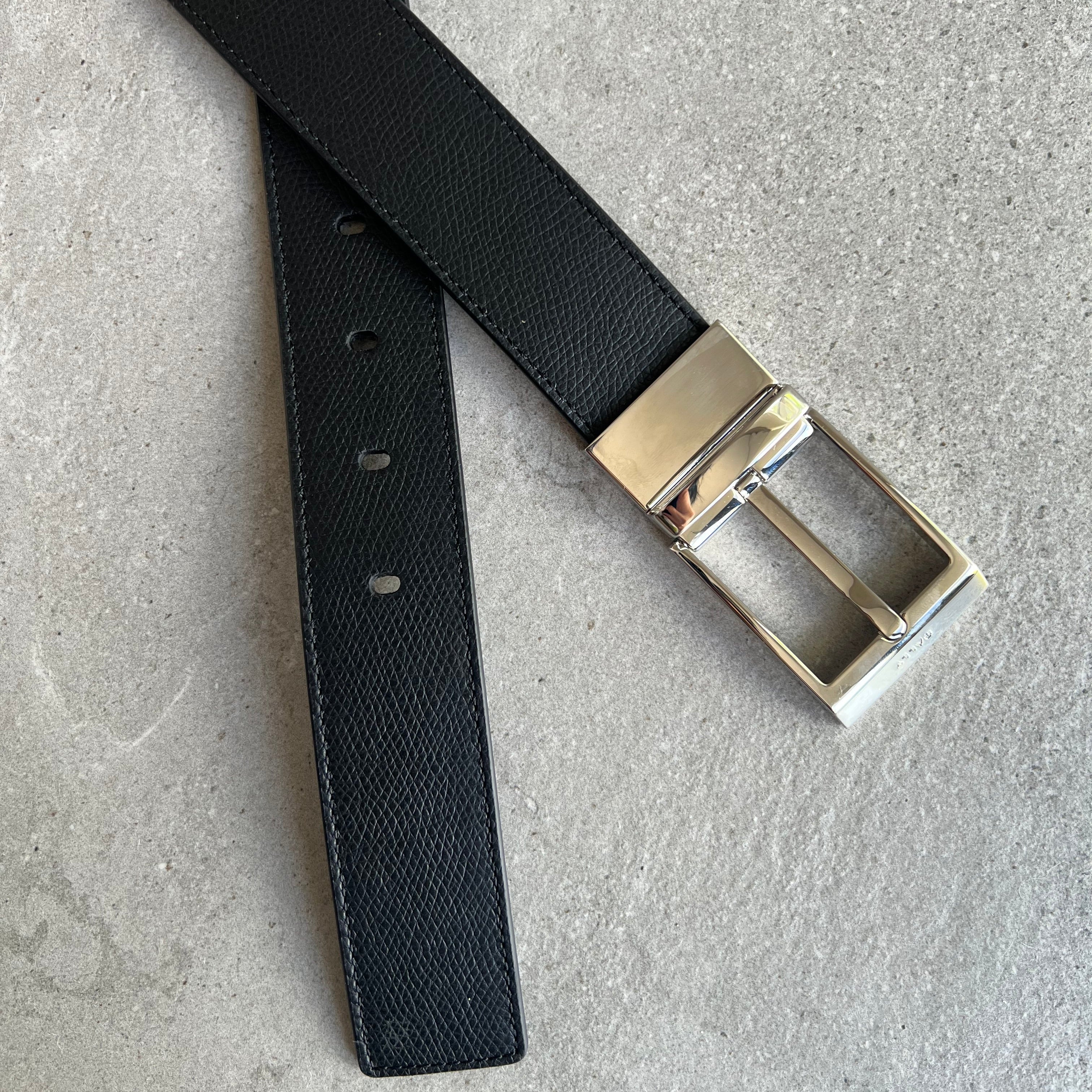 Adjustable and reversible, the Shiffie 35mm belt offers a choice of brown or black leather. The rectangular buckle at the front, in polished paladium-tone metal, is embellished by an essential debossed Bally logo. Black leather has a small grain finish on the leather and the Ebano brown side is a polish calf finish