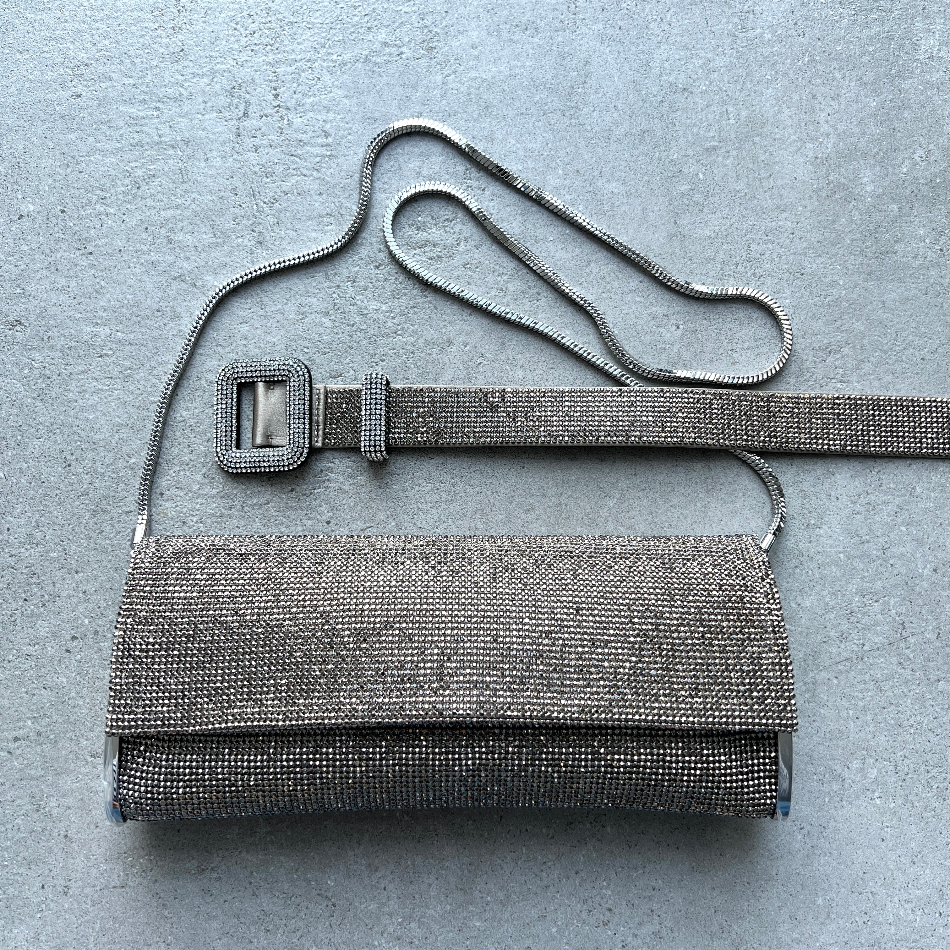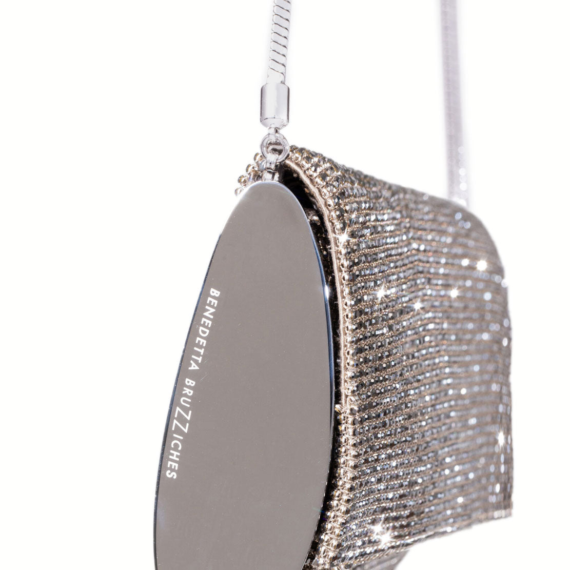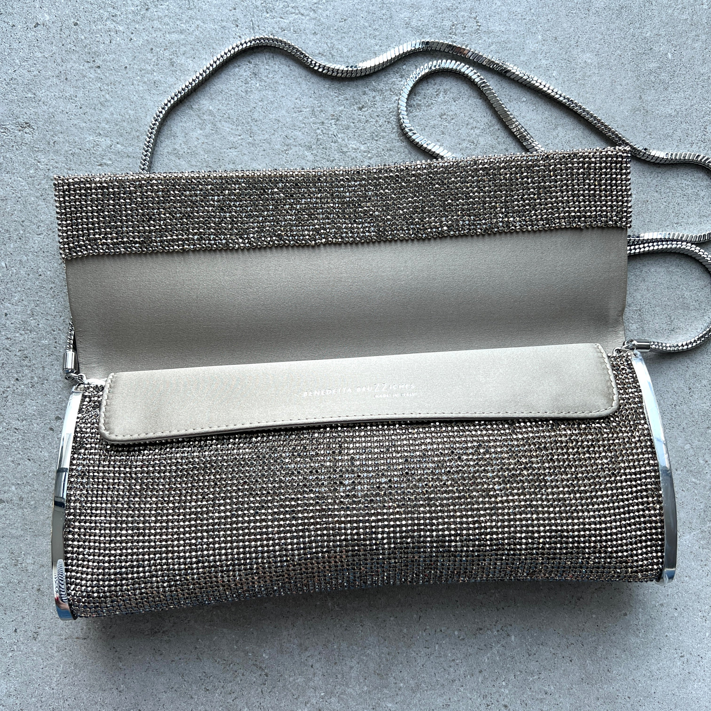 Adorned with two metal oval metal plates and made of pure silk satin and crystal mesh, the Kate feautures and adjustable shoulder strap that allows for versitile styling and can be worn over the shoulder or cross body in addition to being worn as a clutch bag.