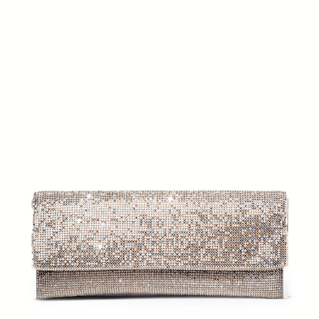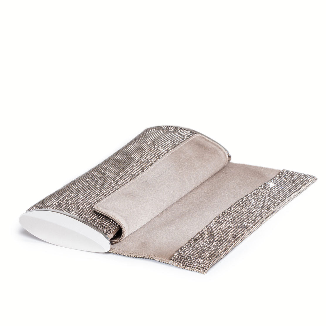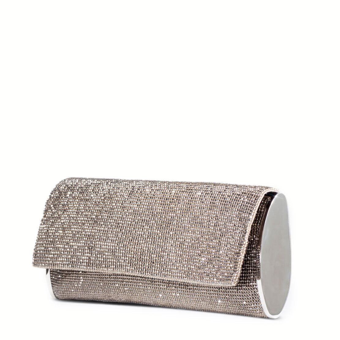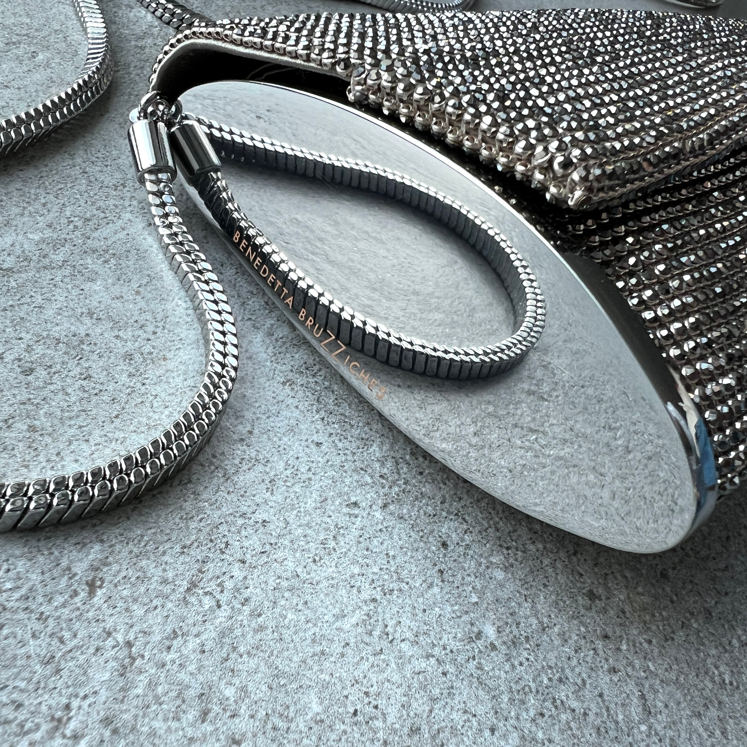 Adorned with two metal oval metal plates and made of pure silk satin and crystal mesh, the Kate feautures and adjustable shoulder strap that allows for versitile styling and can be worn over the shoulder or cross body in addition to being worn as a clutch bag.