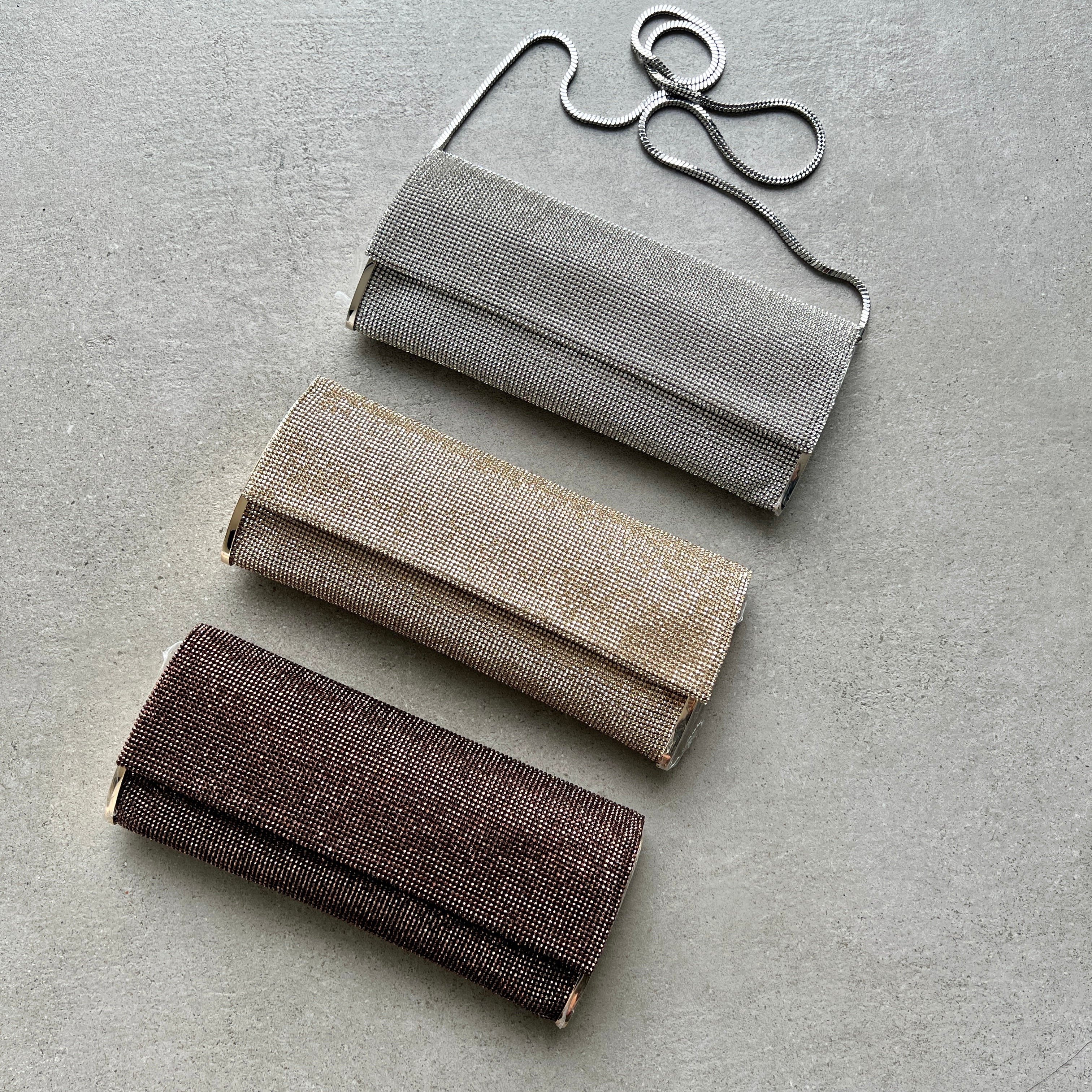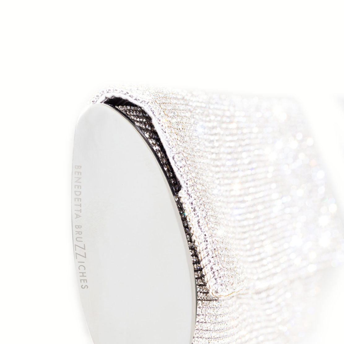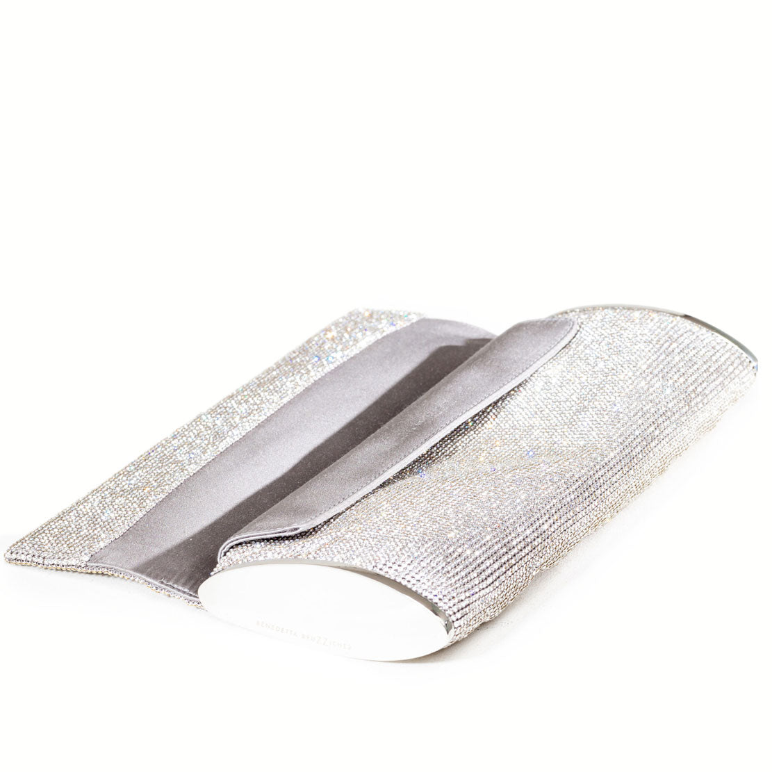 Adorned with two metal oval metal plates and made of pure silk satin and crystal mesh, the Kate features and adjustable shoulder strap that allows for versitile styling and can be worn over the shoulder or cross body in addition to being worn as a clutch bag.